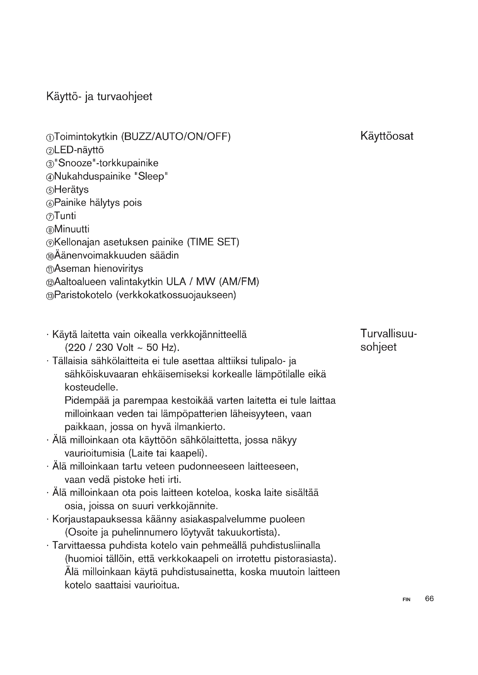 FIN Käyttöosat Turvallisuu- sohjeet Käyttö- ja turvaohjeet Manual_alle Sprachen 20.10.2003 15:01 Uhr Seite 66Liitä verkkokaapeli pistorasiaan (huomioi verkkojännite). Kytke radio päälle. Laita toimintokytkin asentoon "ON". Laita aaltoalueen kytkin haluttuun asentoon (ULA tai MW). Säädä äänenvoimakkuus äänenvoimakkuuden säätimellä. Valitse aseman hienosäädöllä haluamasi ULA- tai keskiaaltotaajuus . FM/ULA: Parasta ULA-vastaanottoa varten aseta ja suuntaa heittoantenni. AM/MW: Laite on varustettu hyvin herkällä ferriittiantennilla. Pidä painiketta AIKA ("TIME" tai TIME-SET) painettuna ja käytä samanaikaisesti painikkeita TUNTI ja MINUUTTI , kunnes todellinen aika ilmestyy näyttökenttään. Paina painiketta HERÄTYS ja TUNTI tai MINUUTTI saman- aikaisesti, kunnes haluttu herätysaika ilmestyy näyttökenttään. 1 Syötä ensin haluttu herätysaika kuten edellisessä kappaleessa kuvatiin. 2 Kun haluat herätettävän summerilla, aseta TOIMINTOKYTKIN asentoon BUZZ. Aktivoitu herätystoiminto esitetään näyttökentässä.