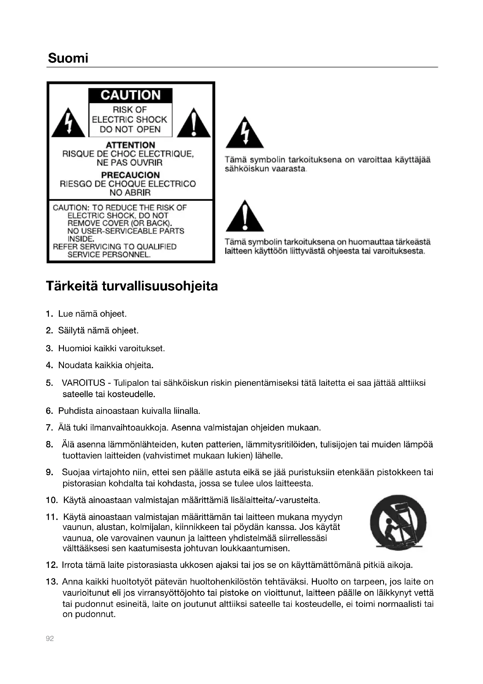15. Käytä tätä laitetta ainoastaan takapaneelin merkinnän mukaisella virtalähteellä. Jos käytät laitetta
