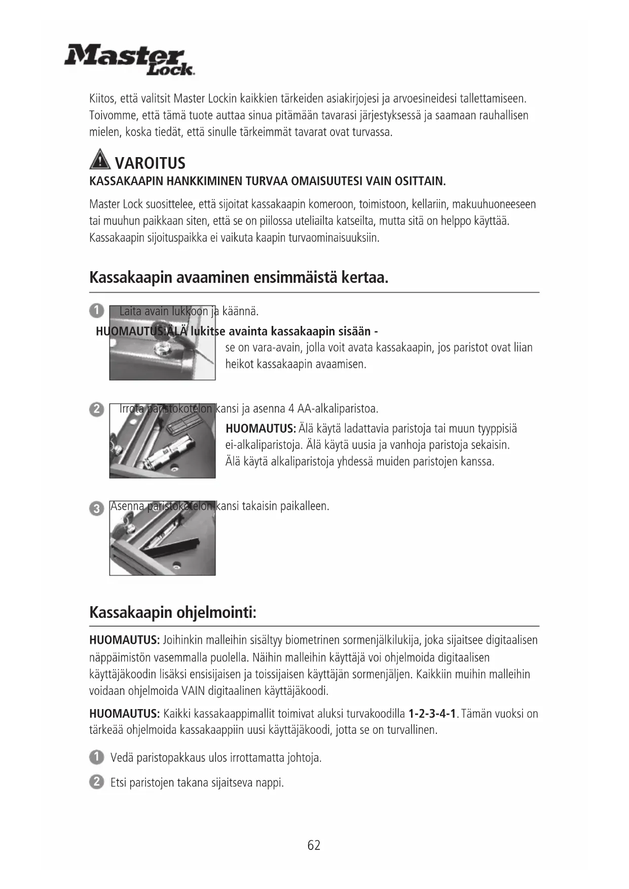Kiitos, että valitsit Master Lockin kaikkien tärkeiden asiakirjojesi ja arvoesineidesi tallettamiseen. Toivomme, että tämä tuote auttaa sinua pitämään tavarasi järjestyksessä ja saamaan rauhallisen mielen, koska tiedät, että sinulle tärkeimmät tavarat ovat turvassa.