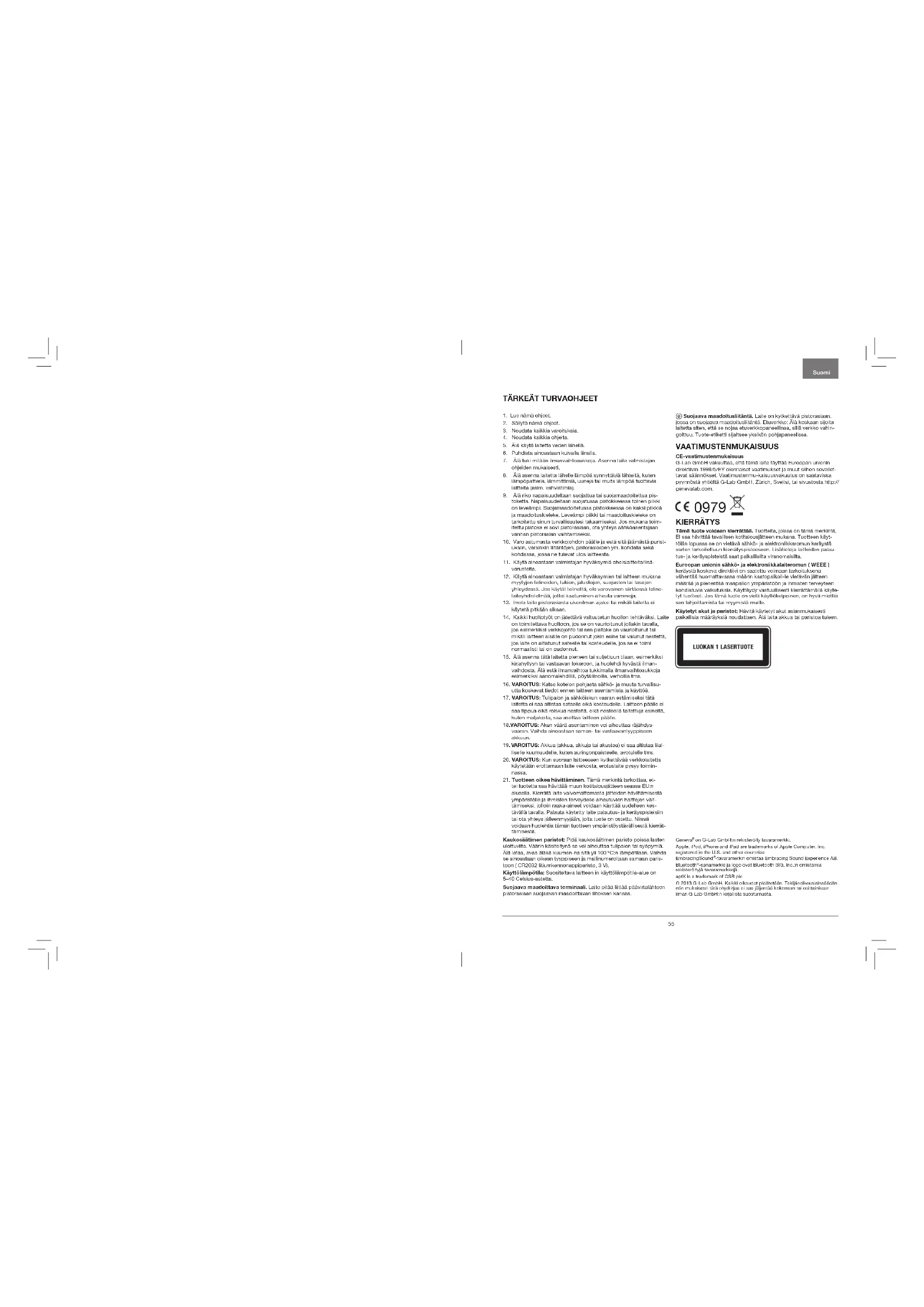 KIERRÄTYS Tämä tuote voidaan kierrättää. Tuotteita, joissa on tämä merkintä, EI saa hävittää tavallisen kotitalousjätteen mukana. Tuotteen käyt-töiän lopussa se on vietävä sähkö- ja elektroniikkaromun keräystä varten tarkoitettuun kierrätyspisteeseen. Lisätietoja laitteiden palau-tus- ja keräyspisteistä saat paikallisilta viranomaisilta.Euroopan unionin sähkö- ja elektroniikkalaiteromun ( WEEE ) keräystä koskeva direktiivi on saatettu voimaan tarkoituksena vähentää huomattavassa määrin kaatopaikoil-le vietävän jätteen määrää ja pienentää maapallon ympäristöön ja ihmisten terveyteen kohdistuvia vaikutuksia. Käyttäydy vastuullisesti kierrättämällä käyte-tyt tuotteet. Jos tämä tuote on vielä käyttökelpoinen, on hyvä miettiä sen lahjoittamista tai myymistä muille.Käytetyt akut ja paristot: Hävitä käytetyt akut asianmukaisesti paikallisia määräyksiä noudattaen. Älä laita akkua tai paristoa tuleen.Geneva on G-Lab GmbH:n rekisteröity tavaramerkki.Apple, iPod, iPhone and iPad are trademarks of Apple Computer, Inc. registered in the U.S. and other countriesEmbracingSound -tavaramerkin omistaa Embracing Sound Experience AB.Bluetooth -sanamerkki ja logo ovat Bluetooth SIG, Inc.:n omistamia rekisteröityjä tavaramerkkejä. aptX is a trademark of CSR plc© 2013 G-Lab GmbH. Kaikki oikeudet pidätetään. Tekijänoikeuslainsäädän-nön mukaisesti tätä ohjekirjaa ei saa jäljentää kokonaan tai osittainkaan ilman G-Lab GmbH:n kirjallista suostumusta. TÄRkEÄT TURVAOhJEET Suomi56 57