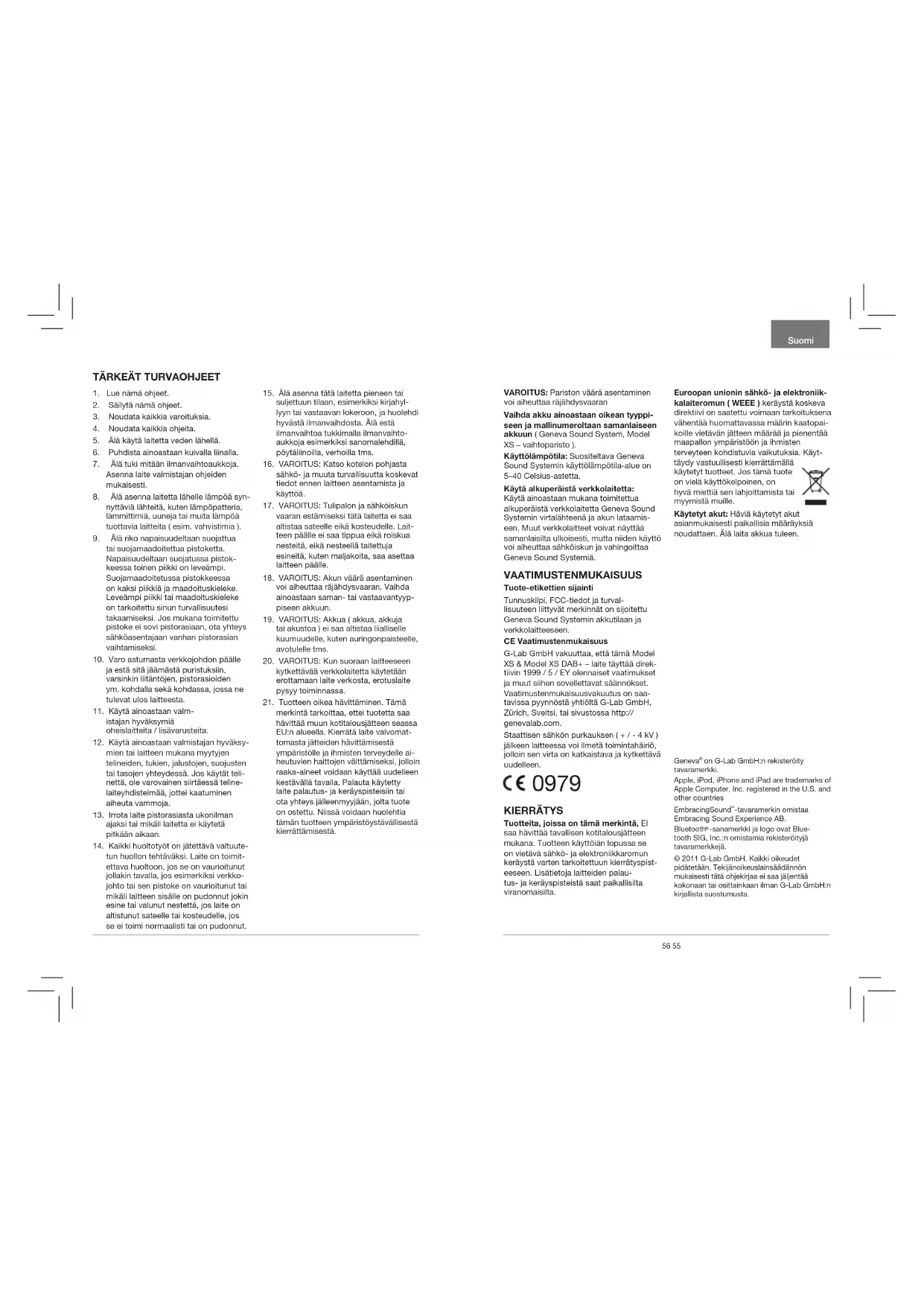 keräystä koskeva direktiivi on saatettu voimaan tarkoituksena vähentää huomattavassa määrin kaatopai- koille vietävän jätteen määrää ja pienentää maapallon ympäristöön ja ihmisten terveyteen kohdistuvia vaikutuksia. Käyt- täydy vastuullisesti kierrättämällä käytetyt tuotteet. Jos tämä tuote on vielä käyttökelpoinen, on hyvä miettiä sen lahjoittamista tai myymistä muille. Häviä käytetyt akut asianmukaisesti paikallisia määräyksiä noudattaen. Älä laita akkua tuleen. Geneva on G-Lab GmbH:n rekisteröity tavaramerkki.Apple, iPod, iPhone and iPad are trademarks of Apple Computer, Inc. registered in the U.S. and other countriesEmbracingSound -tavaramerkin omistaa Embracing Sound Experience AB.Bluetooth -sanamerkki ja logo ovat Blue-tooth SIG, Inc.:n omistamia rekisteröityjä tavaramerkkejä. © 2011 G-Lab GmbH. Kaikki oikeudet pidätetään. Tekijänoikeuslainsäädännön mukaisesti tätä ohjekirjaa ei saa jäljentää kokonaan tai osittainkaan ilman G-Lab GmbH:n kirjallista suostumusta. 1. Lue nämä ohjeet. 2. Säilytä nämä ohjeet. 3. Noudata kaikkia varoituksia. 4. Noudata kaikkia ohjeita. 5. Älä käytä laitetta veden lähellä. 6. Puhdista ainoastaan kuivalla liinalla. 7. Älä tuki mitään ilmanvaihtoaukkoja. Asenna laite valmistajan ohjeiden mukaisesti. 8. Älä asenna laitetta lähelle lämpöä syn- nyttäviä lähteitä, kuten lämpöpatteria, lämmittimiä, uuneja tai muita lämpöä tuottavia laitteita ( esim. vahvistimia ). 9. Älä riko napaisuudeltaan suojattua tai suojamaadoitettua pistoketta. Napaisuudeltaan suojatussa pistok- keessa toinen piikki on leveämpi. Suojamaadoitetussa pistokkeessa on kaksi piikkiä ja maadoituskieleke. Leveämpi piikki tai maadoituskieleke on tarkoitettu sinun turvallisuutesi takaamiseksi. Jos mukana toimitettu pistoke ei sovi pistorasiaan, ota yhteys sähköasentajaan vanhan pistorasian vaihtamiseksi. 10. Varo astumasta verkkojohdon päälle ja estä sitä jäämästä puristuksiin, varsinkin liitäntöjen, pistorasioiden ym. kohdalla sekä kohdassa, jossa ne tulevat ulos laitteesta. 11. Käytä ainoastaan valm- istajan hyväksymiä oheislaitteita / lisävarusteita. 12. Käytä ainoastaan valmistajan hyväksy- mien tai laitteen mukana myytyjen telineiden, tukien, jalustojen, suojusten tai tasojen yhteydessä. Jos käytät teli- nettä, ole varovainen siirtäessä teline- laiteyhdistelmää, jottei kaatuminen aiheuta vammoja. 13. Irrota laite pistorasiasta ukonilman ajaksi tai mikäli laitetta ei käytetä pitkään aikaan. 14. Kaikki huoltotyöt on jätettävä valtuute- tun huollon tehtäväksi. Laite on toimit- ettava huoltoon, jos se on vaurioitunut jollakin tavalla, jos esimerkiksi verkko- johto tai sen pistoke on vaurioitunut tai mikäli laitteen sisälle on pudonnut jokin esine tai valunut nestettä, jos laite on altistunut sateelle tai kosteudelle, jos se ei toimi normaalisti tai on pudonnut. 15. Älä asenna tätä laitetta pieneen tai suljettuun tilaan, esimerkiksi kirjahyl- lyyn tai vastaavan lokeroon, ja huolehdi hyvästä ilmanvaihdosta. Älä estä ilmanvaihtoa tukkimalla ilmanvaihto- aukkoja esimerkiksi sanomalehdillä, pöytäliinoilla, verhoilla tms. 16. VAROITUS: Katso kotelon pohjasta sähkö- ja muuta turvallisuutta koskevat tiedot ennen laitteen asentamista ja käyttöä. 17. VAROITUS: Tulipalon ja sähköiskun vaaran estämiseksi tätä laitetta ei saa altistaa sateelle eikä kosteudelle. Lait- teen päälle ei saa tippua eikä roiskua nesteitä, eikä nesteellä taitettuja esineitä, kuten maljakoita, saa asettaa laitteen päälle. 18. VAROITUS: Akun väärä asentaminen voi aiheuttaa räjähdysvaaran. Vaihda ainoastaan saman- tai vastaavantyyp- piseen akkuun. 19. VAROITUS: Akkua ( akkua, akkuja tai akustoa ) ei saa altistaa liialliselle kuumuudelle, kuten auringonpaisteelle, avotulelle tms. 20. VAROITUS: Kun suoraan laitteeseen kytkettävää verkkolaitetta käytetään erottamaan laite verkosta, erotuslaite pysyy toiminnassa. 21. Tuotteen oikea hävittäminen. Tämä merkintä tarkoittaa, ettei tuotetta saa hävittää muun kotitalousjätteen seassa EU:n alueella. Kierrätä laite valvomat- tomasta jätteiden hävittämisestä ympäristölle ja ihmisten terveydelle ai- heutuvien haittojen välttämiseksi, jolloin raaka-aineet voidaan käyttää uudelleen kestävällä tavalla. Palauta käytetty laite palautus- ja keräyspisteisiin tai ota yhteys jälleenmyyjään, jolta tuote on ostettu. Niissä voidaan huolehtia tämän tuotteen ympäristöystävällisestä kierrättämisestä. Suomi 58 57