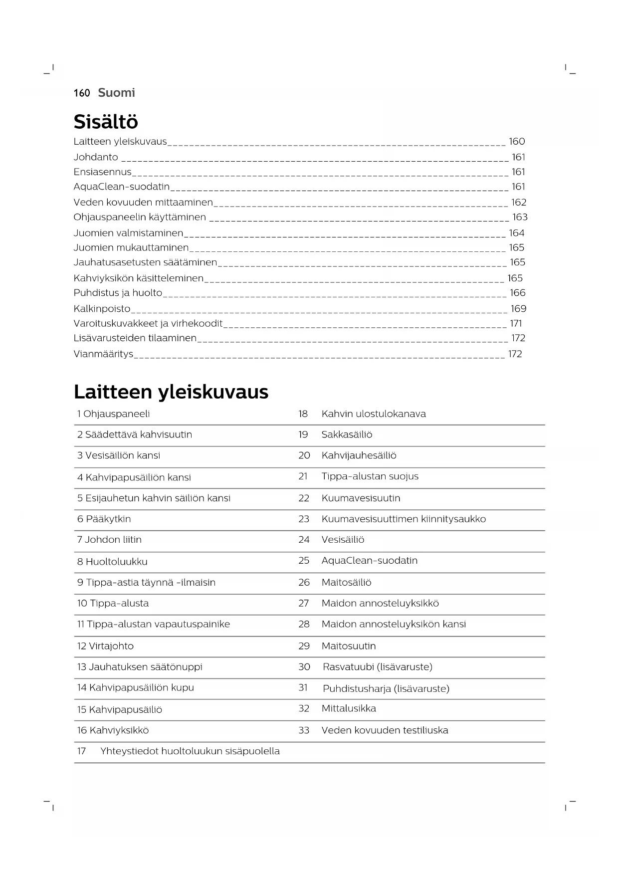 PortuguêsSisältö Laitteen yleiskuvaus______________________________________________________________ 160 Johdanto _______________________________________________________________________ 161 Ensiasennus_____________________________________________________________________ 161 AquaClean-suodatin______________________________________________________________ 161 Veden kovuuden mittaaminen______________________________________________________ 162 Ohjauspaneelin käyttäminen _______________________________________________________ 163 Juomien valmistaminen___________________________________________________________ 164 Juomien mukauttaminen__________________________________________________________ 165 Jauhatusasetusten säätäminen_____________________________________________________ 165 Kahviyksikön käsitteleminen_______________________________________________________ 165 Puhdistus ja huolto_______________________________________________________________ 166 Kalkinpoisto_____________________________________________________________________ 169 Varoituskuvakkeet ja virhekoodit____________________________________________________ 171 Lisävarusteiden tilaaminen_________________________________________________________ 172 Vianmääritys____________________________________________________________________ 172 Laitteen yleiskuvaus 1 Ohjauspaneeli 2 Säädettävä kahvisuutin 3 Vesisäiliön kansi 4 Kahvipapusäiliön kansi 5 Esijauhetun kahvin säiliön kansi 6 Pääkytkin 7 Johdon liitin 8 Huoltoluukku 9 Tippa-astia täynnä -ilmaisin 10 Tippa-alusta 11 Tippa-alustan vapautuspainike 12 Virtajohto 13 Jauhatuksen säätönuppi 14 Kahvipapusäiliön kupu 15 Kahvipapusäiliö 16 Kahviyksikkö 18 Kahvin ulostulokanava 19 Sakkasäiliö 20 Kahvijauhesäiliö 21 Tippa-alustan suojus 22 Kuumavesisuutin 23 Kuumavesisuuttimen kiinnitysaukko 24 Vesisäiliö 25 AquaClean-suodatin 26 Maitosäiliö 27 Maidon annosteluyksikkö 28 Maidon annosteluyksikön kansi 29 Maitosuutin