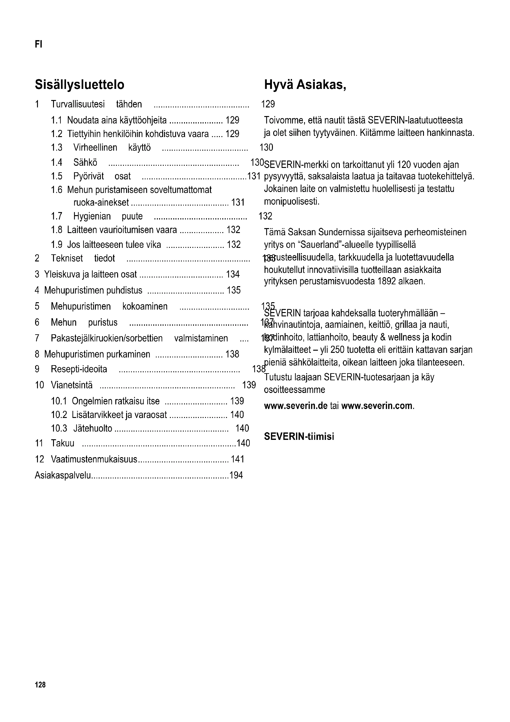 Hyvä Asiakas, Toivomme, että nautit tästä SEVERIN-laatutuotteesta ja olet siihen tyytyväinen. Kiitämme laitteen hankinnasta. SEVERIN-merkki on tarkoittanut yli 120 vuoden ajan pysyvyyttä, saksalaista laatua ja taitavaa tuotekehittelyä. Jokainen laite on valmistettu huolellisesti ja testattu monipuolisesti. Tämä Saksan Sundernissa sijaitseva perheomisteinen yritys on “Sauerland”-alueelle tyypillisellä perusteellisuudella, tarkkuudella ja luotettavuudella houkutellut innovatiivisilla tuotteillaan asiakkaita yrityksen perustamisvuodesta 1892 alkaen. SEVERIN tarjoaa kahdeksalla tuoteryhmällään – kahvinautintoja, aamiainen, keittiö, grillaa ja nauti, kodinhoito, lattianhoito, beauty & wellness ja kodin kylmälaitteet – yli 250 tuotetta eli erittäin kattavan sarjan pieniä sähkölaitteita, oikean laitteen joka tilanteeseen. Tutustu laajaan SEVERIN-tuotesarjaan ja käy osoitteessamme www.severin.de tai www.severin.com. SEVERIN-tiimisi Sisällysluettelo 1 Turvallisuutesi tähden ......................................... 129