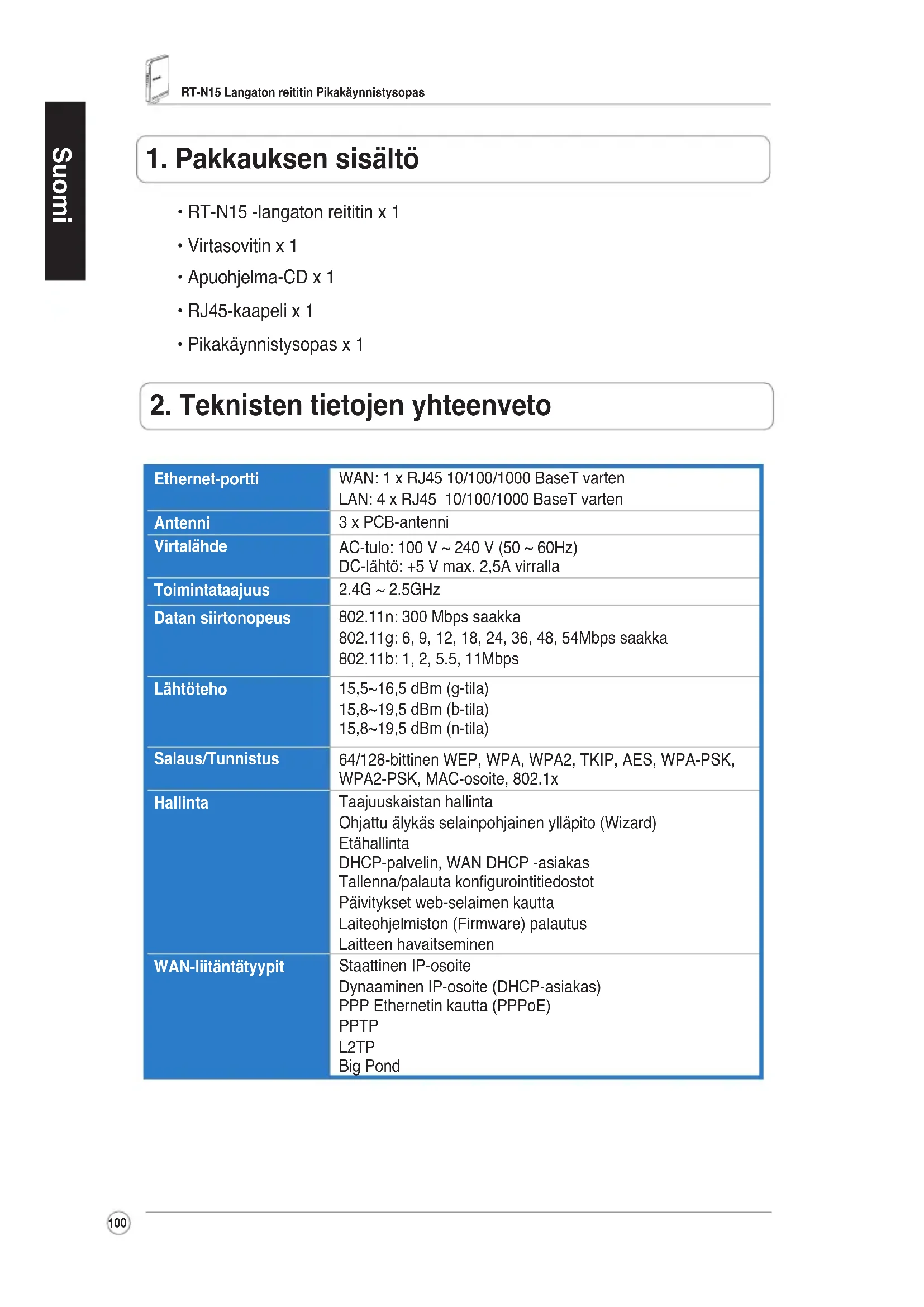 Ethernet-portti WAN:1xRJ4510/100/1000BaseTvarten LAN:4xRJ4510/100/1000BaseTvarten Antenni 3xPCB-antenni Virtalähde AC-tulo:100V~240V(50~60Hz) DC-lähtö:+5Vmax.2,5Avirralla Toimintataajuus 2.4G~2.5GHz Datan siirtonopeus 802.11n:300Mbpssaakka 802.11g:6,9,12,18,24,36,48,54Mbpssaakka 802.11b:1,2,5.5,11Mbps Lähtöteho 15,5~16,5dBm(g-tila) 15,8~19,5dBm(b-tila) 15,8~19,5dBm(n-tila) Salaus/Tunnistus 64/128-bittinenWEP,WPA,WPA2,TKIP,AES,WPA-PSK, WPA2-PSK,MAC-osoite,802.1x Hallinta Taajuuskaistanhallinta Ohjattuälykässelainpohjainenylläpito(Wizard) Etähallinta DHCP-palvelin,WANDHCP-asiakas Tallenna/palautakongurointitiedostot Päivityksetweb-selaimenkautta Laiteohjelmiston(Firmware)palautus Laitteen havaitseminen WAN-liitäntätyypit StaattinenIP-osoite DynaaminenIP-osoite(DHCP-asiakas) PPPEthernetinkautta(PPPoE) PPTP L2TP Big PondRT-N15 Langaton reititin Pikakäynnistysopas