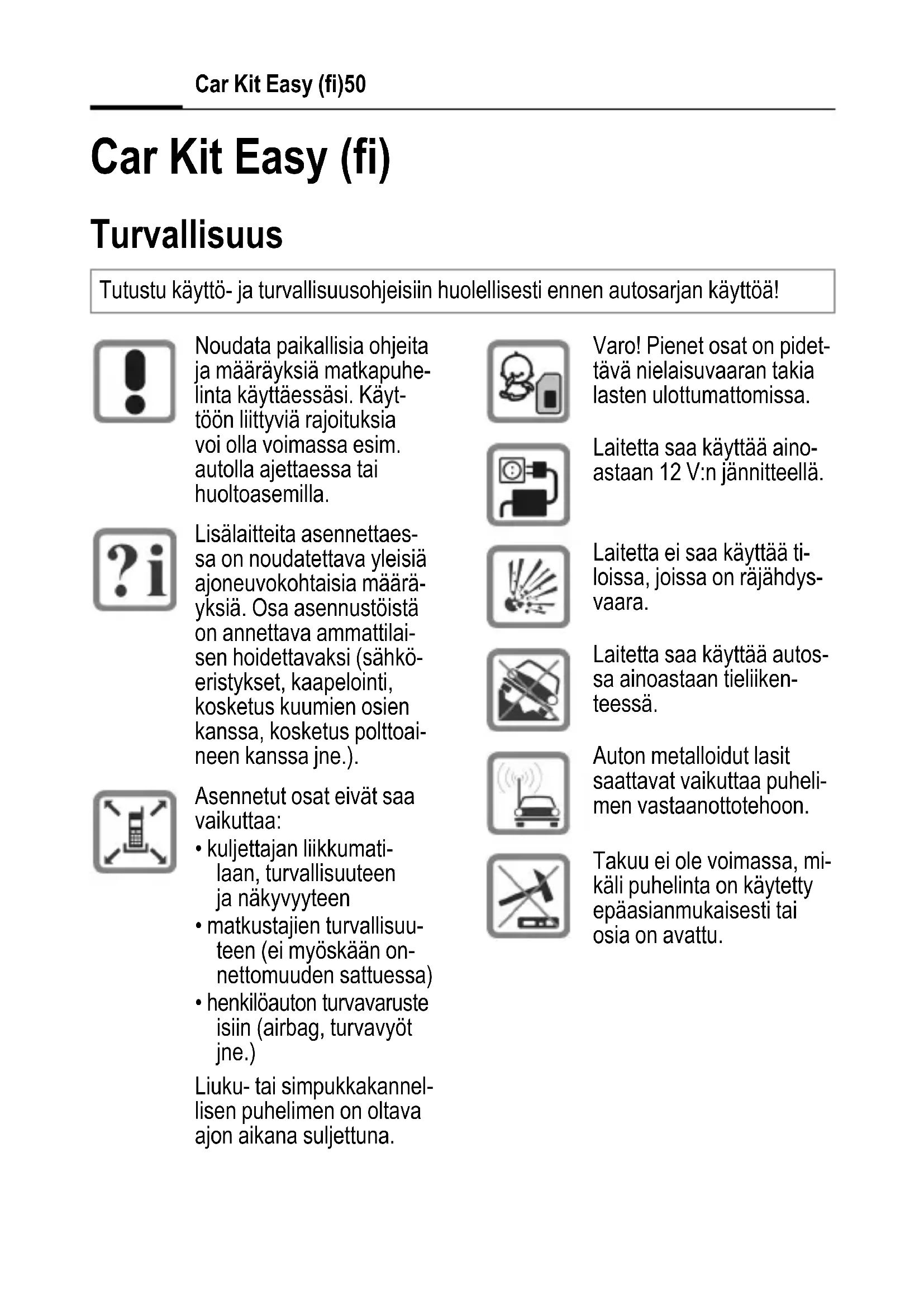 - Udskiftelige ladeholdere Produkterne kan fås i specialforretnin- ger eller i vores online-butik på følgen- de adresse: I lande, hvor vores produkt ikke sælges af autoriserede forhandlere, tilbydes der ikke ombytnings- eller reparations- service. Spændings- forsyning 10,8 V til 16 V Strømforbrug maks. 1 A / maks. 1 mA (standbystrøm) Drifts- temperatur –20° C til +55° C Højttalerud- gangseffekt maks. 1,3 W Siemens Original Accessories www.siemens- mobile.com/shopCar Kit Easy (fi)50 Car Kit Easy (fi) Turvallisuus Tutustu käyttö- ja turvallisuusohjeisiin huolellisesti ennen autosarjan käyttöä! Noudata paikallisia ohjeita ja määräyksiä matkapuhe- linta käyttäessäsi. Käyt- töön liittyviä rajoituksia voi olla voimassa esim. autolla ajettaessa tai huoltoasemilla. Lisälaitteita asennettaes- sa on noudatettava yleisiä ajoneuvokohtaisia määrä- yksiä. Osa asennustöistä on annettava ammattilai- sen hoidettavaksi (sähkö- eristykset, kaapelointi, kosketus kuumien osien kanssa, kosketus polttoai- neen kanssa jne.). Asennetut osat eivät saa vaikuttaa: