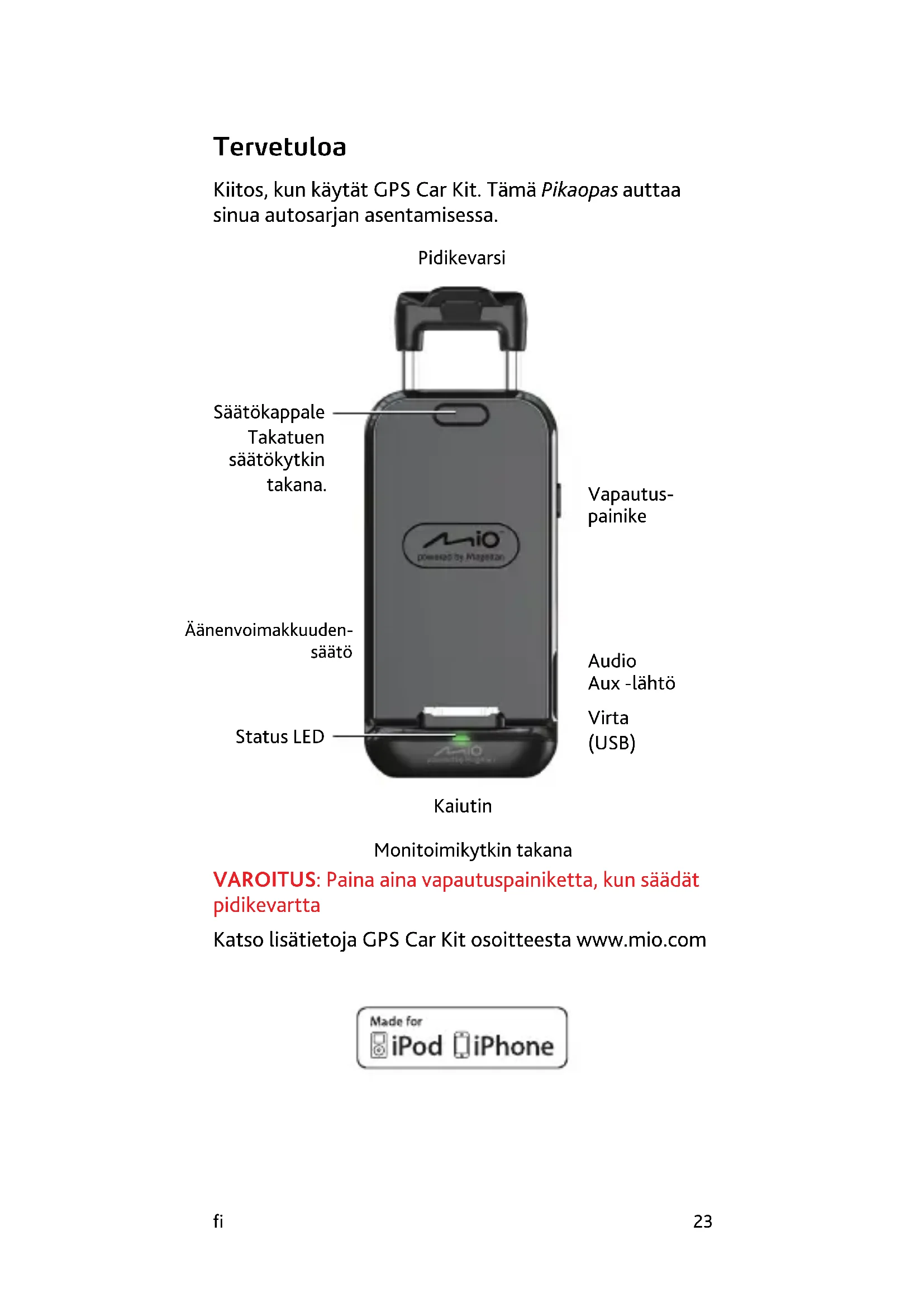 VAROITUS: Paina aina vapautuspainiketta, kun säädät pidikevartta Katso lisätietoja GPS Car Kit osoitteesta www.mio.com