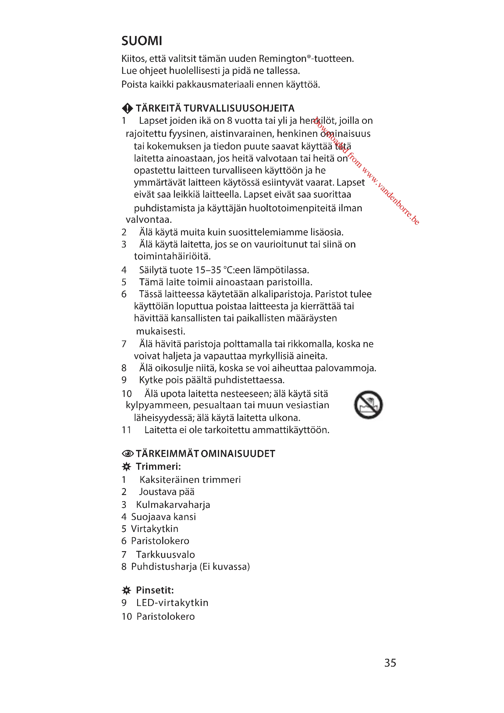 Downloaded from www.vandenborre.beKiitos,ettävalitsittämänuudenRemington®-tuotteen. Lueohjeethuolellisestijapidänetallessa. Poistakaikkipakkausmateriaaliennenkäyttöä.