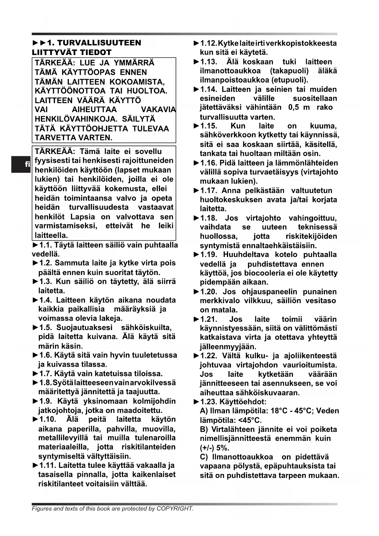 TARVETTA VARTEN. TÄRKEÄÄ: Tämä laite ei sovellu fyysisesti tai henkisesti rajoittuneiden henkilöiden käyttöön (lapset mukaan lukien) tai henkilöiden, joilla ei ole käyttöön liittyvää kokemusta, ellei heidän toimintaansa valvo ja opeta heidän turvallisuudesta vastaavat henkilöt Lapsia on valvottava sen varmistamiseksi, etteivät he leiki laitteella. ►1.1. Täytä laitteen säiliö vain puhtaalla vedellä. ►1.2. Sammuta laite ja kytke virta pois päältä ennen kuin suoritat täytön. ►1.3. Kun säiliö on täytetty, älä siirrä laitetta. ►1.4. Laitteen käytön aikana noudata kaikkia paikallisia määräyksiä ja voimassa olevia lakeja. ►1.5. Suojautuaksesi sähköiskuilta, pidä laitetta kuivana. Älä käytä sitä märin käsin. ►1.6. Käytä sitä vain hyvin tuuletetussa ja kuivassa tilassa. ►1.7. Käytä vain katetuissa tiloissa. ►1.8. Syötä laitteeseen vain arvokilvessä määritettyä jännitettä ja taajuutta. ►1.9. Käytä yksinomaan kolmijohdin jatkojohtoja, jotka on maadoitettu. ►1.10. Älä peitä laitetta käytön aikana paperilla, pahvilla, muovilla, metallilevyillä tai muilla tulenaroilla materiaaleilla, jotta riskitilanteiden syntymiseltä vältyttäisiin. ►1.11. Laitetta tulee käyttää vakaalla ja tasaisella pinnalla, jotta kaikenlaiset riskitilanteet voitaisiin välttää. ►1.12. Kytke laite irti verkkopistokkeesta kun sitä ei käytetä. ►1.13. Älä koskaan tuki laitteen ilmanottoaukkoa (takapuoli) äläkä ilmanpoistoaukkoa (etupuoli). ►1.14. Laitteen ja seinien tai muiden esineiden välille suositellaan jätettäväksi vähintään 0,5 m rako turvallisuutta varten. ►1.15. Kun laite on kuuma, sähköverkkoon kytketty tai käynnissä, sitä ei saa koskaan siirtää, käsitellä, tankata tai huoltaan miltään osin. ►1.16. Pidä laitteen ja lämmönlähteiden välillä sopiva turvaetäisyys (virtajohto mukaan lukien). ►1.17. Anna pelkästään valtuutetun huoltokeskuksen avata ja/tai korjata laitetta. ►1.18. Jos virtajohto vahingoittuu, vaihdata se uuteen teknisessä huollossa, jotta riskitekijöiden syntymistä ennaltaehkäistäisiin. ►1.19. Huuhdeltava kotelo puhtaalla vedellä ja puhdistettava ennen käyttöä, jos biocooleria ei ole käytetty pidempään aikaan. ►1.20. Jos ohjauspaneelin punainen merkkivalo vilkkuu, säiliön vesitaso on matala. ►1.21. Jos laite toimii väärin käynnistyessään, siitä on välittömästi katkaistava virta ja otettava yhteyttä jälleenmyyjään. ►1.22. Vältä kulku- ja ajoliikenteestä johtuvaa virtajohdon vaurioitumista. Jos laite kytketään väärään jännitteeseen tai asennukseen, se voi aiheuttaa sähköiskuvaaran. ►1.23. Käyttöehdot: A) Ilman lämpötila: 18°C - 45°C; Veden lämpötila: <45°C. B) Virtalähteen jännite ei voi poiketa nimellisjännitteestä enemmän kuin (+/-) 5%. C) Ilmanottoaukkoa on pidettävä vapaana pölystä, epäpuhtauksista tai sitä on puhdistettava tarpeen mukaan. Figures and texts of this book are protected by COPYRIGHT. ►►2. PAKKAUKSEN PURKAMINEN ►2.1. Ota kaikki laitteen pakkaamisessa ja lähetyksessä käytetyt pakkausmateriaalit pois ja hävitä ne voimassa olevien määräysten mukaan. ►2.2. Ota kaikki osat pois pakkauksesta. ►2.3. Tarkista mahdolliset kuljetuksen aikana syntyneet vahingot. Jos laite näyttää vahingoittuneelta, ilmoita siitä välittömästi liikkeeseen, josta se hankittiin. ►►3. KOKOAMINEN Laite on varustettu pyörillä, jotka helpottavat sen liikuttamista. Mallista riippuen pyörät voivat olla joko asennettu tai ei. Asennukseen kuuluvilla vastaavilla pulteilla varustetut osat on sijoitettu pakkauksen sisälle (Kuva 1). ►►4. TOIMINTA VAROITUS: Lue huolellisesti