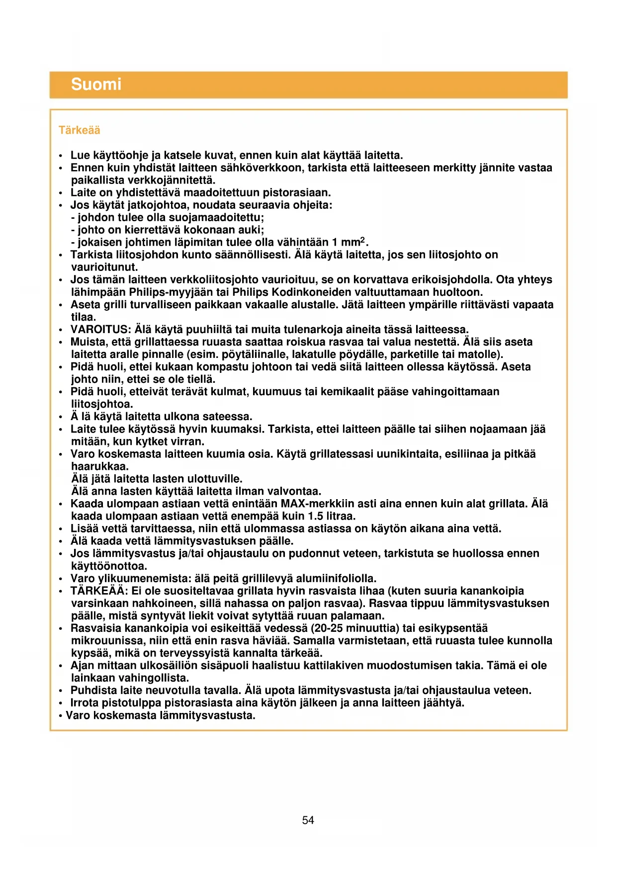 VAROITUS: Alä kayta puuhiiltä tai muita tulenarkoja aineita tassä laitteessa. - Muista, etta grillattaessa ruuasta saattaa roiskua rasvaa tai valua nestetta. Alä siis aseta laitetta aralle pinnalle (esim. poytaliinalle, lakatulle poydalle, parketille tai matolle).