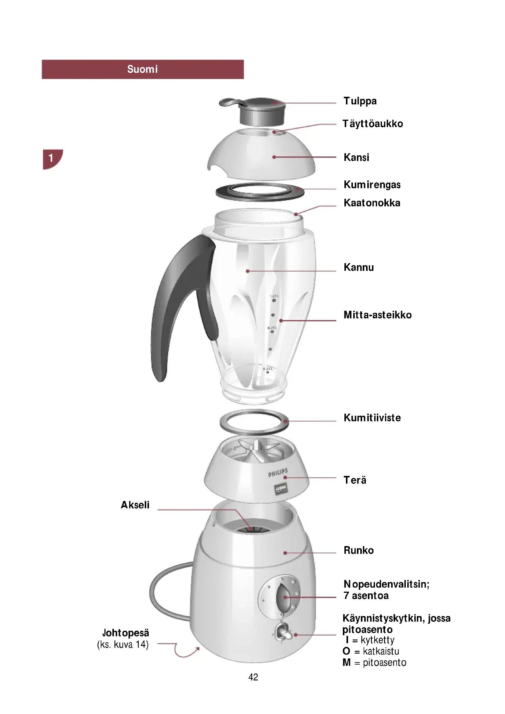 Tulppa Täyttöaukko Kansi Kumirengas Kaatonokka Kannu Mitta-asteikko Kumitiiviste Akseli Runko Nopeudenvalitsin; 7 asentoa Käynnistyskytkin, jossa pitoasento I = kytketty O = katkaistu M = pitoasento Johtopesä (ks. kuva 14)Philips ja Alessi ovat kehittäneet yhdessä ainutlaatuisen sarjan sähköllä toimivia keittiökoneita. Philips-Alessi-sarjaan kuuluu leivänpaahdin, kahvinkeitin, vedenkeitin ja sitruspuserrin.