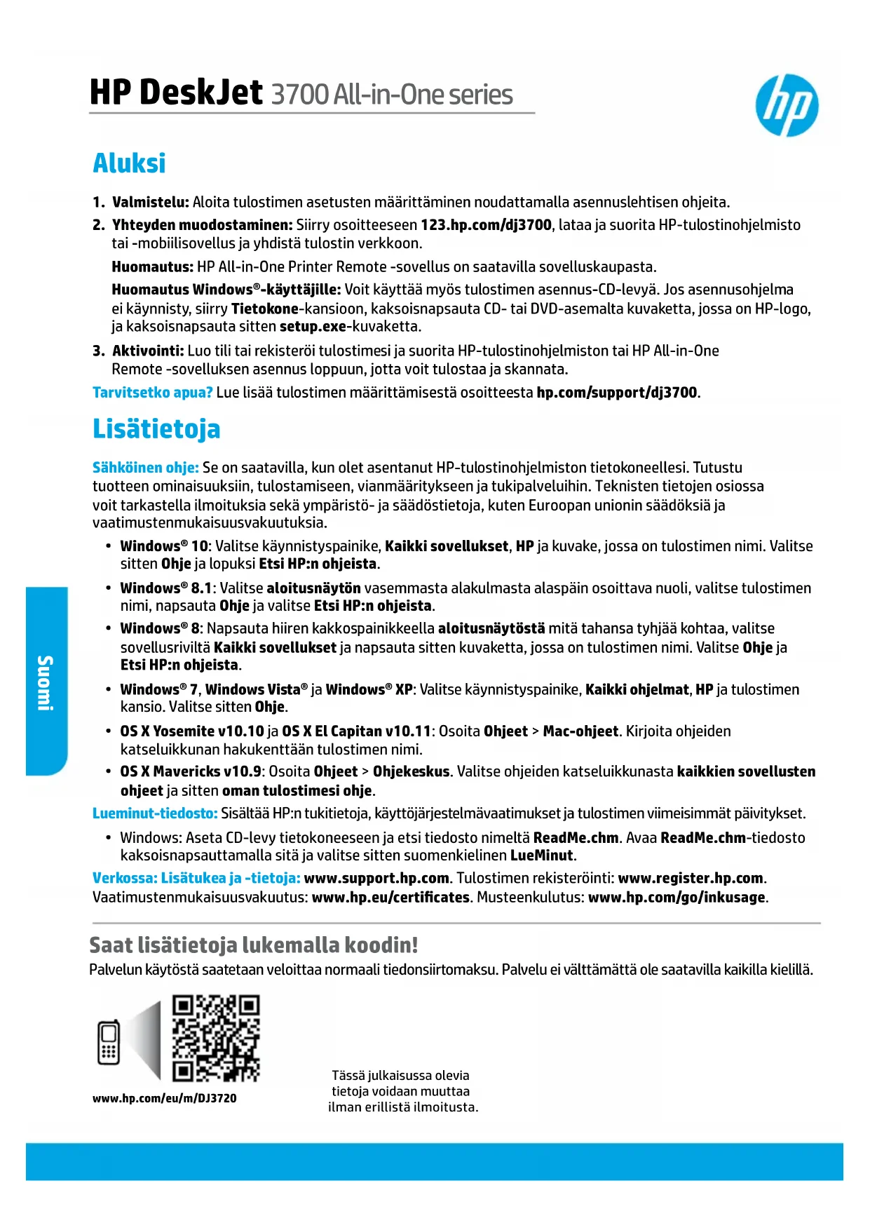 - Windows: Aseta CD-levy tietokoneeseen ja etsi tiedosto nimeltä ReadMe.chm. Avaa ReadMe.chm-tiedosto kaksoisnapsauttamalla sitä ja valitse sitten suomenkielinen LueMinut. Verkossa: Lisätukea ja -tietoja: www.support.hp.com. Tulostimen rekisteröinti: www.register.hp.com. Vaatimustenmukaisuusvakuutus: www.hp.eu/certicates. Musteenkulutus: www.hp.com/go/inkusage. HP DeskJet 3700 All-in-One series Saat lisätietoja lukemalla koodin! Palvelun käytöstä saatetaan veloittaa normaali tiedonsiirtomaksu. Palvelu ei välttämättä ole saatavilla kaikilla kielillä. Tässä julkaisussa olevia tietoja voidaan muuttaa ilman erillistä ilmoitusta.Suomi