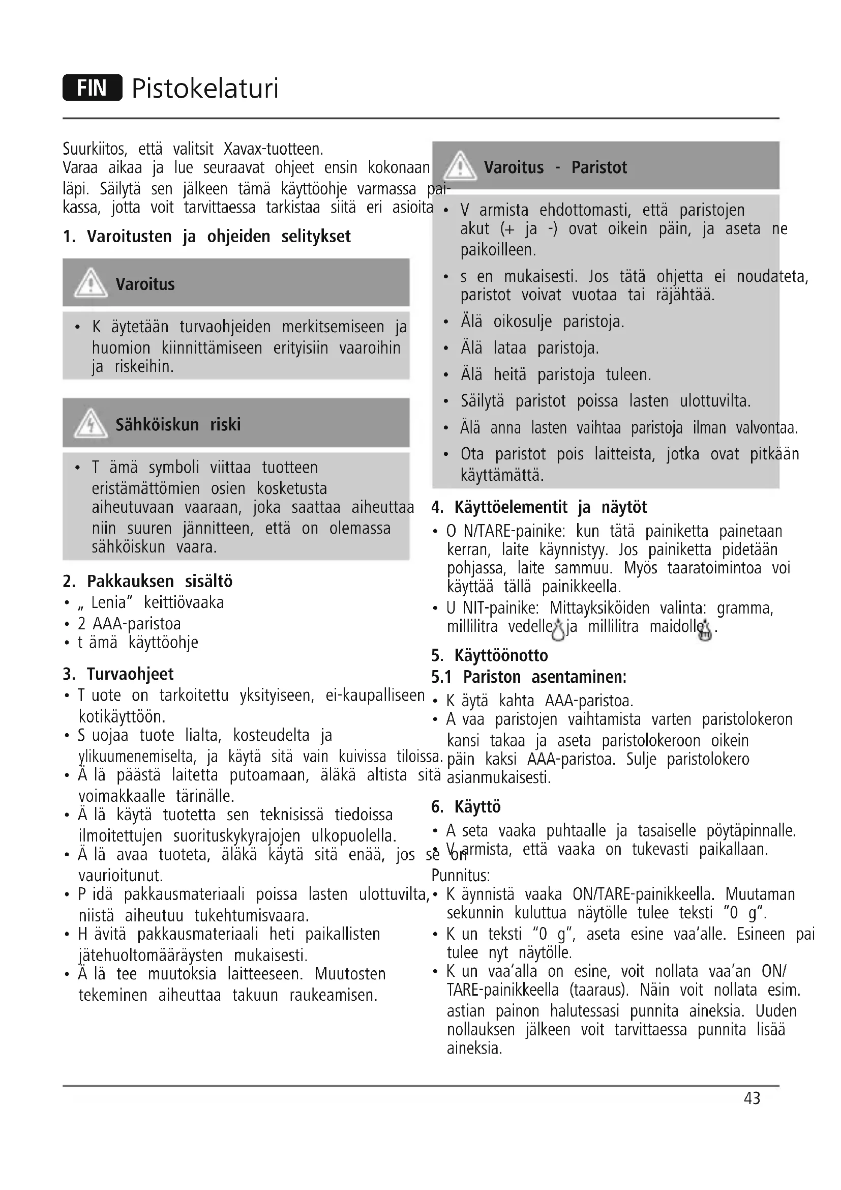 Erittäin tarkka laajenemisanturi ja tehokas suoritin takaavat tarkan punnituksen Maksimipaino 5000 g Asteikkojako 1 g Yksikkö gramma, millilitra vedelle / maidolle näyttö ilmoittaa pariston alhaisesta tasosta ja ylikuormituksesta taaratoiminto automaattinen katkaisu toimintonäppäimet: (ON/TARE, UNIT) virtalähde 2 AAA-paristoa