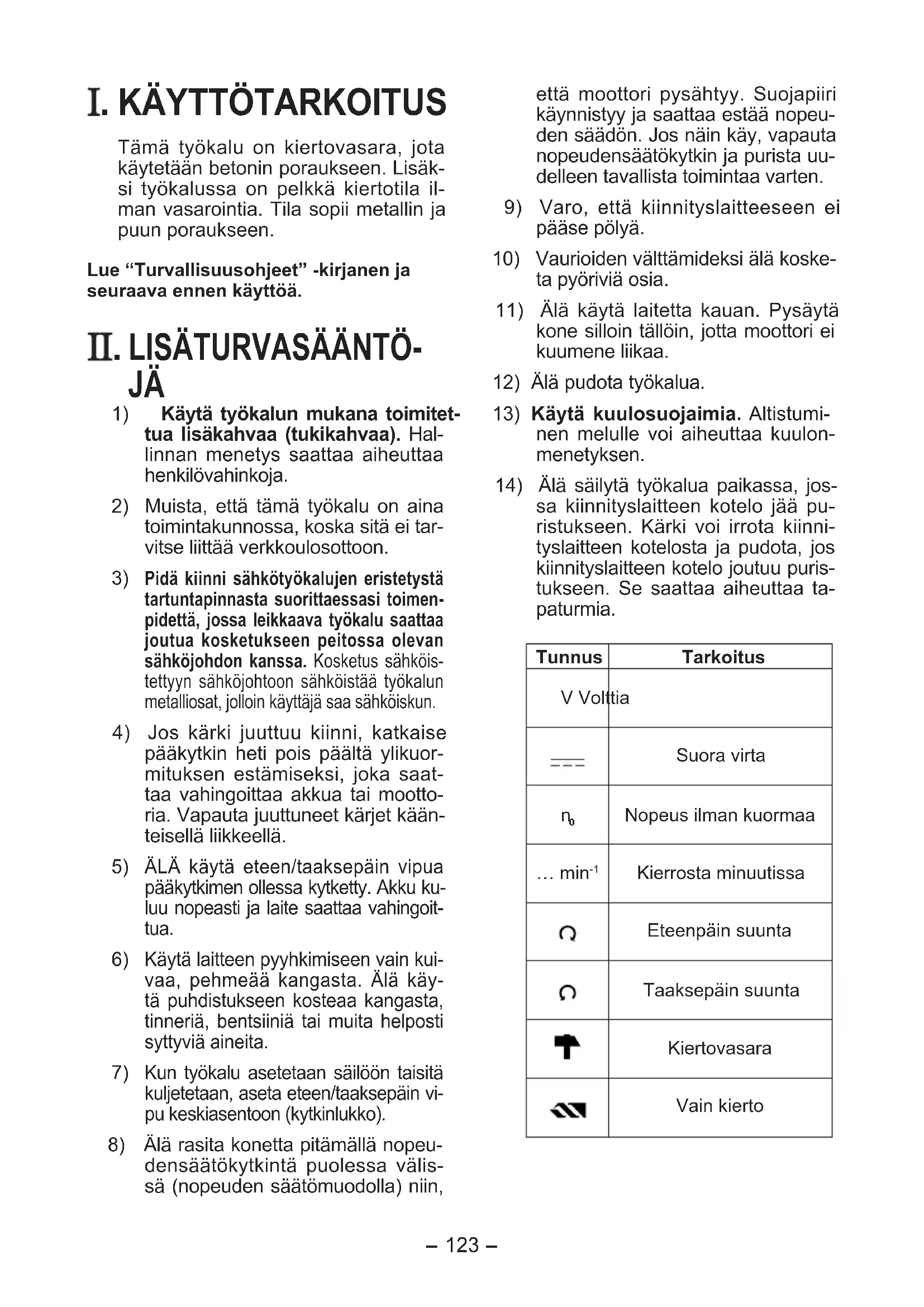 Tämä työkalu on kiertovasara, jota käytetään betonin poraukseen. Lisäk- si työkalussa on pelkkä kiertotila il- man vasarointia. Tila sopii metallin ja puun poraukseen. Lue “Turvallisuusohjeet” -kirjanen ja seuraava ennen käyttöä.