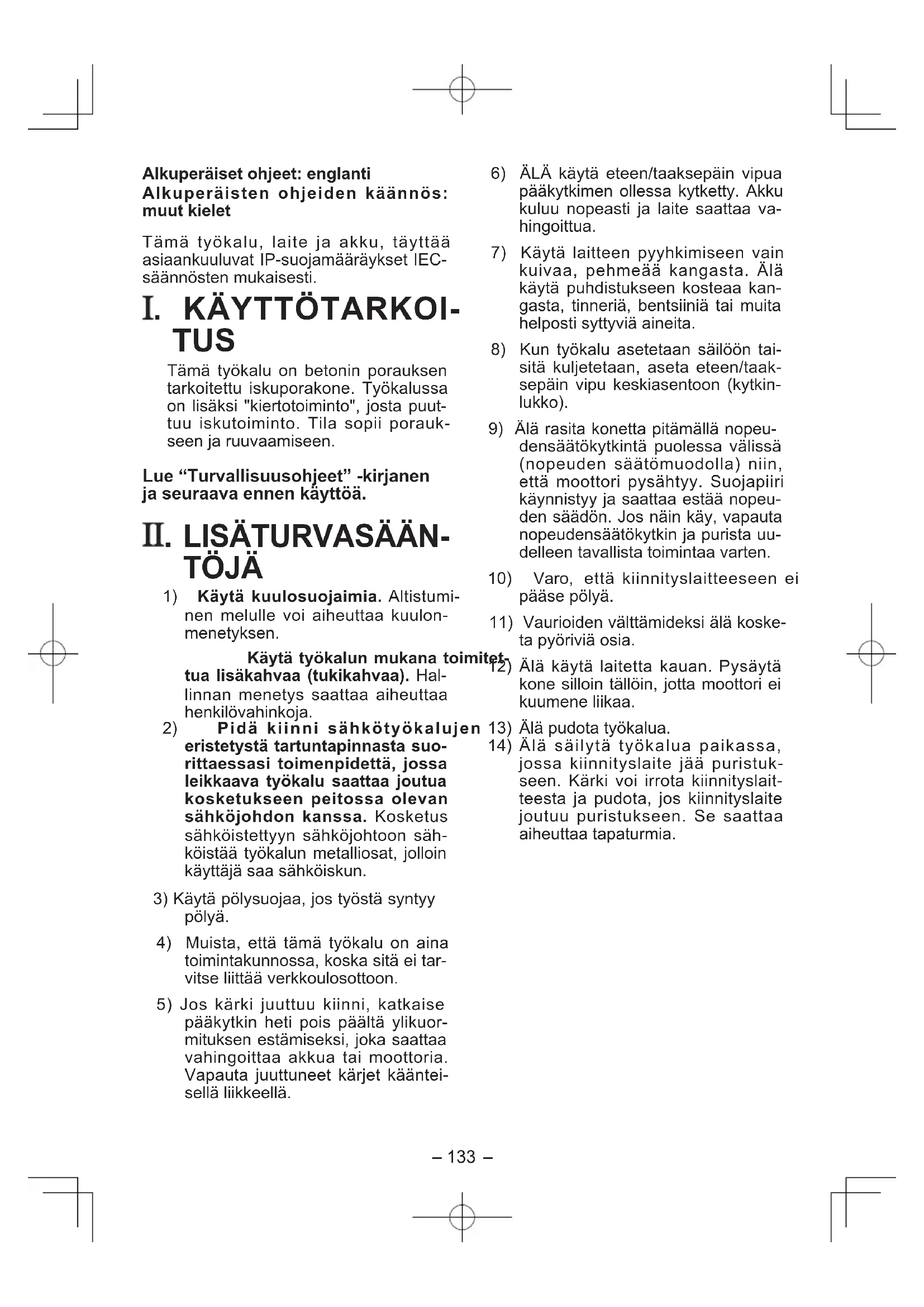 TUS Tämä työkalu on betonin porauksen tarkoitettu iskuporakone. Työkalussa on lisäksi "kiertotoiminto", josta puut- tuu iskutoiminto. Tila sopii porauk- seen ja ruuvaamiseen. Lue “Turvallisuusohjeet” -kirjanen ja seuraava ennen käyttöä.