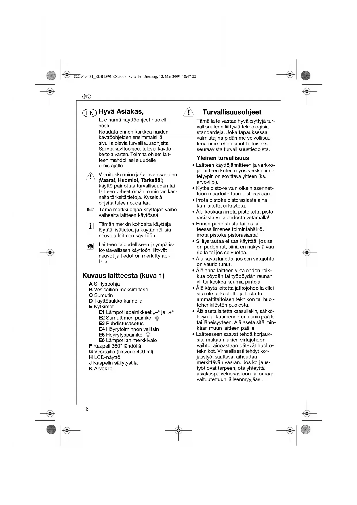 Hyvä Asiakas, Lue nämä käyttöohjeet huolelli-sesti.Noudata ennen kaikkea näiden käyttöohjeiden ensimmäisillä sivuilla olevia turvallisuusohjeita! Säilytä käyttöohjeet tulevia käyttö-kertoja varten. Toimita ohjeet lait-teen mahdolliselle uudelle omistajalle. Varoituskolmion ja/tai avainsanojen (Vaara!, Huomio!, Tärkeää!) käyttö painottaa turvallisuuden tai laitteen virheettömän toiminnan kan-nalta tärkeitä tietoja. Kyseisiä ohjeita tulee noudattaa.0 Tämä merkki ohjaa käyttäjää vaihe vaiheelta laitteen käytössä. Tämän merkin kohdalta käyttäjä löytää lisätietoa ja käytännöllisiä neuvoja laitteen käyttöön. Laitteen taloudelliseen ja ympäris-töystävälliseen käyttöön liittyvät neuvot ja tiedot on merkitty api-lalla. Kuvaus laitteesta (kuva 1) A SilityspohjaB Vesisäiliön maksimitasoC SumutinD Täyttöaukko kannellaE KytkimetE1 Lämpötilapainikkeet „–“ ja „+“E2 Sumuttimen painikeE3 PuhdistusasetusE4 Höyrytoiminnon valitsinE5 HöyrytyspainikeE6 Lämpötilan merkkivaloF Kaapeli 360° lähdölläG Vesisäiliö (tilavuus 400 ml)H LCD-näyttöJ Kaapelin säilytystilaK Arvokilpi 1 Turvallisuusohjeet Tämä laite vastaa hyväksyttyjä tur-vallisuuteen liittyviä teknologisia standardeja. Joka tapauksessa valmistajina pidämme velvollisuu-tenamme tehdä sinut tietoiseksi seuraavista turvallisuustiedoista.Yleinen turvallisuus • Laitteen käyttöjännitteen ja verkko-jännitteen kuten myös verkkojänni-tetyypin on sovittava yhteen (ks. arvokilpi).• Kytke pistoke vain oikein asennet-tuun maadoitettuun pistorasiaan.• Irrota pistoke pistorasiasta aina kun laitetta ei käytetä.• Älä koskaan irrota pistoketta pisto-rasiasta virtajohdosta vetämällä!• Ennen puhdistusta tai jos lait-teessa ilmenee toimintahäiriö, irrota pistoke pistorasiasta!• Silitysrautaa ei saa käyttää, jos se on pudonnut, siinä on näkyviä vau-rioita tai jos se vuotaa.• Älä käytä laitetta, jos sen virtajohto on vaurioitunut.• Älä anna laitteen virtajohdon roik-kua pöydän tai työpöydän reunan yli tai koskea kuumia pintoja.• Älä käytä laitetta jatkojohdolla ellei sitä ole tarkastettu ja testattu ammattitaitoisen teknikon tai huol-tohenkilöstön puolesta. Älä aseta laitetta kaasuliekin, sähkö-levyn tai kuumennetun uunin päälle tai läheisyyteen. Älä aseta sitä min-kään muun laitteen päälle.• Laitteeseen saavat tehdä korjauk-sia, mukaan lukien virtajohdon vaihto, ainoastaan pätevät huolto-teknikot. Virheellisesti tehdyt kor-jaustyöt saattavat aiheuttaa merkittävän vaaran. Jos korjaus-työt ovat tarpeen, ota yhteyttä asiakaspalveluosastoon tai omaan valtuutettuun jälleenmyyjääsi.822 949 431_EDB8590-EX.book Seite 16 Dienstag, 12. Mai 2009 10:47 22q