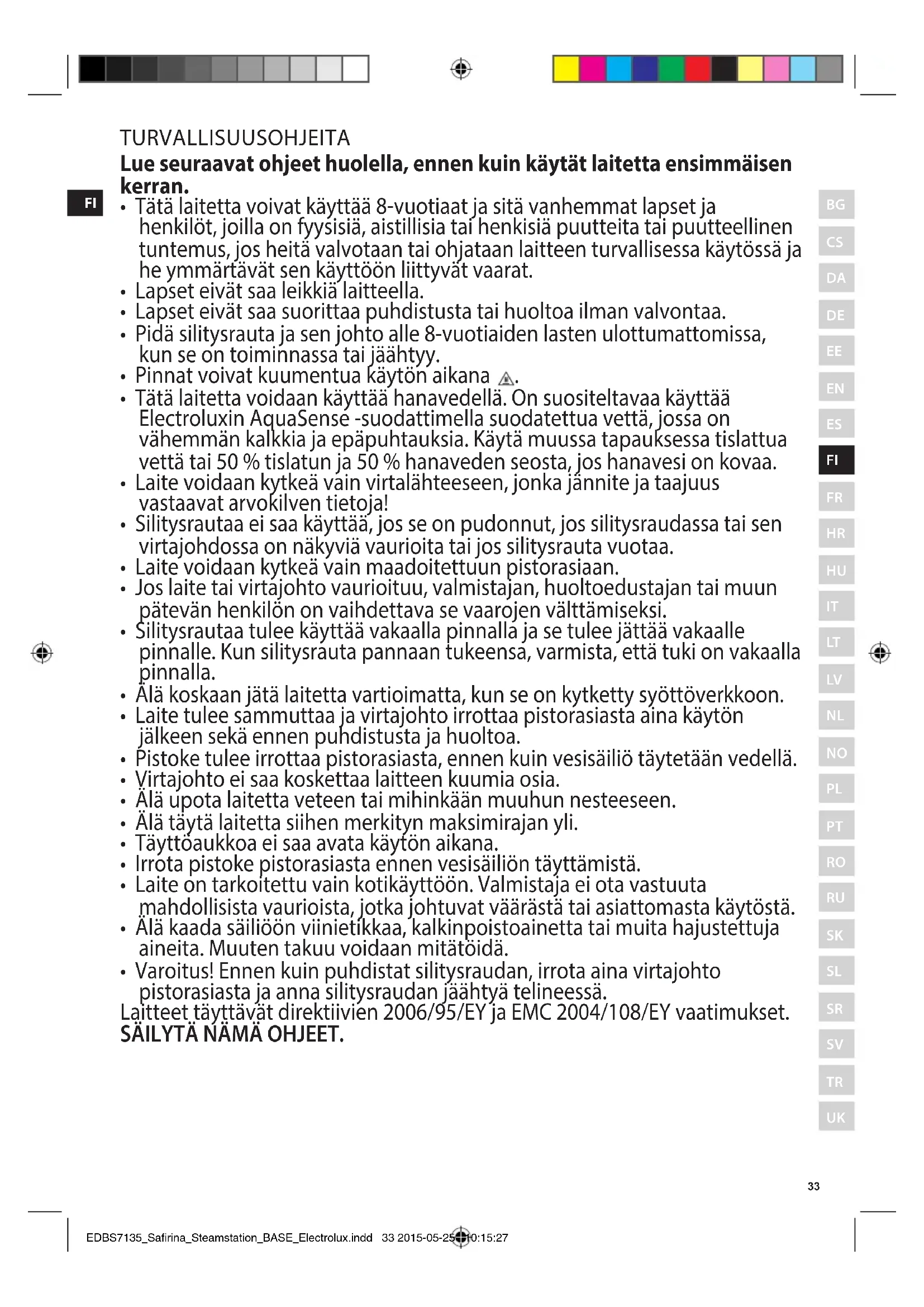 EDBS7135_Safirina_Steamstation_BASE_Electrolux.indd 32 2015-05-25 10:15:27FI TURVALLISUUSOHJEITA Lue seuraavat ohjeet huolella, ennen kuin käytät laitetta ensimmäisen kerran.