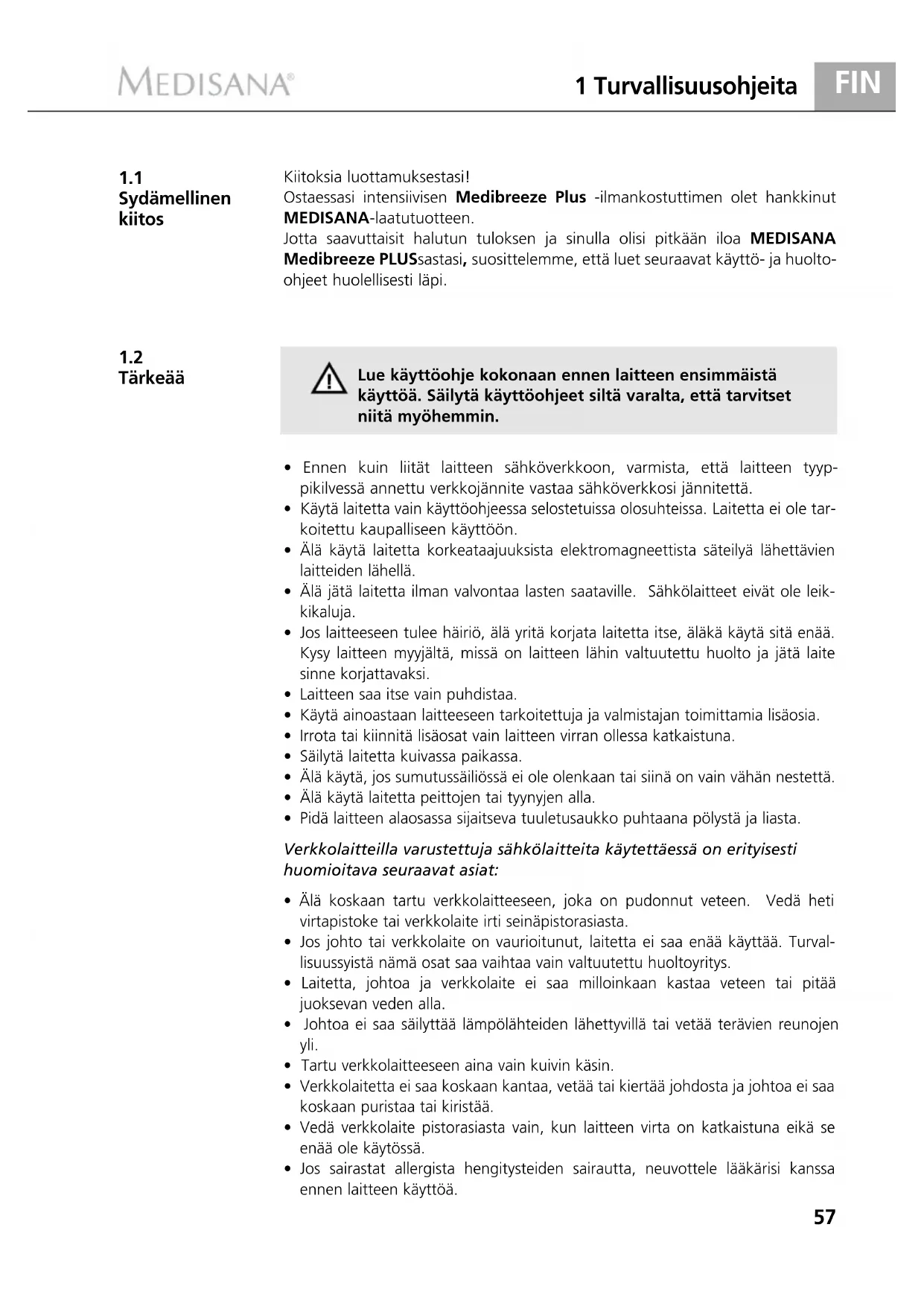 Tärkeää Kiitoksia luottamuksestasi! Ostaessasi intensiivisen Medibreeze Plus -ilmankostuttimen olet hankkinut MEDISANA-laatutuotteen. Jotta saavuttaisit halutun tuloksen ja sinulla olisi pitkään iloa MEDISANA Medibreeze PLUSsastasi, suosittelemme, että luet seuraavat käyttö- ja huolto- ohjeet huolellisesti läpi. Lue käyttöohje kokonaan ennen laitteen ensimmäistä käyttöä. Säilytä käyttöohjeet siltä varalta, että tarvitset niitä myöhemmin.