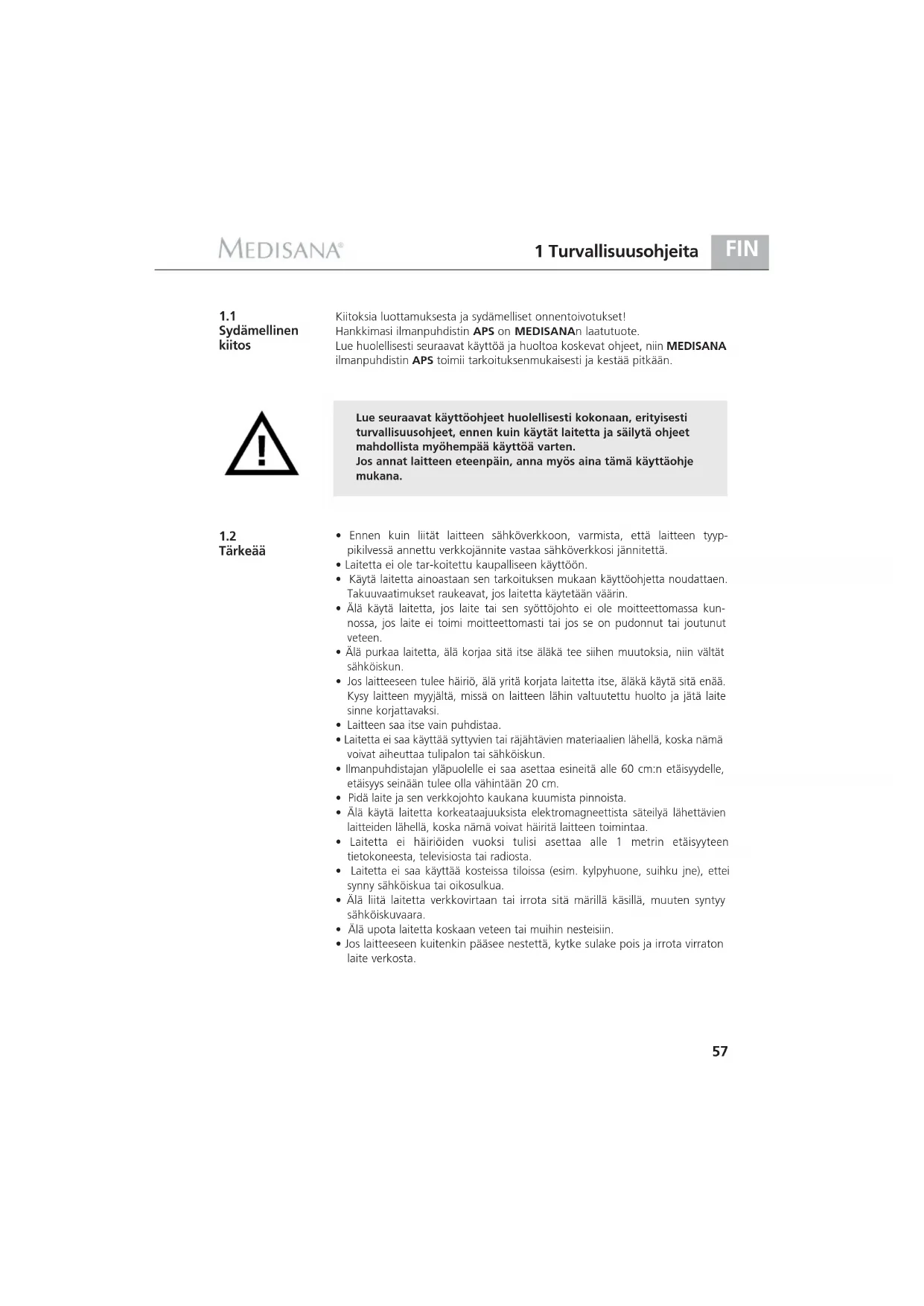 Tärkeää Kiitoksia luottamuksesta ja sydämelliset onnentoivotukset! Hankkimasi ilmanpuhdistin APS on MEDISANAn laatutuote. Lue huolellisesti seuraavat käyttöä ja huoltoa koskevat ohjeet, niin MEDISANA ilmanpuhdistin APS toimii tarkoituksenmukaisesti ja kestää pitkään. Lue seuraavat käyttöohjeet huolellisesti kokonaan, erityisesti turvallisuusohjeet, ennen kuin käytät laitetta ja säilytä ohjeet mahdollista myöhempää käyttöä varten. Jos annat laitteen eteenpäin, anna myös aina tämä käyttäohje mukana.