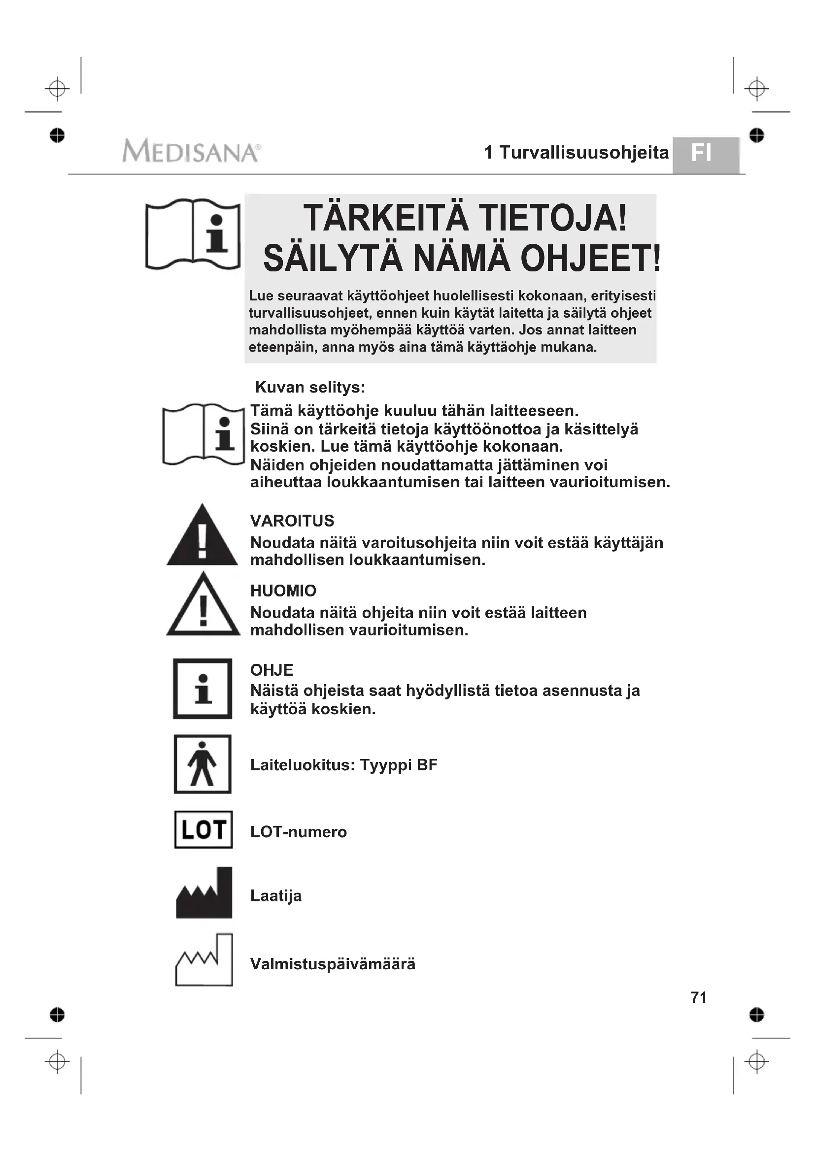 Kuvan selitys: LOT-numero Valmistuspäivämäärä Laiteluokitus: Tyyppi BF TÄRKEITÄ TIETOJA! SÄILYTÄ NÄMÄ OHJEET! Tämä käyttöohje kuuluu tähän laitteeseen. Siinä on tärkeitä tietoja käyttöönottoa ja käsittelyä koskien. Lue tämä käyttöohje kokonaan. Näiden ohjeiden noudattamatta jättäminen voi aiheuttaa loukkaantumisen tai laitteen vaurioitumisen. VAROITUS Noudata näitä varoitusohjeita niin voit estää käyttäjän mahdollisen loukkaantumisen. HUOMIO Noudata näitä ohjeita niin voit estää laitteen mahdollisen vaurioitumisen. OHJE Näistä ohjeista saat hyödyllistä tietoa asennusta ja käyttöä koskien. Laatija Lue seuraavat käyttöohjeet huolellisesti kokonaan, erityisesti turvallisuusohjeet, ennen kuin käytät laitetta ja säilytä ohjeet mahdollista myöhempää käyttöä varten. Jos annat laitteen eteenpäin, anna myös aina tämä käyttäohje mukana.1 Turvallisuusohjeita