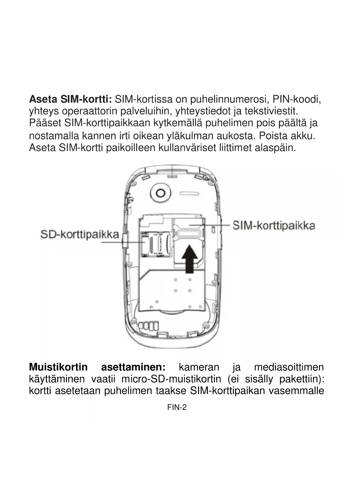 Muistikortin asettaminen: kameran ja mediasoittimen käyttäminen vaatii micro-SD-muistikortin (ei sisälly pakettiin): kortti asetetaan puhelimen taakse SIM-korttipaikan vasemmalleFIN-3 puolelle. Aseta micro-SD-kortti kuvan mukaisesti kullanväriset liittimet alaspäin: avaa metallinen suljin työntämällä sitä kohti ”avaa”-merkintää ja lukitse kortin asettamisen jälkeen painamalla vastakkaiseen suuntaan (”sulje”). Kytke PÄÄLLE, kytke POIS ja näppäimistölukko: kytke puhelin päälle ja pois päältä painamalla ja pitämällä punaista puhelun lopetusnäppäintä. Näppäimistö lukittuu, kun kansi suljetaan. Yhdistäminen tietokoneeseen: käytä USB-kaapelia GSP-130:n ja tietokoneen yhdistämiseen. Valitse puhelimesta U-levy . Voit tallentaa musiikkia SD-muistikortin "Oma musiikki"-kansioon ja soittaa musiikkisoittimella. Akun asettaminen: Laitteessa on litiumioniakku. Laite on suunniteltu käytettäväksi vain alkuperäisten akkujen ja latureiden kanssa. Akku asetetaan puhelimen taakse. Aseta akku akkupaikkaan liittimet ylöspäin vasten puhelimen liittimiä. Kun olet valmis, aseta takakansi paikoilleen siten kuin seuraavissa kuvissa näytetään.FIN-4