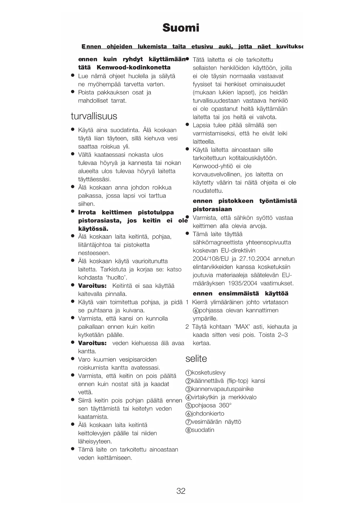 Tämä laite täyttää sähkömagneettista yhteensopivuutta koskevan EU-direktiivin 2004/108/EU ja 27.10.2004 annetun elintarvikkeiden kanssa kosketuksiin joutuvia materiaaleja säätelevän EU- määräyksen 1935/2004 vaatimukset. ennen ensimmäistä käyttöä 1 Kierrä ylimääräinen johto virtatason pohjassa olevan kannattimen ympärille. 2 Täytä kohtaan ’MAX’ asti, kiehauta ja kaada sitten vesi pois. Toista 2–3 kertaa. selite kosketuslevy käännettävä (flip-top) kansi kannenvapautuspainike virtakytkin ja merkkivalo pohjaosa 360° johdonkierto vesimäärän näyttö suodatin Suomi