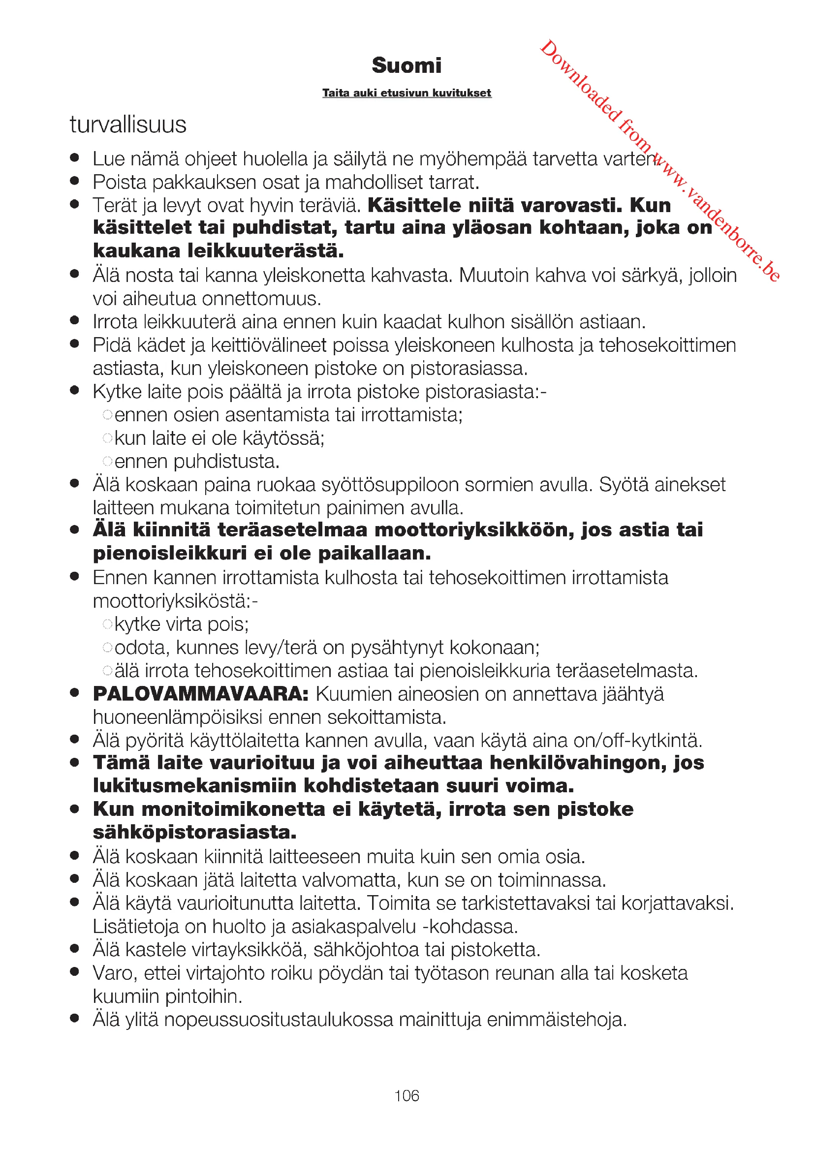 Kun kansi kiinnitetään kannuun, varmista aina, että kannen ja kannun liitos on puhdas, jotta se on tiivis eikä siitä roisku mitään. Downloaded from www.vandenborre.beviipalointi-/raastamislevy ja turvallisuus