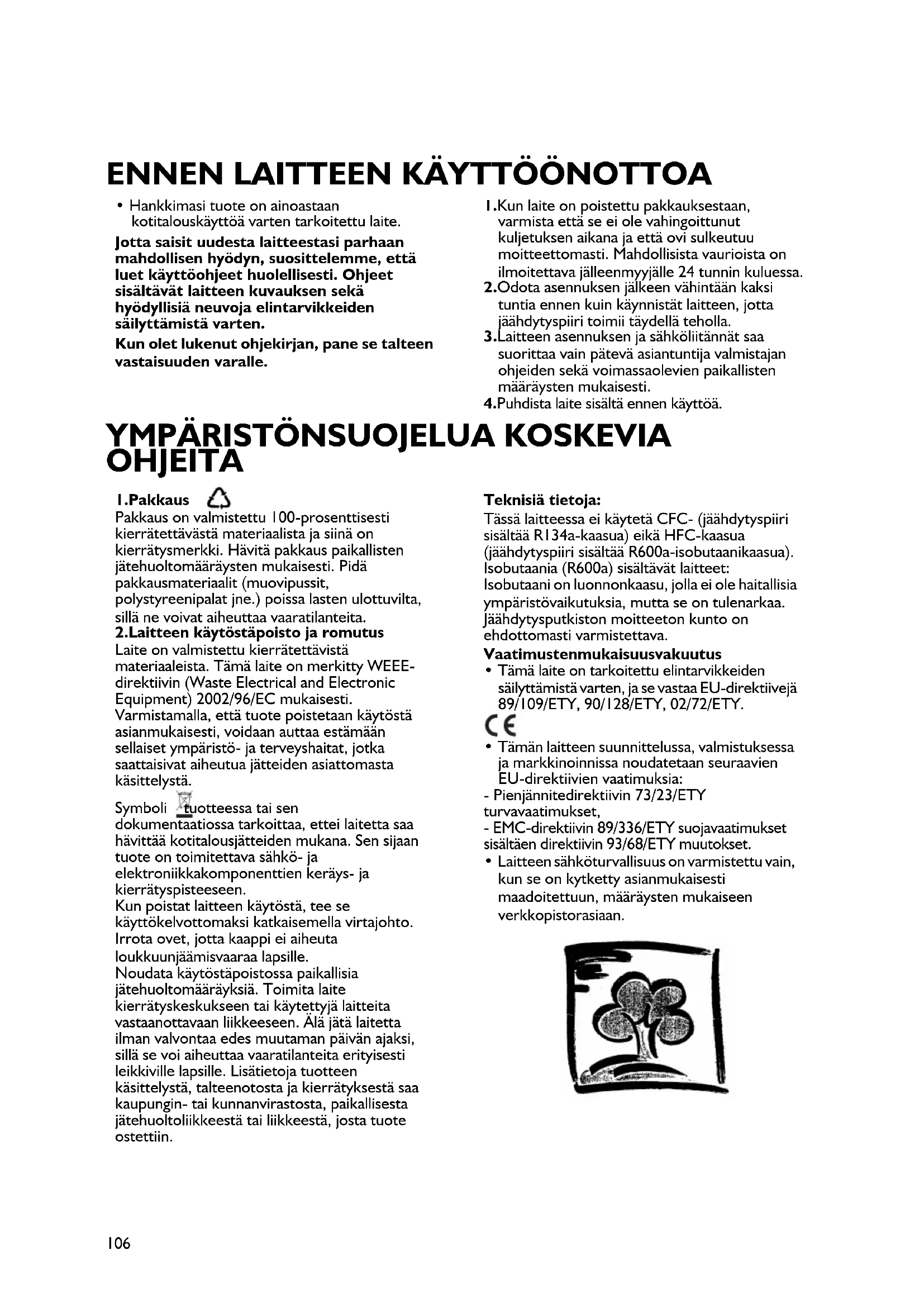 - Hankkimasi tuote on ainoastaan kotitalouskäyttöä varten tarkoitettu laite. Jotta saisit uudesta laitteestasi parhaan mahdollisen hyödyn, suosittelemme, että luet käyttöohjeet huolellisesti. Ohjeet sisältävät laitteen kuvauksen sekä hyödyllisiä neuvoja elintarvikkeiden säilyttämistä varten. Kun olet lukenut ohjekirjan, pane se talteen vastaisuuden varalle. 1.Kun laite on poistettu pakkauksestaan, varmista että se ei ole vahingoittunut kuljetuksen aikana ja että ovi sulkeutuu moitteettomasti. Mahdollisista vaurioista on ilmoitettava jälleenmyyjälle 24 tunnin kuluessa. 2.Odota asennuksen jälkeen vähintään kaksi tuntia ennen kuin käynnistät laitteen, jotta jäähdytyspiiri toimii täydellä teholla. 3.Laitteen asennuksen ja sähköliitännät saa suorittaa vain pätevä asiantuntija valmistajan ohjeiden sekä voimassaolevien paikallisten määräysten mukaisesti. 4.Puhdista laite sisältä ennen käyttöä. 1.Pakkaus Pakkaus on valmistettu 100-prosenttisesti kierrätettävästä materiaalista ja siinä on kierrätysmerkki. Hävitä pakkaus paikallisten jätehuoltomääräysten mukaisesti. Pidä pakkausmateriaalit (muovipussit, polystyreenipalat jne.) poissa lasten ulottuvilta, sillä ne voivat aiheuttaa vaaratilanteita. 2.Laitteen käytöstäpoisto ja romutus Laite on valmistettu kierrätettävistä materiaaleista. Tämä laite on merkitty WEEE- direktiivin (Waste Electrical and Electronic Equipment) 2002/96/EC mukaisesti. Varmistamalla, että tuote poistetaan käytöstä asianmukaisesti, voidaan auttaa estämään sellaiset ympäristö- ja terveyshaitat, jotka saattaisivat aiheutua jätteiden asiattomasta käsittelystä. Symboli tuotteessa tai sen dokumentaatiossa tarkoittaa, ettei laitetta saa hävittää kotitalousjätteiden mukana. Sen sijaan tuote on toimitettava sähkö- ja elektroniikkakomponenttien keräys- ja kierrätyspisteeseen. Kun poistat laitteen käytöstä, tee se käyttökelvottomaksi katkaisemella virtajohto. Irrota ovet, jotta kaappi ei aiheuta loukkuunjäämisvaaraa lapsille. Noudata käytöstäpoistossa paikallisia jätehuoltomääräyksiä. Toimita laite kierrätyskeskukseen tai käytettyjä laitteita vastaanottavaan liikkeeseen. Älä jätä laitetta ilman valvontaa edes muutaman päivän ajaksi, sillä se voi aiheuttaa vaaratilanteita erityisesti leikkiville lapsille. Lisätietoja tuotteen käsittelystä, talteenotosta ja kierrätyksestä saa kaupungin- tai kunnanvirastosta, paikallisesta jätehuoltoliikkeestä tai liikkeestä, josta tuote ostettiin. Teknisiä tietoja: Tässä laitteessa ei käytetä CFC- (jäähdytyspiiri sisältää R134a-kaasua) eikä HFC-kaasua (jäähdytyspiiri sisältää R600a-isobutaanikaasua). Isobutaania (R600a) sisältävät laitteet: Isobutaani on luonnonkaasu, jolla ei ole haitallisia ympäristövaikutuksia, mutta se on tulenarkaa. Jäähdytysputkiston moitteeton kunto on ehdottomasti varmistettava. Vaatimustenmukaisuusvakuutus