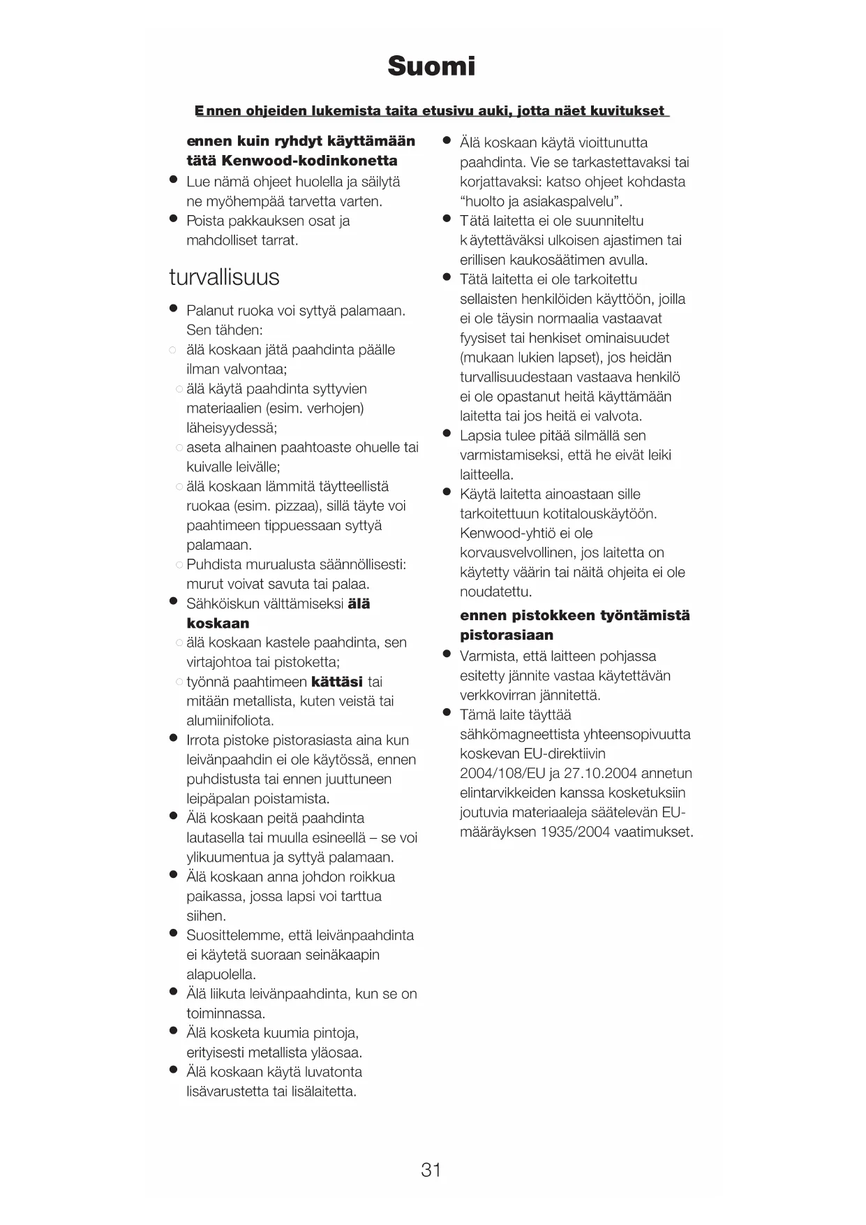 Käytä laitetta ainoastaan sille tarkoitettuun kotitalouskäytöön. Kenwood-yhtiö ei ole korvausvelvollinen, jos laitetta on käytetty väärin tai näitä ohjeita ei ole noudatettu. ennen pistokkeen työntämistä pistorasiaan
