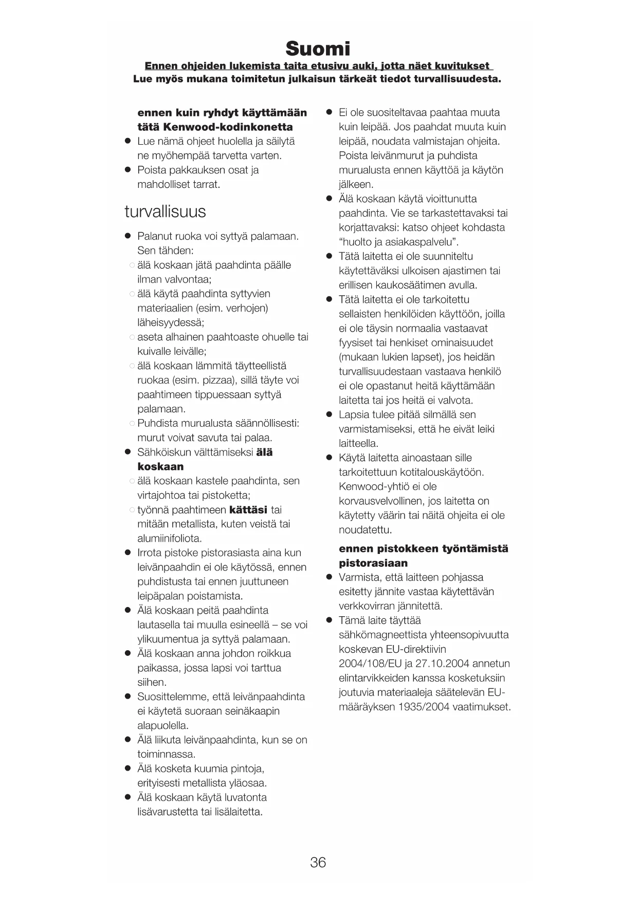 Käytä laitetta ainoastaan sille tarkoitettuun kotitalouskäytöön. Kenwood-yhtiö ei ole korvausvelvollinen, jos laitetta on käytetty väärin tai näitä ohjeita ei ole noudatettu. ennen pistokkeen työntämistä pistorasiaan