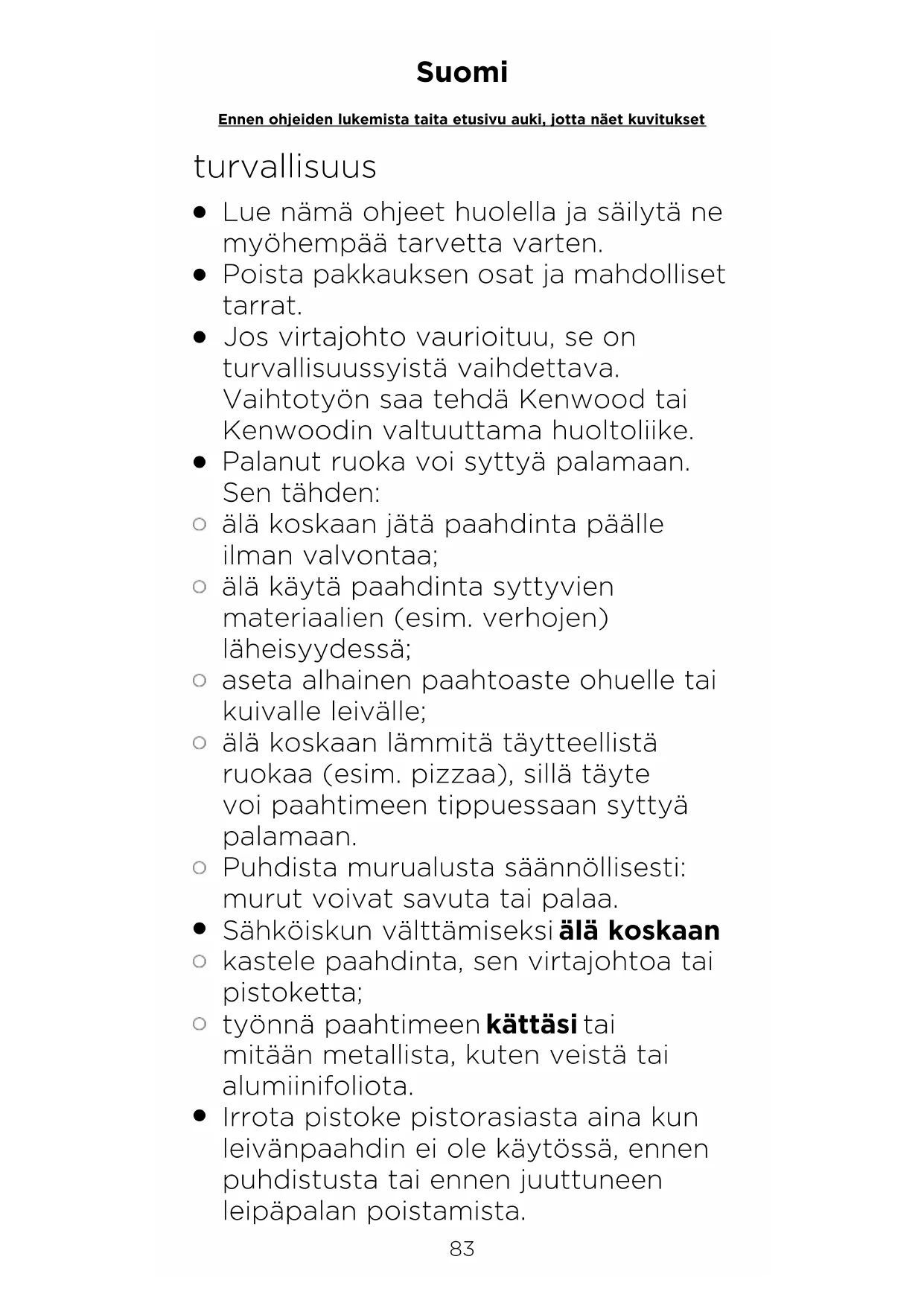 Irrota pistoke pistorasiasta aina kun leivänpaahdin ei ole käytössä, ennen puhdistusta tai ennen juuttuneen leipäpalan poistamista.83 84