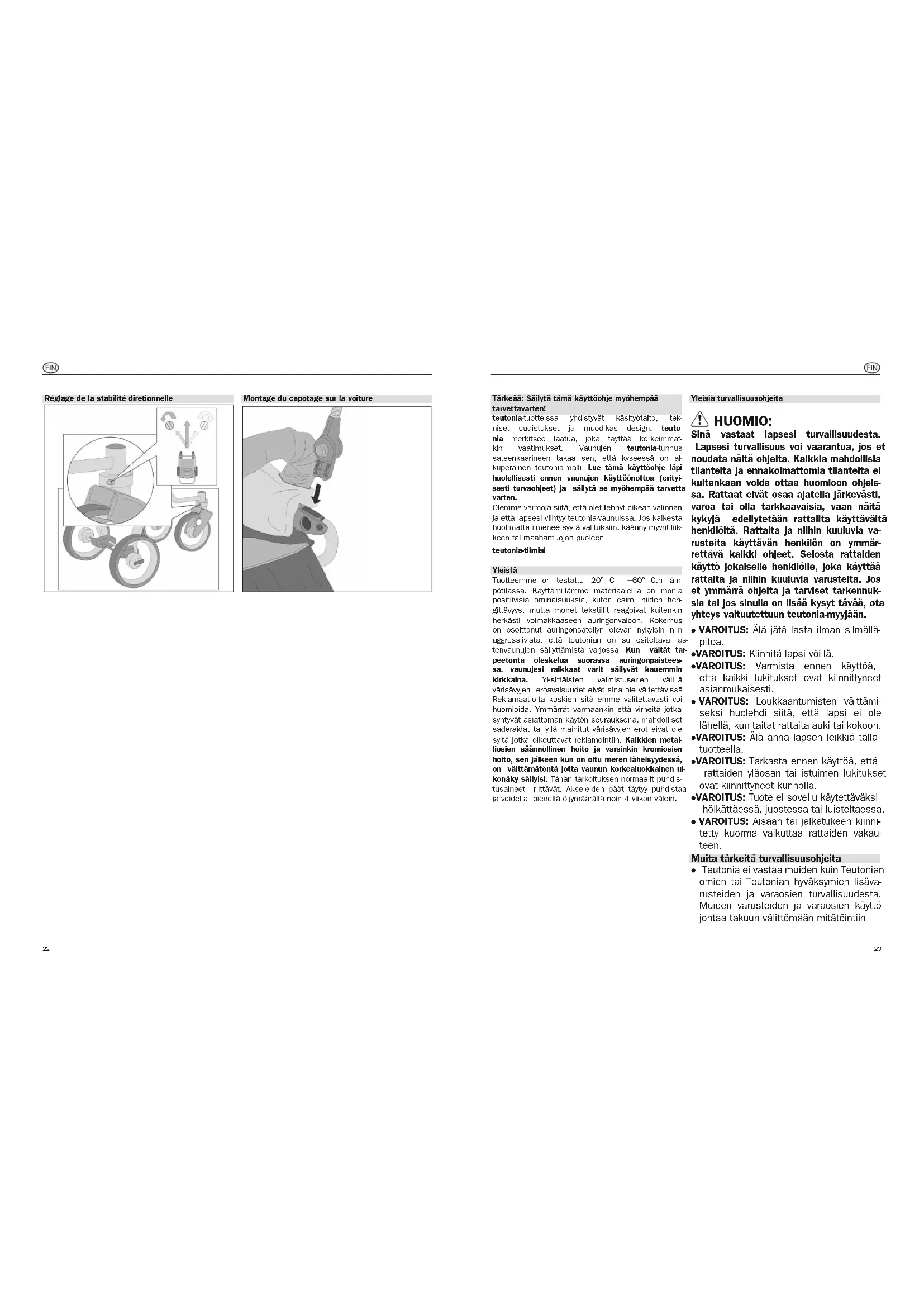 Maniement de la capote Mettre les parties repliables du corps de la capote dans les ouvertures correspondantes dans l’accoudoir et/ou. sur le sac cabas. Attention: Fixer absolument les boutons-poussoirs à l’arrière du pied de la capote au dos du dossier, étant donné que la capote fonctionne comme une protec- tion anti-chute. Afi n d’enlever la capote, dévisser, au besoin, les boutons-poussoirs à l’arrière du dossier, appuyez sur les boutons de déverrouillage sur les parties re- pliables du corps de la capote et enlever les jointures des ouvertures. Afi n d’aérer, vous pouvez ouvrir la fermeture à glissière sur le nez de la capote. Réglage du dossier de siège Tirer vers le haut le disposi- tif de blocage du dossier de siège pour régler l’inclinai- son (4 positions allongée/ assise + position repliée complètement vers l’avant). Réglage du repose-pieds Appuyer sur le dispositif d’arrêt du repose-pieds et le maintenir enfon- cé. Le repose-pieds peut être réglé dans 3 positions différentes. Utilisation du harnais de sécurité 5 points Trois hauteurs de réglage sont disponibles pour les ceintures épaulières. Toujours choisir la position la plus proche de la hauteur de l‘épaule de l‘enfant. Pour ouvrir le harnais, appuyer sur le bouton situé au centre de la boucle. Pour régler le harnais au niveau de l‘épaule et de la taille, tirer sur les extrémités libres de la sangle. Réglage du harnais Arceau de sécurité Introduisez les parties repliables de l’arceau de sécu- rité par les rainures de la garniture de siège dans les guides sous-jacents dans les accoudoirs. Veillez à ce que l’arceau de sécurité s’encliquète des deux côtés. Afi n d’enlever appuyez sur les boutons de déverrouil- lage sur les parties repliables. Afi n de faciliter la mon- tée et la descente de voiture de votre enfant, il suffi t de desserrer un côté de l’arceau et de relever. 20Tärkeää: Säilytä tämä käyttöohje myöhempää tarvetta varten! teutonia-tuotteissa yhdistyvät käsityötaito, tek- niset uudistukset ja muodikas design. teuto- nia merkitsee laatua, joka täyttää korkeimmat- kin vaatimukset. Vaunujen teutonia-tunnus sateenkaarineen takaa sen, että kyseessä on al- kuperäinen teutonia-malli. Lue tämä käyttöohje läpi huolellisesti ennen vaunujen käyttöönottoa (erityi- sesti turvaohjeet) ja säilytä se myöhempää tarvetta varten. Olemme varmoja siitä, että olet tehnyt oikean valinnan ja että lapsesi viihtyy teutonia-vaunuissa. Jos kaikesta huolimatta ilmenee syytä valituksiin, käänny myyntiliik- keen tai maahantuojan puoleen. teutonia-tiimisi Yleistä Tuotteemme on testattu -20° C - +60° C:n läm- pötilassa. Käyttämillämme materiaaleilla on monia positiivisia ominaisuuksia, kuten esim. niiden hen- gittävyys, mutta monet tekstiilit reagoivat kuitenkin herkästi voimakkaaseen auringonvaloon. Kokemus on osoittanut auringonsäteilyn olevan nykyisin niin aggressiivista, että teutonian on su ositeltava las- tenvaunujen säilyttämistä varjossa. Kun vältät tar- peetonta oleskelua suorassa auringonpaistees- sa, vaunujesi raikkaat värit säilyvät kauemmin kirkkaina. Yksittäisten valmistuserien välillä värisävyjen eroavaisuudet eivät aina ole vältettävissä. Reklamaatioita koskien sitä emme valitettavasti voi huomioida. Ymmärrät varmaankin että virheitä jotka syntyvät asiattoman käytön seurauksena, mahdolliset saderaidat tai yllä mainitut värisävyjen erot eivät ole syitä jotka oikeuttavat reklamointiin. Kaikkien metal- liosien säännöllinen hoito ja varsinkin kromiosien hoito, sen jälkeen kun on oltu meren läheisyydessä, on välttämätöntä jotta vaunun korkealuokkainen ul- konäky säilyisi. Tähän tarkoituksen normaalit puhdis- tusaineet riittävät. Akseleiden päät täytyy puhdistaa ja voidella pienellä öljymäärällä noin 4 viikon välein. Yleisiä turvallisuusohjeita HUOMIO: Sinä vastaat lapsesi turvallisuudesta. Lapsesi turvallisuus voi vaarantua, jos et noudata näitä ohjeita. Kaikkia mahdollisia tilanteita ja ennakoimattomia tilanteita ei kuitenkaan voida ottaa huomioon ohjeis- sa. Rattaat eivät osaa ajatella järkevästi, varoa tai olla tarkkaavaisia, vaan näitä kykyjä edellytetään rattailta käyttävältä henkilöltä. Rattaita ja niihin kuuluvia va- rusteita käyttävän henkilön on ymmär- rettävä kaikki ohjeet. Selosta rattaiden käyttö jokaiselle henkilölle, joka käyttää rattaita ja niihin kuuluvia varusteita. Jos et ymmärrä ohjeita ja tarviset tarkennuk- sia tai jos sinulla on lisää kysyt tävää, ota yhteys valtuutettuun teutonia-myyjään. ● VAROITUS: Älä jätä lasta ilman silmällä- pitoa. ● VAROITUS: Kiinnitä lapsi vöillä. ● VAROITUS: Varmista ennen käyttöä, että kaikki lukitukset ovat kiinnittyneet asianmu kaisesti. ● VAROITUS: Loukkaantumisten välttämi- seksi huolehdi siitä, että lapsi ei ole lähellä, kun taitat rattaita auki tai kokoon. ● VAROITUS: Älä anna lapsen leikkiä tällä tuotteella. ● VAROITUS: Tarkasta ennen käyttöä, että rattaiden yläosan tai istuimen lukitukset ovat kiinnittyneet kunnolla. ● VAROITUS: Tuote ei sovellu käytettäväksi hölkättäessä, juostessa tai luisteltaessa. ● VAROITUS: Aisaan tai jalkatukeen kiinni- tetty kuorma vaikuttaa rattaiden vakau- teen. Muita tärkeitä turvallisuusohjeita ● Teutonia ei vastaa muiden kuin Teutonian omien tai Teutonian hyväksymien lisäva- rusteiden ja varaosien turvallisuudesta. Muiden varusteiden ja varaosien käyttö johtaa takuun välittömään mitätöintiin