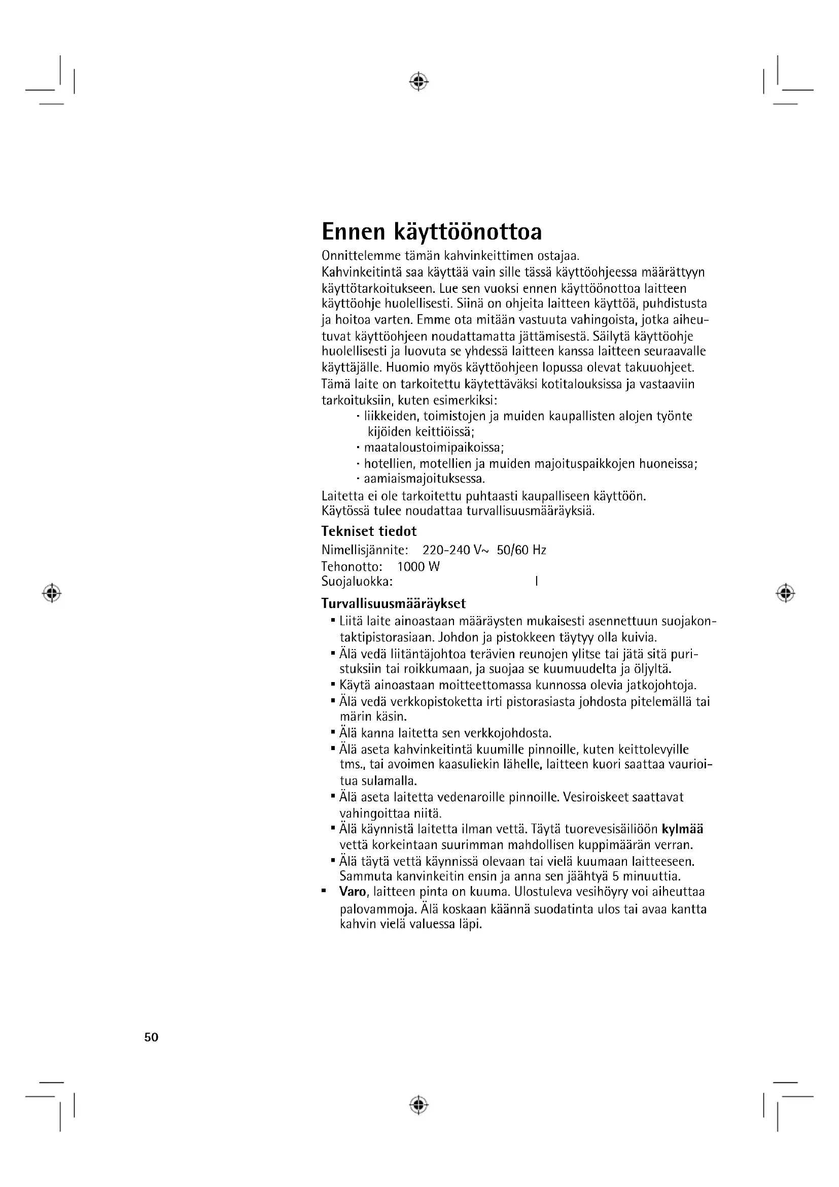 - Jos tämän laitteen liitäntäjohto vahingoittuu, niin se täytyy vaihtaa valmistajan asiakaspalvelun tai vastaavasti ammattitaitoisen henki- lön toimesta. Ammattitaidottomista korjauksista saattaa aiheutua vakavia vaaratilanteita käyttäjälle. Termoskannua koskevia ohjeita Kannu on suunniteltu tarjoilukannuksi ja pitää sisällön parhaiten lämpimänä, kun se on aivan täynnä. Osittain tyhjänä tai jäämämääriä säilytettäessä lämpö säilyy huomattavasti lyhyemmän ajan. Kannu huuhdellaan parhaiten kuumalla vedellä ennen kahvin valmistusta. Teknisistä syistä kannun sulkeva läpisuodatustulppa ei ole 100 % tiivis, jotta kannun tulpan voi avata helposti vielä kahvin jäähdyttyäkin. Kierrä kansi vain kevyesti kiinni kannun sulkemiseksi. Käytä täytettyä kannua vain pystyasennossa. Kahvin kaatamiseksi kierrä kantta vastapäivään, kunnes sen merkkinu- oli on kaatonokan yläpuolella. Kaksiseinämäinen jaloteräskannu on ehdottoman särkymätön. Siitä huolimatta sitä ei saa altistaa mekaaniselle rasitukselle. Huuhdo kannu säännöllisesti puhtaaksi. Jos veden rautahiukkasia jää kiinni jaloteräspinnalle, ne voivat aiheuttaa näihin kohtiin reikien syöpymistä. Poista siksi tällaiset kertymät heti jaloteräksen puhdistu- saineella. Käyttöönotto Keitä laitteessa kerran pelkkää vettä ilman kahvijauhetta ennen ensimmäistä käyttökertaa sekä silloin, jos laite on ollut käyttämättä pidempään. Täytä tällöin vesisäiliöön vettä vain 7 kupin merkkiin asti. Huuhtele lopuksi suodatin ja pannu kuumalla vedellä.52 Kellonajan asettaminen Kun pistotulppa kytketään pistorasiaan, näytössä näkyy „12:00“ Paina Prog-näppäintä. Näyttöön tulee tekstit „CLOCK“ ja kellonajan „12:00“ kaksoispiste vilkkuu. Voit asettaa nyt oikean kellonajan painamalla näppäimiä h ja min. Kun teksti „CLOCK“ katoaa näytöstä, kello alkaa käydä. Vahvistusta ei tarvita. Vinkki: Sähkökatkon jälkeen tai kun pistotulppa on irrotettu, kello- naika on asetettava uudelleen. Päällekytkeytymisajan ohjelmointi Automaattinen päällekytkeytyminen käynnistää kahvin keittoprosessin itsenäisesti haluttuun aikaan. Päällekytkeytymisajan voi ohjelmoida jopa 24 tuntia etukäteen. Paina kahdesti Prog-näppäintä. Näyttöön tulee teksti „TIMER“ ja kellonajan „00:00“ kaksoispiste vilkkuu. Voit nyt muuttaa päällek- ytkeytymisaikaa painamalla näppäimiä h ja min. Kun teksti „TIMER” katoaa näytöstä, uusi päällekytkeytymisaika on ajastettu. Voit tarkistaa päällekytkeytymisajan milloin tahansa painamalla kahde- sti Prog-näppäintä . Vinkki: Sähkökatkon jälkeen tai kun pistotulppa on irrotettu, päällek- ytkeytymisaika on asetettava uudelleen. Kahvin valmisjautaminen Kaada vain kylmää vettä vesisäiliöön. Vesimäärän näyttö osoittaa vesimäärää, jonka laite vaatii, jotta valmista kahvia saadaan haluttu määrä 125 ml:n kupillisia. Avaa kansi kahvijauheen täyttämistä varten. Taita auki 1 x 4 -kokoinen paperinen suodatinpussi ja aseta se suodattimeen. Suodatinpussi ei saa ulottua suodattimen reunan yli, joten sitä täytyy painaa kevyesti kädellä. Täytä suodattimeen tarvittava määrä kahvijauhetta. Yhtä kupillista kohden lasketaan mausta riippuen n. 5 - 7 g keskihienoksi jauhettua kahvia. Jos kahvi on liian hienoksi jauhettua, suodatin voi tulvia yli. Automaattinen päällekytkeytyminen Jos haluat ohjelmoida kahvin valmistuksen alkaamaan automaattisesti ajastettuun aikaan, paina kolmesti Prog-näppäintä. Oikeanpuoleinen merkkivalo palaa sinisenä. Kahvin valmistus alkaa automaattisesti ajastettuun aikaan. Oikeanpuo- leinen merkkivalo sammuu, ja vasen merkkivalo palaa sinisenä. Käynnistäminen heti Jos kahvi on tarkoitus valmistaa heti, paina Start/Stop-näppäintä . Vasen merkkivalo palaa sinisenä ja kahvin valmistus alkaa. Voit keskeyttää kahvin valmistuksen milloin tahansa painamalla uudelleen sinisenä palavaa Start/Stop-näppäintä