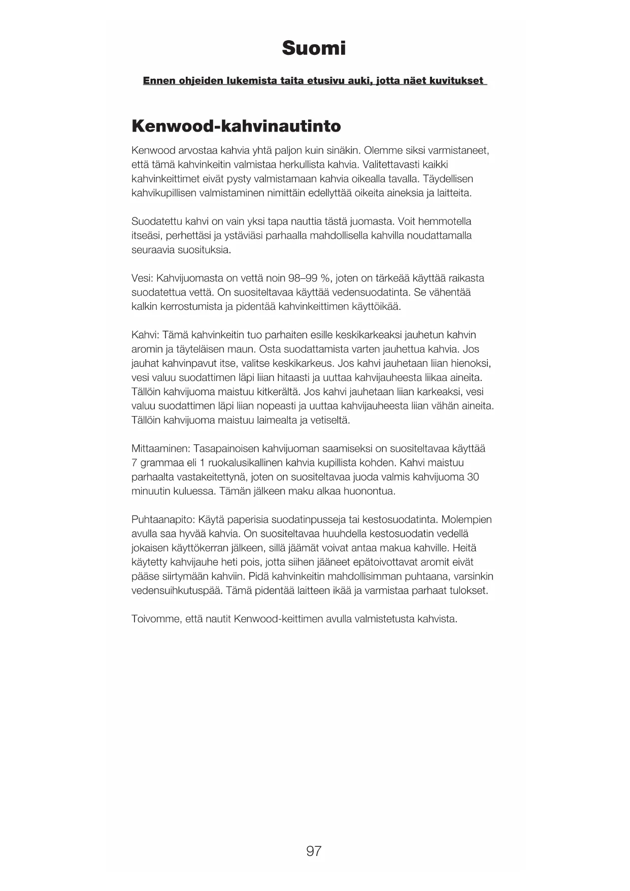ahvinkeittimet eivät pysty valmistamaan kahvia oikealla tavalla. Täydellisen kahvikupillisen valmistaminen nimittäin edellyttää oikeita aineksia ja laitteita. Suodatettu kahvi on vain yksi tapa nauttia tästä juomasta. Voit hemmotella itseäsi, perhettäsi ja ystäviäsi parhaalla mahdollisella kahvilla noudattamalla seuraavia suosituksia. Vesi: Kahvijuomasta on vettä noin 98–99 %, joten on tärkeää käyttää raikasta suodatettua vettä. On suositeltavaa käyttää vedensuodatinta. Se vähentää kalkin kerrostumista ja pidentää kahvinkeittimen käyttöikää. Kahvi: Tämä kahvinkeitin tuo parhaiten esille keskikarkeaksi jauhetun kahvin aromin ja täyteläisen maun. Osta suodattamista varten jauhettua kahvia. Jos jauhat kahvinpavut itse, valitse keskikarkeus. Jos kahvi jauhetaan liian hienoksi, vesi valuu suodattimen läpi liian hitaasti ja uuttaa kahvijauheesta liikaa aineita. Tällöin kahvijuoma maistuu kitkerältä. Jos kahvi jauhetaan liian karkeaksi, vesi valuu suodattimen läpi liian nopeasti ja uuttaa kahvijauheesta liian vähän aineita. Tällöin kahvijuoma maistuu laimealta ja vetiseltä. Mittaaminen: Tasapainoisen kahvijuoman saamiseksi on suositeltavaa käyttää 7 grammaa eli 1 ruokalusikallinen kahvia kupillista kohden. Kahvi maistuu parhaalta vastakeitettynä, joten on suositeltavaa juoda valmis kahvijuoma 30 minuutin kuluessa. Tämän jälkeen maku alkaa huonontua. Puhtaanapito: Käytä paperisia suodatinpusseja tai kestosuodatinta. Molempien avulla saa hyvää kahvia. On suositeltavaa huuhdella kestosuodatin vedellä jokaisen käyttökerran jälkeen, sillä jäämät voivat antaa makua kahville. Heitä käytetty kahvijauhe heti pois, jotta siihen jääneet epätoivottavat aromit eivät pääse siirtymään kahviin. Pidä kahvinkeitin mahdollisimman puhtaana, varsinkin vedensuihkutuspää. Tämä pidentää laitteen ikää ja varmistaa parhaat tulokset. Toivomme, että nautit Kenwood-keittimen avulla valmistetusta kahvista. Suomi