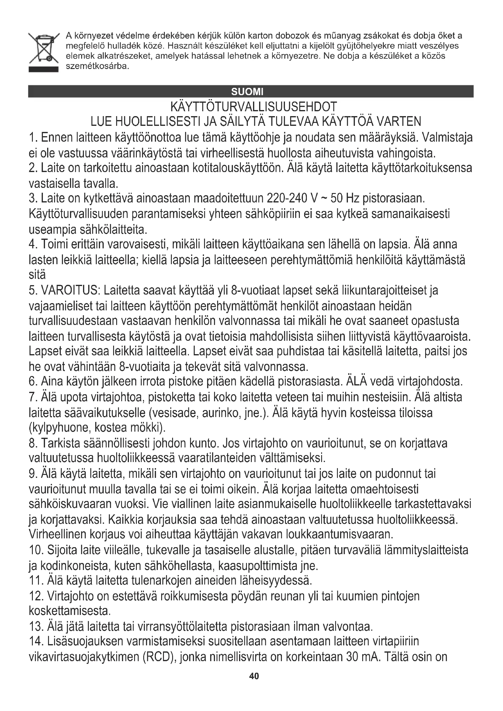 - Laite on kytkettäva ainoastaan maadoitettuun 220-240 V ~ 50 Hz pistorasiaan. Käytöturvallisuuden parantamiseksi yhteen sahköpiirin ei saa kytkeä samanaikaisesti useampia sahkolaitteita.