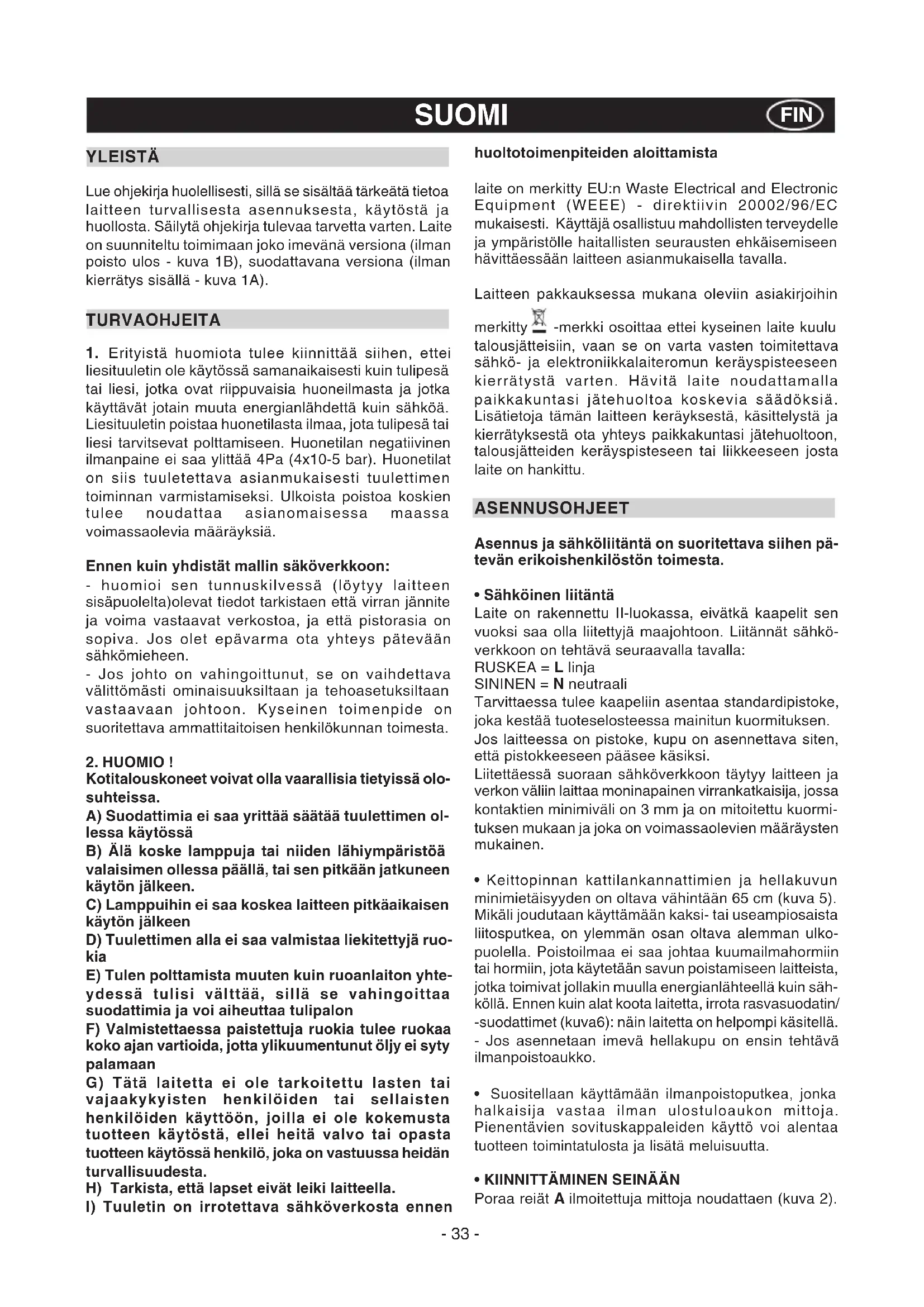 ADVARSLER- 33 - YLEISTÄ Lue ohjekirja huolellisesti, sillä se sisältää tärkeätä tietoa laitteen turvallisesta asennuksesta, käytöstä ja huollosta. Säilytä ohjekirja tulevaa tarvetta varten. Laite on suunniteltu toimimaan joko imevänä versiona (ilman poisto ulos - kuva 1B), suodattavana versiona (ilman kierrätys sisällä - kuva 1A). TURVAOHJEITA