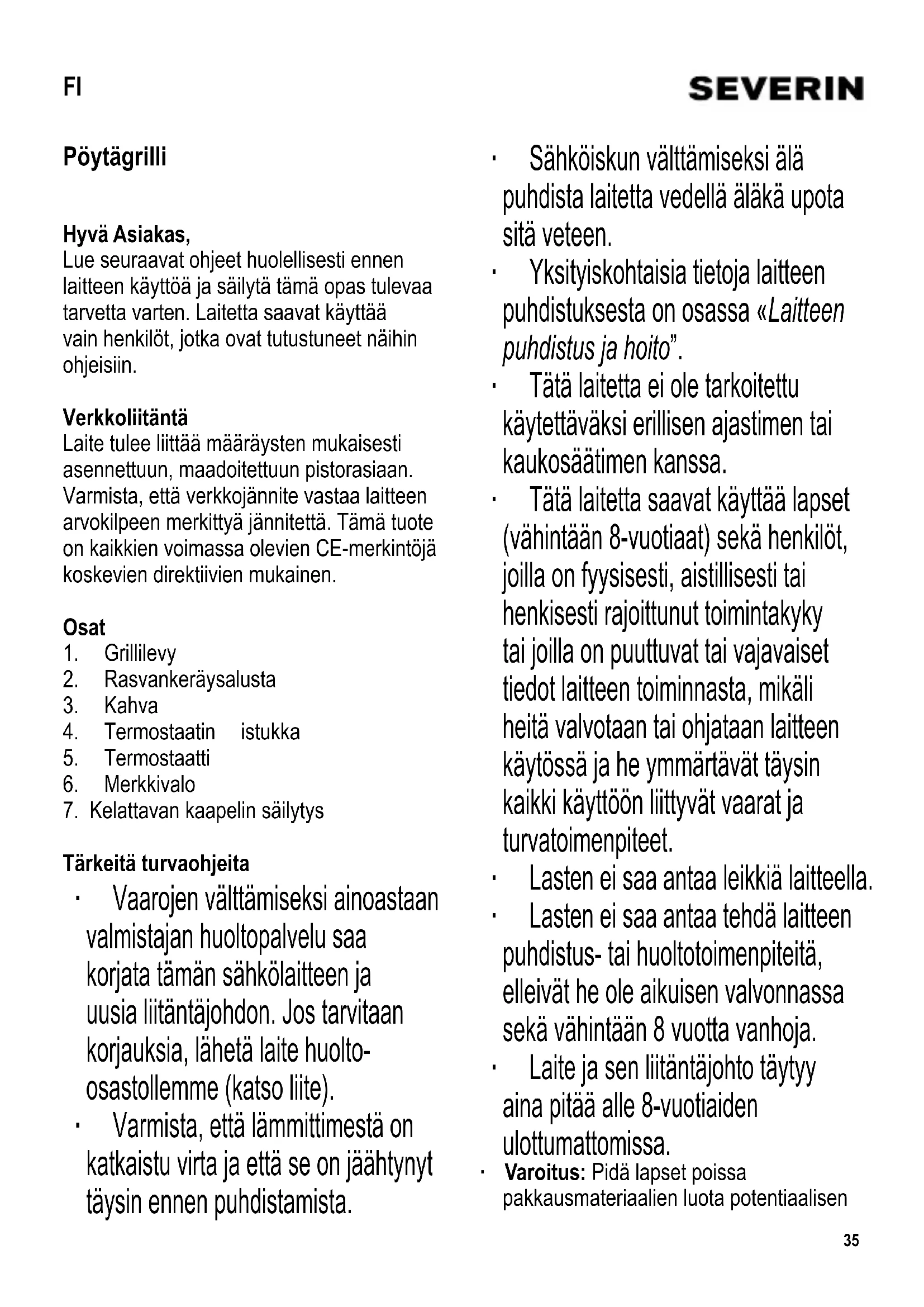 Tärkeitä turvaohjeita ∙ Vaarojen välttämiseksi ainoastaan valmistajan huoltopalvelu saa korjata tämän sähkölaitteen ja uusia liitäntäjohdon. Jos tarvitaan korjauksia, lähetä laite huolto- osastollemme (katso liite). ∙ Varmista, että lämmittimestä on katkaistu virta ja että se on jäähtynyt täysin ennen puhdistamista. ∙ Sähköiskun välttämiseksi älä puhdista laitetta vedellä äläkä upota sitä veteen. ∙ Yksityiskohtaisia tietoja laitteen puhdistuksesta on osassa «Laitteen puhdistus ja hoito”. ∙ Tätä laitetta ei ole tarkoitettu käytettäväksi erillisen ajastimen tai kaukosäätimen kanssa. ∙ Tätä laitetta saavat käyttää lapset (vähintään 8-vuotiaat) sekä henkilöt, joilla on fyysisesti, aistillisesti tai henkisesti rajoittunut toimintakyky tai joilla on puuttuvat tai vajavaiset tiedot laitteen toiminnasta, mikäli heitä valvotaan tai ohjataan laitteen käytössä ja he ymmärtävät täysin kaikki käyttöön liittyvät vaarat ja turvatoimenpiteet. ∙ Lasten ei saa antaa leikkiä laitteella. ∙ Lasten ei saa antaa tehdä laitteen puhdistus- tai huoltotoimenpiteitä, elleivät he ole aikuisen valvonnassa sekä vähintään 8 vuotta vanhoja. ∙ Laite ja sen liitäntäjohto täytyy aina pitää alle 8-vuotiaiden ulottumattomissa. ∙ Varoitus: Pidä lapset poissa pakkausmateriaalien luota potentiaalisen FI36 vaaratilanteen esim. tukehtumisvaaran vuoksi. ∙ Laitteen ulkopinnat ovat käytön aikana erittäin kuumia. Älä koske muihin laitteen osiin kuin kahvoihin. ∙ Tarkasta aina ennen laitteen käyttöä huolellisesti laitteen runko, liitäntäjohto ja mahdolliset asennetut lisäosat vaurioiden varalta. Jos laite on esimerkiksi pudonnut kovalle pinnalle tai liitäntäjohdon vetämiseen on käytetty liikaa voimaa, laitetta ei saa enää käyttää: näkymättömätkin vauriot voivat aiheuttaa laitetta käytettäessä vaaratilanteita. ∙ Aseta laite käytön aikana aina tukevalle, tasaiselle, vaakatasoiselle ja kuumuutta kestävälle pinnalle. Älä aseta laitetta kuumille pinnoille tai niiden lähelle tai avotuleen, kuten lämpölevyille tai kaasuliekille. ∙ Älä käytä laitetta ulkosalla. ∙ Älä käytä muuta kuin laitteen mukana tulevaa termostaattia. ∙ Kytke termostaatti aina sitä varten olevaan istukkaan laitteessa ennen laitteen kytkemistä verkkovirtaan. ∙ Älä koskaan poistu paikalta laitteen käytön aikana. ∙ Älä anna liitäntäjohdon koskea kuumia pintoja. ∙ Katkaise virta laitteesta aina käytön jälkeen ja irrota pistotulppa pistorasiasta. Tee samoin, - jos laitteessa on toimintahäiriö - ennen kuin puhdistat laitteen. ∙ Kun irrotat pistotulpan pistorasiasta, älä vedä liitäntäjohdosta vaan tartu aina pistotulpasta. ∙ Jos laite vahingoittuu väärinkäytön seurauksena tai siksi, että annettuja ohjeita ei ole noudatettu, valmistaja ei vastaa aiheutuneista vahingoista. ∙ Tämä laite on tarkoitettu kotitalouskäyttöön tai vastaavaan, kuten - toimistot ja muut kaupalliset ympäristöt - maatalousyritykset - hotellien, motellien jne. ja vastaavien yritysten asiakkaat - aamiaisen ja majoituksen tarjoavat majatalot. Käyttötarkoitus Tämä laite on sähköinen pöytägrilli, joka soveltuu vähärasvaiseen paistamiseen ja lihan, kalan, siipikarjan tai vihannesten grillaukseen. Ennen ensimmäistä käyttökertaa ∙ Poista kaikki pakkausmateriaali ennen ensikäyttöä. ∙ Puhdista grillilevy ja rasvankeräysalusta kostealla, nukkaamattomalla kankaalla. Kuivaa huolellisesti. ∙ Anna grillin kuumentua noin 5-10 minuutin ajan tyhjänä. Näin laitteesta poistuu haju, jota ilmenee tavallisesti ensimmäisen käytön yhteydessä. (Laitteesta voi tulla jonkin verran savua; tämä on normaalia, mutta tuuleta hyvin.) Merkkivalo Lämpenemisen aikana merkkivalo syttyy. Kun haluttu lämpötila on saavutettu, merkkivalo sammuu. Rasvankeräysalusta Varmista aina ennen käyttöä, että alusta on kiinnitetty grillilevyssä olevan aukon alle. Varmista, että rasvankeräysalusta ei vuoda yli käytön aikana. Tyhjennä alusta ajoissa. Kuuma alue Punaympyräisillä alueilla lämpötila on korkeampi kuin muualla grillilevyllä. Tämä alue soveltuu paksujen kappaleiden grillaukseen tai ruskistukseen ennen tarjoilua.37 Käyttö ∙ Varmista aina ennen käyttöä, että alusta on kiinnitetty grillilevyssä olevan aukon alle. ∙ Kiinnitä termostaatti istukkaan. ∙ Työnnä pistotulppa pistorasiaan. ∙ Valitse termostaatin säätimellä haluamasi lämpötila väliltä 1–5. Merkkivalo syttyy. ∙ Kun esisäädetty lämpötila saavutetaan, merkkivalo sammuu. ∙ Anna laitteen kuumeta 5–10 minuuttia ennen kuin aloitat grillaamisen. ∙ Aseta kypsennettävä ruoka grillilevylle. ∙ Jotta tarttumattomaksi käsitelty grillilevy ei vahingoittuisi, älä käytä metalliesineitä ruoan käsittelyyn. ∙ Varmista, että rasvankeräysalusta ei vuoda yli käytön aikana. Tyhjennä alusta ajoissa. ∙ Aseta käytön jälkeen termostaatin säädin asentoon “”. ∙ Irrota pistotulppa pistorasiasta. ∙ Irrota termostaatti istukasta. ∙ Anna laitteen jäähtyä ennen puhdistusta. Laitteen puhdistus ja hoito ∙ Ennen puhdistusta irrota pistotulppa pistorasiasta, termostaatti istukasta ja anna laitteen jäähtyä. ∙ Sähköiskun välttämiseksi älä puhdista laitetta vedellä äläkä upota sitä veteen. ∙ Älä käytä hankaavia tai liian voimakkaita puhdistusaineita. ∙ Termostaatin saa puhdistaa vain pyyhkimällä hieman kostealla, nukkaantumattomalla kankaalla. ∙ Puhdista grillilevy ja kahvat kuumalla saippuavedellä ja kuivaa huolellisesti pesun jälkeen. ∙ Kaada varovasti rasva rasvanpoistolevyltä. Pese levy kuumalla saippuavedellä. Kuivaa kaikki osat huolellisesti puhdistuksen jälkeen. Kelattavan kaapelin säilytys Jotta tilaa säästetään laitteen varastoinnin aikana, termostaatti voidaan sijoittaa laitteen jalustaan ja kaapeli voidaan kelata. Älä käytä kaapelin säilytystä, ellei laite ole