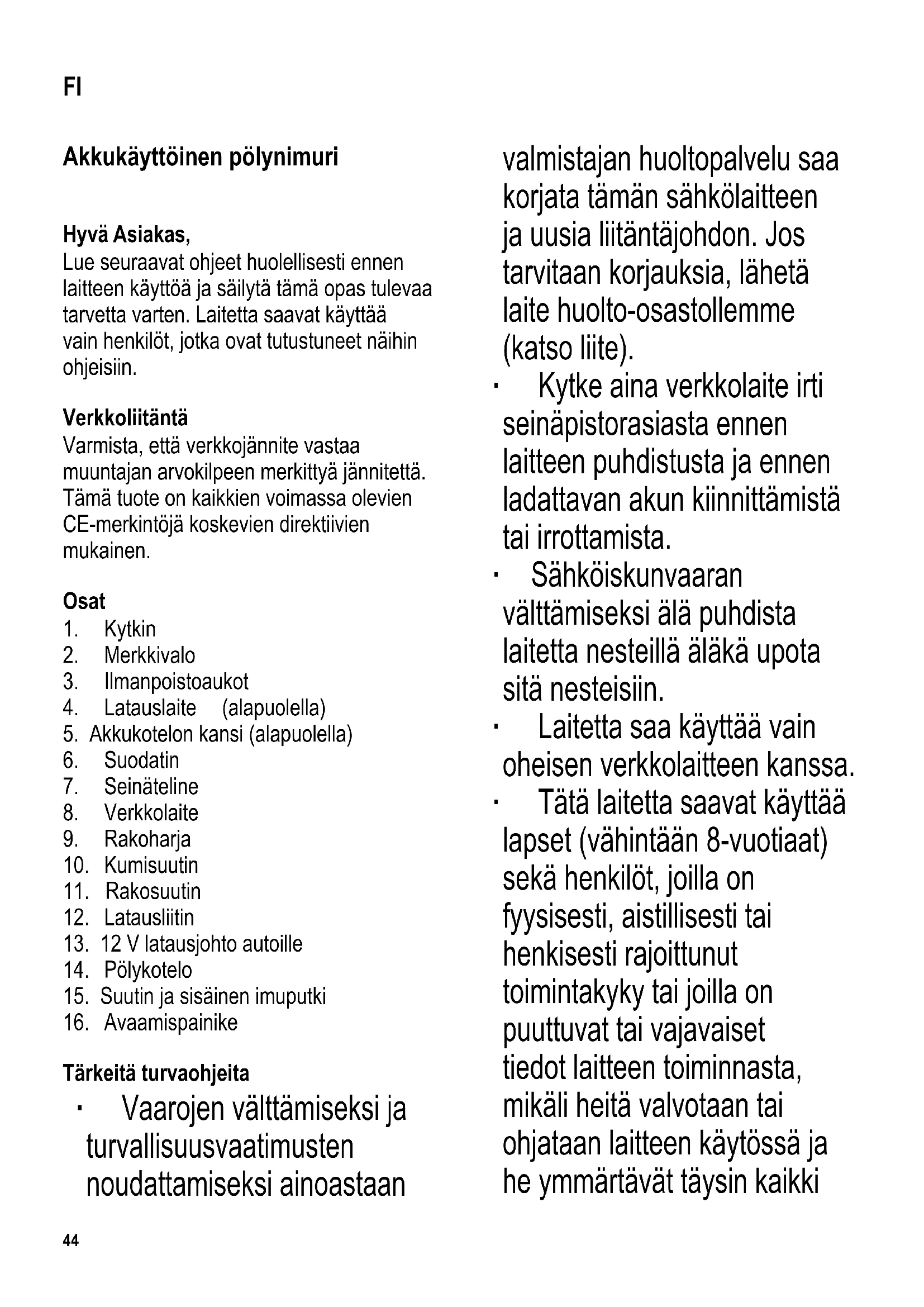 Tärkeitä turvaohjeita ∙ Vaarojen välttämiseksi ja turvallisuusvaatimusten noudattamiseksi ainoastaan valmistajan huoltopalvelu saa korjata tämän sähkölaitteen ja uusia liitäntäjohdon. Jos tarvitaan korjauksia, lähetä laite huolto-osastollemme (katso liite). ∙ Kytke aina verkkolaite irti seinäpistorasiasta ennen laitteen puhdistusta ja ennen ladattavan akun kiinnittämistä tai irrottamista. ∙ Sähköiskun vaaran välttämiseksi älä puhdista laitetta nesteillä äläkä upota sitä nesteisiin. ∙ Laitetta saa käyttää vain oheisen verkkolaitteen kanssa. ∙ Tätä laitetta saavat käyttää lapset (vähintään 8-vuotiaat) sekä henkilöt, joilla on fyysisesti, aistillisesti tai henkisesti rajoittunut toimintakyky tai joilla on puuttuvat tai vajavaiset tiedot laitteen toiminnasta, mikäli heitä valvotaan tai ohjataan laitteen käytössä ja he ymmärtävät täysin kaikki FI45 käyttöön liittyvät vaarat ja turvatoimenpiteet. ∙ Lasten ei saa antaa leikkiä laitteella. ∙ Lasten ei saa antaa tehdä laitteen puhdistus- tai huoltotoimenpiteitä, elleivät he ole valvonnassa. ∙ Laite ja sen liitäntäjohto täytyy aina pitää alle 8-vuotiaiden ulottumattomissa. ∙ Varoitus: Pidä lapset poissa pakkausmateriaalien luota potentiaalisen vaaratilanteen esim. tukehtumisvaaran vuoksi. ∙ Älä käytä pölynimuria ilman suodatinta. ∙ Tarkasta aina ennen laitteen käyttöä huolellisesti laitteen runko, liitäntäjohto ja mahdolliset asennetut lisäosat vaurioiden varalta. Jos laite on esimerkiksi pudonnut kovalle pinnalle tai liitäntäjohdon vetämiseen on käytetty liikaa voimaa, laitetta ei saa enää käyttää: näkymättömätkin vauriot voivat aiheuttaa laitetta käytettäessä vaaratilanteita. ∙ Verkkolaitteen virtajohtoa ei saa taittaa ja se täytyy reitittää niin, ettei siihen voi vahingossa kompastua. ∙ Älä imuroi koskaan kuumia, happoisia tai syttyviä aineita. Älä yritä imuroida hienoja pölyjä, kuten jauhoja tai värijauheita. ∙ Älä anna laitteen tai liitäntäjohdon koskettaa kuumia pintoja tai joutua kosketuksiin lämmönlähteiden kanssa. ∙ Akkua ei saa missään tapauksessa yrittää purkaa; sitä ei saa altistaa korkeille lämpötiloille (esim. suoralle auringonvalolle); älä hävitä akkua polttamalla. ∙ Älä oikosuluta akun napoja eli älä kosketa kumpaakin liitintä samanaikaisesti varsinkaan sähköä johtavilla esineillä. Akkuja täytyy säilyttää siten, että ne eivät voi vahingossa joutua oikosulkuun metalliesineiden tai muiden akkujen vuoksi. ∙ Vaurioituneita akkuja ei saa enää käyttää. Irrota akut varoen laitteesta ja hävitä ne voimassa olevan lainsäädännön mukaisesti. Vältä koskettamasta vuotavaa nestettä. ∙ Valmistaja ei ole vastuussa mahdollisista vaurioista, jos ne johtuvat laitteen väärinkäytöstä tai käyttöohjeiden laiminlyömisestä. ∙ Tämä laite on tarkoitettu kotitalouskäyttöön tai vastaavaan, kuten - ruokalat, toimistot ja muut kaupalliset ympäristöt - maatalousyritykset - hotellien, motellien jne. ja vastaavien yritysten asiakkaat - aamiaisen ja majoituksen tarjoavat majatalot. Asennus Seinäteline on suunniteltu laitteen säilytystä varten ja toimii myös latauslaitteena. Kytke ensin latausliitin seinätelineeseen ylöspäin. Asenna seinäteline pystysuoraan asentoon pistorasian lähelle laitteen mukana toimitettujen ruuvien avulla. Sekä rakosuutinta ja rakoharjaa että kumisuutinta voidaan säilyttää telineen vasemmalla ja oikealla puolella.46 Ladattavan akun liittäminen Akkukotelo sijaitsee laitteen alapuolella. Avaa kotelo irrottamalla kotelon kannen ruuvi sopivalla ruuvimeisselillä. Nosta akku irti ja työnnä kaksi johtimissa olevaa liitintä yhteen (päälaitteen ja akun); varmista, että salpa lukkiutuu pidäkkeen yli. Aseta akku laitteeseen ja sijoita liittimet akun vierelle. Aseta akkukotelon kansi takaisin paikalleen ja kiristä ruuvi. Imurin lataaminen Ennen imurin ensimmäistä käyttöä on akkua ladattava noin 10 tunnin ajan. ∙ Työnnä verkkolaite seinäpistorasiaan. ∙ Aseta kytkin pois päältä -asentoon. ∙ Aseta imuri seinätelineeseen. Latausprosessi alkaa automaattisesti ja merkkivalo palaa punaisena. Kun merkkivalo sammuu, laite on käyttövalmis. ∙ Laitteen voi jättää jatkuvaan lataukseen ilman että siitä koituu vaaraa tai vahinkoa. Näin se on täysin ladattu ja käyttövalmis tarvittaessa ∙ Latauksen aikana verkkolaite lämpenee. Tämä on normaalia eikä tarkoita, että laite olisi viallinen. ∙ Jos pölynimuria ei käytetä pitkään aikaan, akun kapasiteetti saattaa pienentyä jonkin verran. Akku palautuu kuitenkin täyteen kapasiteettiinsa useamman lataus- ja tyhjennysprosessin jälkeen. Käyttö 12 V:n latausjohdon kanssa ∙ Akku voidaan ladata 12 V -liittimellä auton tupakansytyttimen liitännän kautta. ∙ Työnnä latausjohdon pieni pistoke imurin 12 v:n jakkiin ja suurempi pistoke auton tupakansytyttimen liitäntään. ∙ Imurin virta tulee nyt suoraan auton sähköjärjestelmästä; merkkivalo palaa punaisena. Nestemäisten aineiden imurointi Varmista ennen nestemäisten aineiden imurointia, että kumisuutin on kokonaan asennettuna imuaukkoon. Rakosuutin Rakosuuttimen voi asentaa imuaukkoon rakojen, nurkkien ja muiden vaikeapääsyisten paikkojen imuroimiseksi. Rakoharja Rakoharjan voi asentaa rakosuuttimeen, ja se sopii epätasaisten pintojen, kuten näppäimistöjen yms. puhdistamiseen. Käyttö ∙ Ota pölynimuri pois seinätelineestä. ∙ Kiinnitä tarvittaessa haluamasi suutin imuaukkoon. ∙ Kytke virta laitteeseen kytkimellä. Merkkivalo syttyy vihreänä. ∙ Varmista aina, että pölykotelo tyhjennetään hyvissä ajoin, ennen kuin sinne kerääntynyt pöly tai nestemäiset aineet saavuttavat sisäisen imuputken tason (katso maksimimerkintä). ∙ Jos akkuvirta vähenee käytön aikana, vihreä merkkivalo alkaa vilkkua ja laite kytkeytyy hetken päästä pois päältä; näin estetään akun li