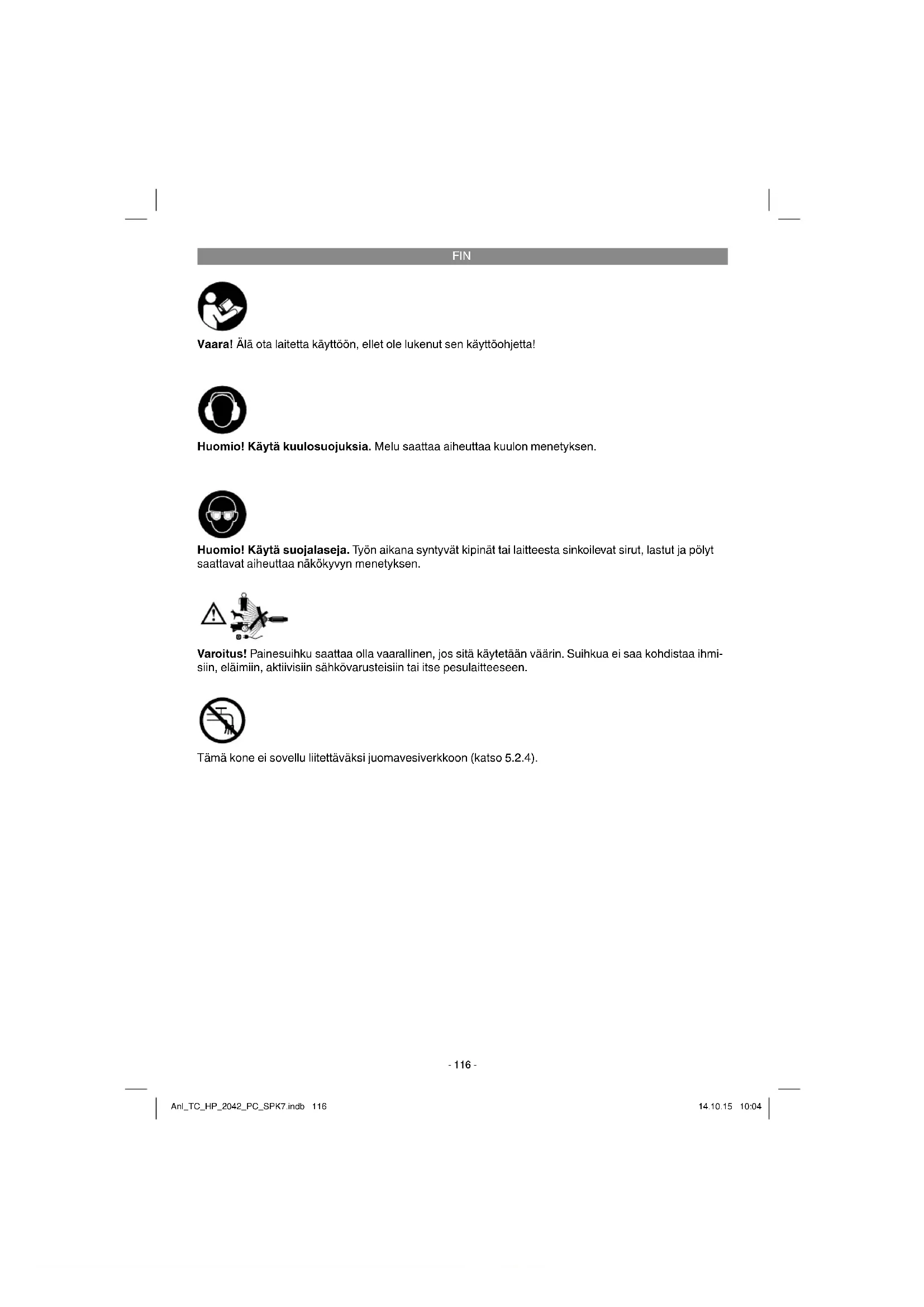 Huomio! Käytä kuulosuojuksia. Melu saattaa aiheuttaa kuulon menetyksen. Huomio! Käytä suojalaseja. Työn aikana syntyvät kipinät tai laitteesta sinkoilevat sirut, lastut ja pölyt saattavat aiheuttaa näkökyvyn menetyksen. Vaara! Älä ota laitetta käyttöön, ellet ole lukenut sen käyttöohjetta! Varoitus! Painesuihku saattaa olla vaarallinen, jos sitä käytetään väärin. Suihkua ei saa kohdistaa ihmi- siin, eläimiin, aktiivisiin sähkövarusteisiin tai itse pesulaitteeseen. Tämä kone ei sovellu liitettäväksi juomavesiverkkoon (katso 5.2.4). Anl_TC_HP_2042_PC_SPK7.indb 116Anl_TC_HP_2042_PC_SPK7.indb 116 14.10.15 10:0414.10.15 10:04FIN
