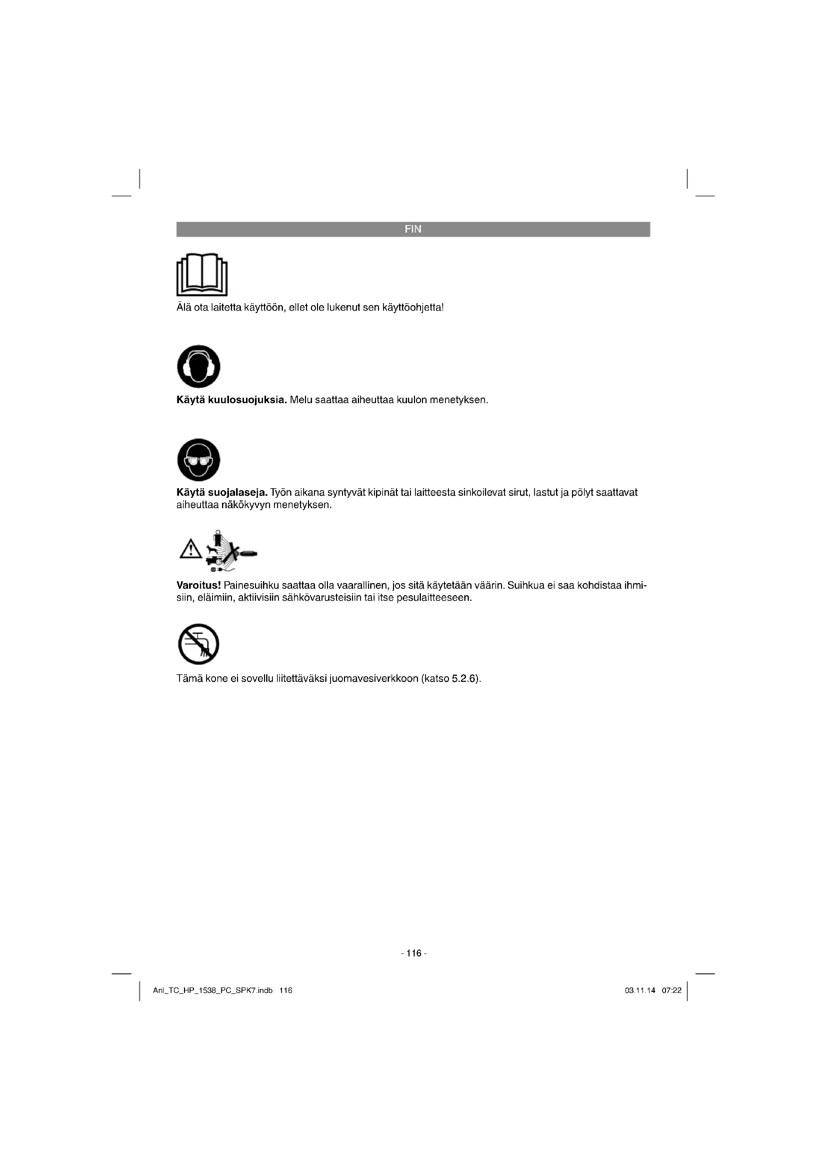 Käytä kuulosuojuksia. Melu saattaa aiheuttaa kuulon menetyksen. Käytä suojalaseja. Työn aikana syntyvät kipinät tai laitteesta sinkoilevat sirut, lastut ja pölyt saattavat aiheuttaa näkökyvyn menetyksen. Älä ota laitetta käyttöön, ellet ole lukenut sen käyttöohjetta! Varoitus! Painesuihku saattaa olla vaarallinen, jos sitä käytetään väärin. Suihkua ei saa kohdistaa ihmi- siin, eläimiin, aktiivisiin sähkövarusteisiin tai itse pesulaitteeseen. Tämä kone ei sovellu liitettäväksi juomavesiverkkoon (katso 5.2.6). Anl_TC_HP_1538_PC_SPK7.indb 116Anl_TC_HP_1538_PC_SPK7.indb 116 03.11.14 07:2203.11.14 07:22FIN