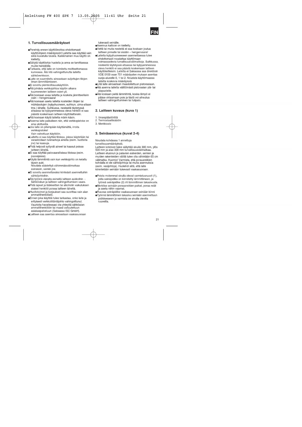 Noudata kohdassa 1 annettuja turvallisuusmääräyksiä. Laitteen koteloon tulee säilyttää sivulle 300 mm, ylös 500 mm ja alas 300 mm turvallisuusvälimatkaa. Laitteen etusivun ja palavien esineiden, seinien ja muiden rakenteiden välillä tulee olla vähintään 65 cm välimatka. Huomio! Varmista, että porausreikien kohdalla ei ole sähköjohtoja tai muita asennuksia (esim. vesijohtoja). Huolehdi siitä, että laite kiinnitetään seinään tukevasti vaakasuoraan. 앬 Poista molemmat sivulla olevat varmistusruuvit (1), joilla seinäpidike on kiinnitetty lämmittimeen, ja työnnä seinäpidike (2) irti lämmittimen takasivusta. 앬 Merkitse seinään porausreikien paikat, poraa reiät ja aseta niihin vaarnat. 앬 Ruuvaa seinäpidike vaakasuoraan seinään kiinni 앬 Työnnä lämmittimen takasivu seinään asennettuun pidikkeeseen ja varmista se sivulla olevilla ruuveilla. Anleitung FW 400 SPK 7 13.05.2005 11:41 Uhr Seite 2122 FIN