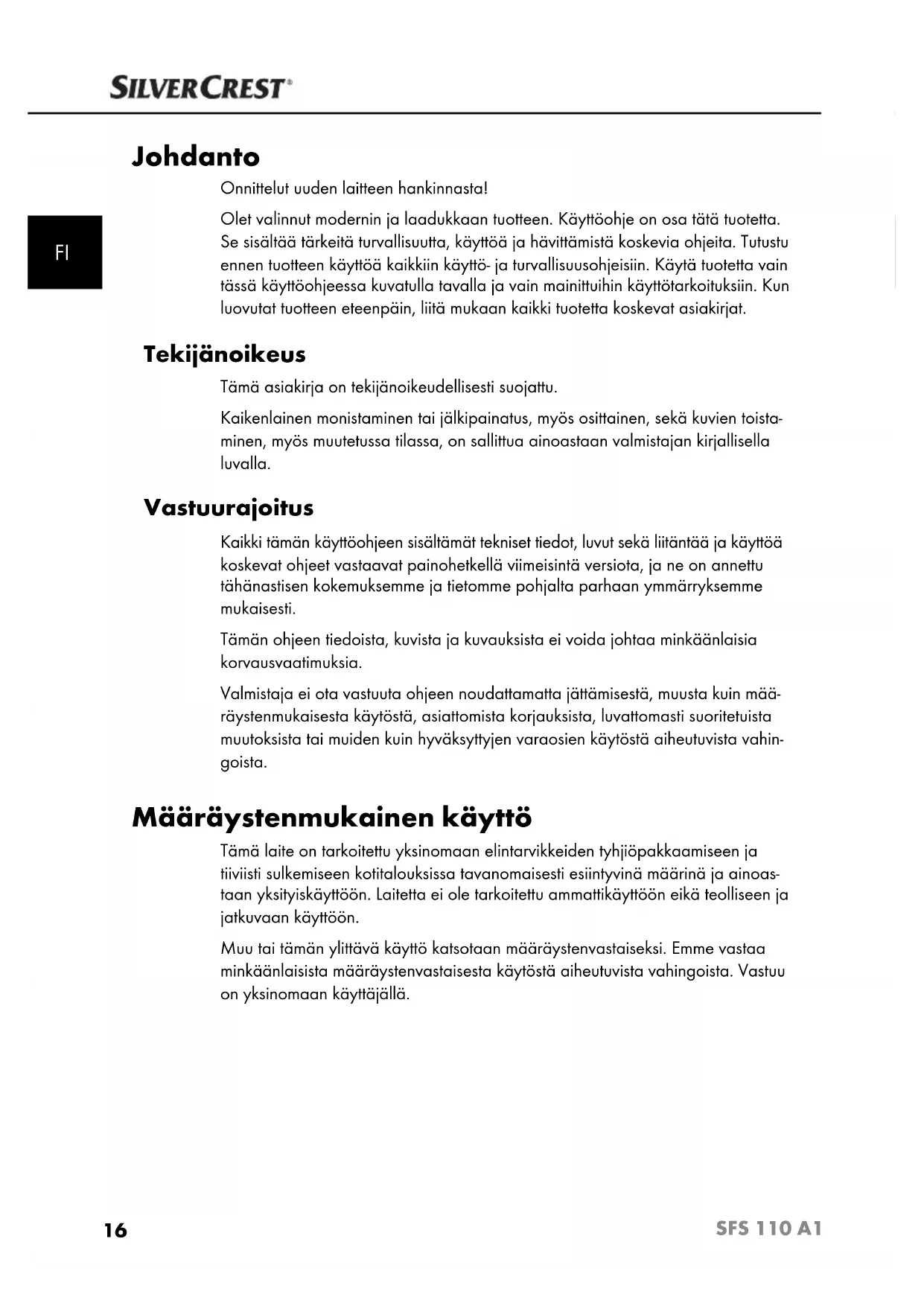 Johdanto Onnittelut uuden laitteen hankinnasta! Olet valinnut modernin ja laadukkaan tuotteen. Käyttöohje on osa tätä tuotetta. Se sisältää tärkeitä turvallisuutta, käyttöä ja hävittämistä koskevia ohjeita. Tutustu ennen tuotteen käyttöä kaikkiin käyttö- ja turvallisuusohjeisiin. Käytä tuotetta vain tässä käyttöohjeessa kuvatulla tavalla ja vain mainittuihin käyttötarkoituksiin. Kun luovutat tuotteen eteenpäin, liitä mukaan kaikki tuotetta koskevat asiakirjat. Tekijänoikeus Tämä asiakirja on tekijänoikeudellisesti suojattu. Kaikenlainen monistaminen tai jälkipainatus, myös osittainen, sekä kuvien toista- minen, myös muutetussa tilassa, on sallittua ainoastaan valmistajan kirjallisella luvalla. Vastuurajoitus Kaikki tämän käyttöohjeen sisältämät tekniset tiedot, luvut sekä liitäntää ja käyttöä koskevat ohjeet vastaavat painohetkellä viimeisintä versiota, ja ne on annettu tähänastisen kokemuksemme ja tietomme pohjalta parhaan ymmärryksemme mukaisesti. Tämän ohjeen tiedoista, kuvista ja kuvauksista ei voida johtaa minkäänlaisia korvausvaatimuksia. Valmistaja ei ota vastuuta ohjeen noudattamatta jättämisestä, muusta kuin mää- räystenmukaisesta käytöstä, asiattomista korjauksista, luvattomasti suoritetuista muutoksista tai muiden kuin hyväksyttyjen varaosien käytöstä aiheutuvista vahin- goista. Määräystenmukainen käyttö Tämä laite on tarkoitettu yksinomaan elintarvikkeiden tyhjiöpakkaamiseen ja tiiviisti sulkemiseen kotitalouksissa tavanomaisesti esiintyvinä määrinä ja ainoas- taan yksityiskäyttöön. Laitetta ei ole tarkoitettu ammattikäyttöön eikä teolliseen ja jatkuvaan käyttöön. Muu tai tämän ylittävä käyttö katsotaan määräystenvastaiseksi. Emme vastaa minkäänlaisista määräystenvastaisesta käytöstä aiheutuvista vahingoista. Vastuu on yksinomaan käyttäjällä.17 SFS 110 A1