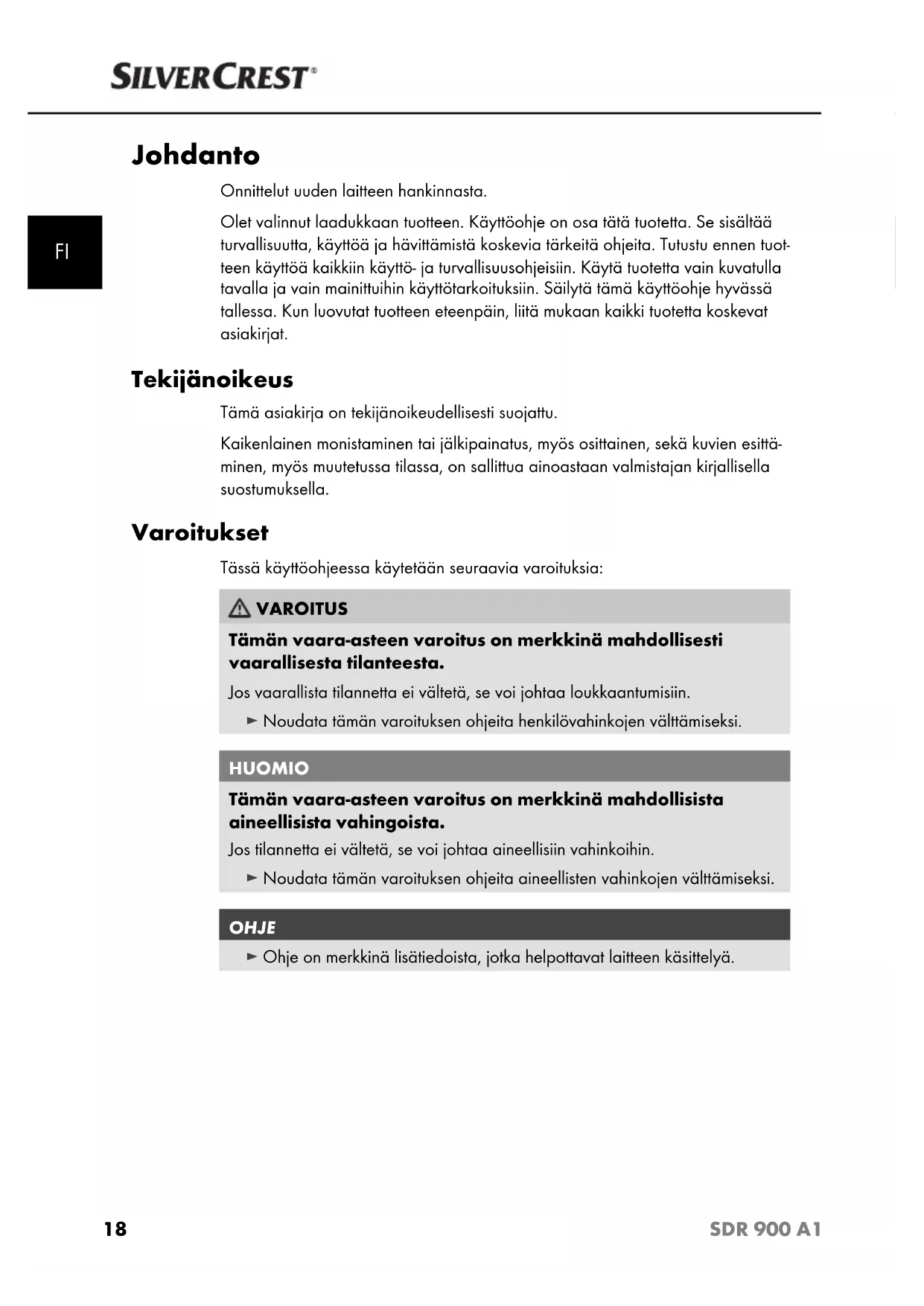 Johdanto Onnittelut uuden laitteen hankinnasta. Olet valinnut laadukkaan tuotteen. Käyttöohje on osa tätä tuotetta. Se sisältää turvallisuutta, käyttöä ja hävittämistä koskevia tärkeitä ohjeita. Tutustu ennen tuot- teen käyttöä kaikkiin käyttö- ja turvallisuusohjeisiin. Käytä tuotetta vain kuvatulla tavalla ja vain mainittuihin käyttötarkoituksiin. Säilytä tämä käyttöohje hyvässä tallessa. Kun luovutat tuotteen eteenpäin, liitä mukaan kaikki tuotetta koskevat asiakirjat. Tekijänoikeus Tämä asiakirja on tekijänoikeudellisesti suojattu. Kaikenlainen monistaminen tai jälkipainatus, myös osittainen, sekä kuvien esittä- minen, myös muutetussa tilassa, on sallittua ainoastaan valmistajan kirjallisella suostumuksella. Varoitukset Tässä käyttöohjeessa käytetään seuraavia varoituksia: VAROITUS Tämän vaara-asteen varoitus on merkkinä mahdollisesti vaarallisesta tilanteesta. Jos vaarallista tilannetta ei vältetä, se voi johtaa loukkaantumisiin. ► Noudata tämän varoituksen ohjeita henkilövahinkojen välttämiseksi. HUOMIO Tämän vaara-asteen varoitus on merkkinä mahdollisista aineellisis ta vahingoista. Jos tilannetta ei vältetä, se voi johtaa aineellisiin vahinkoihin. ► Noudata tämän varoituksen ohjeita aineellisten vahinkojen välttämiseksi. OHJE ► Ohje on merkkinä lisätiedoista, jotka helpottavat laitteen käsittelyä. IB_103808_SDR900A1_LB3.indb 18IB_103808_SDR900A1_LB3.indb 18 10.11.14 08:4610.11.14 08:4619 SDR 900 A1
