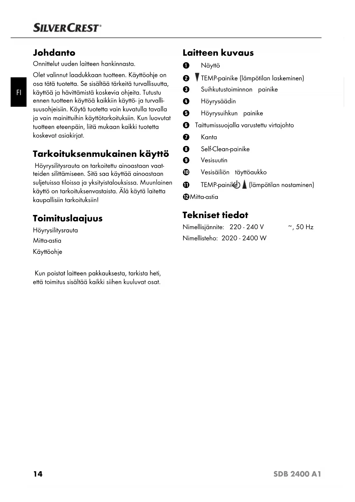 VAARA - SÄHKÖISKU! ► Älä missään tapauksessa käytä höyrysilitysrautaa, jos siinä on näkyviä vaurioita, se on pudonnut tai siitä vuotaa vettä. Anna laite ensin pätevän ammattihenkilöstön korjattavaksi. ► Älä käytä laitetta, jos virtajohdon taittumissuoja on vaurioitunut! ► 8 vuotta täyttäneet lapset ja henkilöt, joilla on puutteelliset fyysiset, aisti- mukselliset tai henkiset kyvyt tai joilta puuttuu kokemus ja/tai tietoa, saavat käyttää laitetta vain valvonnan alaisina, tai jos heitä on opastettu laitteen turvalliseen käyttöön, ja he ovat ymmärtäneet laitteen käyttöön liittyvät vaa- rat. Lapset eivät saa leikkiä laitteella. Lapset eivät saa suorittaa puhdistusta eivätkä käyttäjähuoltoa ilman valvontaa. VAROITUS! LOUKKAANTUMISVAARA! ► Tartu kuumaan höyrysilitysrautaan ainoastaan sen kahvasta. ► Lapsia on valvottava ja on varmistettava, etteivät he pääse leikkimään laitteella. ► Älä koskaan pidä käsiäsi höyrysuihkussa, äläkä tartu kuumiin metalliosiin. ► Älä koskaan avaa vesisäiliön täyttöaukkoa käytön aikana. Anna höyrysili- tysraudan ensin jäähtyä ja irrota verkkopistoke pistorasiasta. ► Höyrysilitysrauta ja sen liitosjohto on pidettävä päällekytkennän ja jäähty- misen aikana poissa alle 8-vuotiaiden lasten ulottuvilta. ► Höyrysilitysrautaa ei saa jättää ilman valvontaa sen ollessa kytkettynä sähköverkkoon.17 SDB 2400 A1