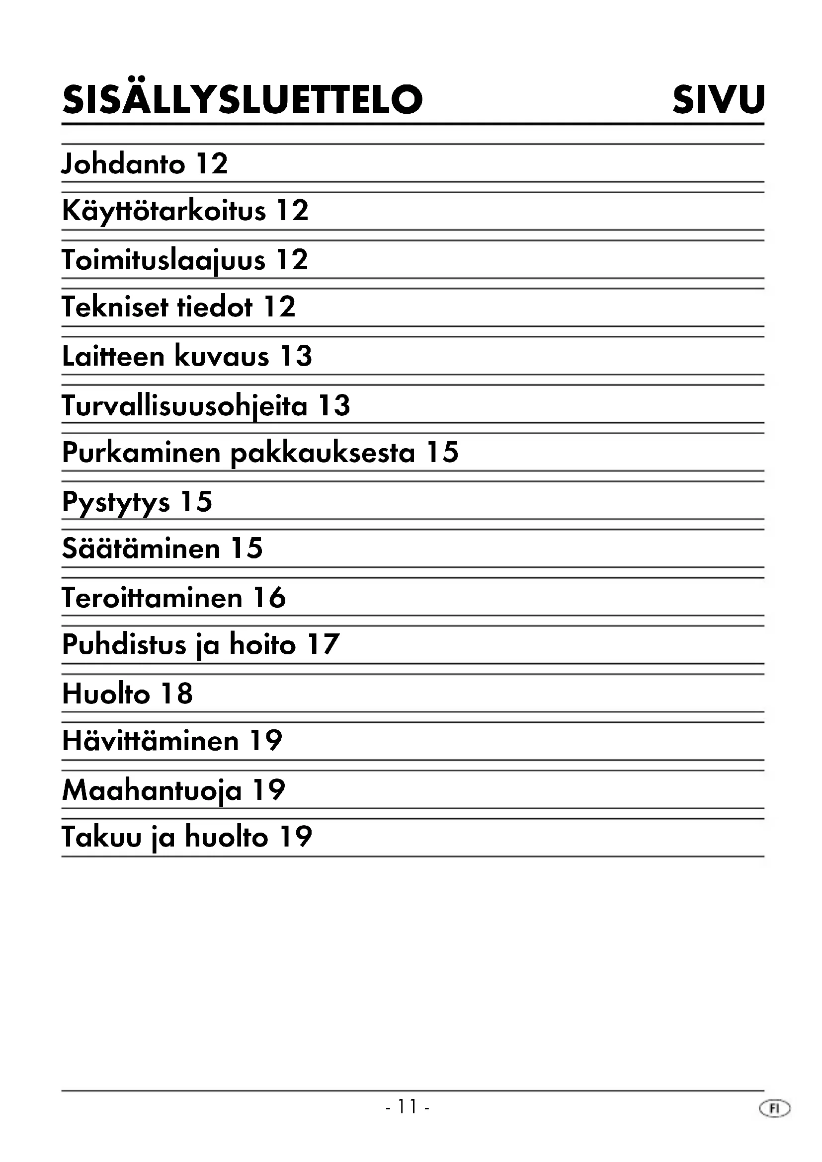 Johdanto 12 Käyttötarkoitus 12 Toimituslaajuus 12 Tekniset tiedot 12 Laitteen kuvaus 13 Turvallisuusohjeita 13 Purkaminen pakkauksesta 15 Pystytys 15 Säätäminen 15 Teroittaminen 16 Puhdistus ja hoito 17 Huolto 18 Hävittäminen 19 Maahantuoja 19 Takuu ja huolto 19- 12 - Johdanto Sydämellinen onnittelumme uuden laitteesi johdosta. Olet valinnut laadukkaan tuotteen. Käyttöohje on osa tätä tuotetta. Se sisäl- tää tärkeitä turvallisuutta, käyttöä ja hävittämistä koskevia ohjeita. Tutustu kaikkiin käyttö- ja turvaohjeisiin ennen tuotteen käyttöä. Käytä tuotetta vain kuvatulla tavalla ja vain mainittuihin käyttötarkoituksiin. Anna myös kaikki asiakirjat edelleen luovuttaessasi tuotteen eteenpäin. Käyttötarkoitus Tuote on tarkoitettu veitsien, ruuvimeisselien ja saksien teroittamiseen ja hiomiseen yksityisissä kotitalouksissa. Tuotetta ei ole tarkoitettu kaupalliseen tai teolliseen käyttöön. Toimituslaajuus 1 x Sähkökäyttöinen yleisteroitin 1 x Käyttöohje Tekniset tiedot Tehontarve: enint. 20 W Verkkojännite: 230 V