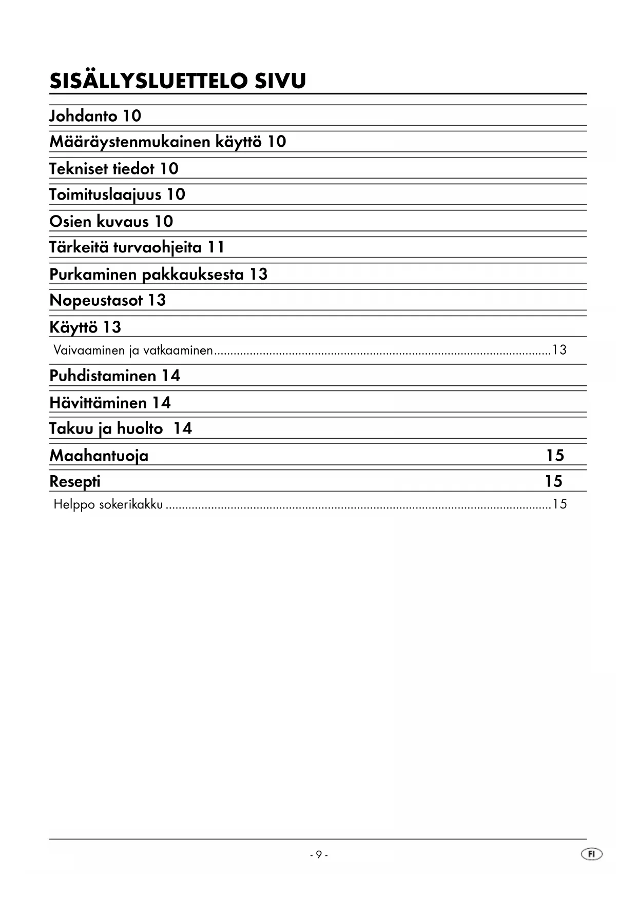 Johdanto 10 Määräystenmukainen käyttö 10 Tekniset tiedot 10 Toimituslaajuus 10 Osien kuvaus 10 Tärkeitä turvaohjeita 11 Purkaminen pakkauksesta 13 Nopeustasot 13 Käyttö 13 Vaivaaminen ja vatkaaminen........................................................................................................13 Puhdistaminen 14 Hävittäminen 14 Takuu ja huolto 14 Maahantuoja 15 Resepti 15 Helppo sokerikakku .......................................................................................................................15- 10 -