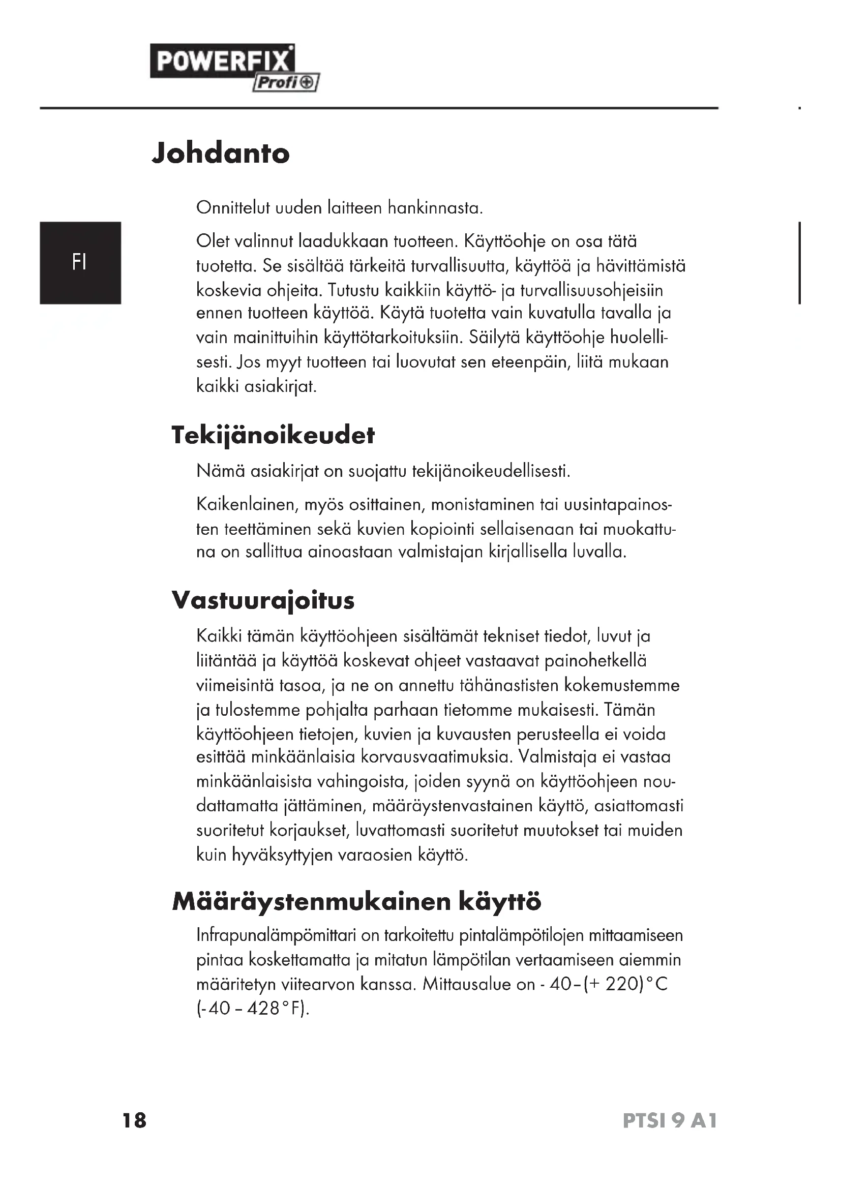 Johdanto Onnittelut uuden laitteen hankinnasta. Olet valinnut laadukkaan tuotteen. Käyttöohje on osa tätä tuotetta. Se sisältää tärkeitä turvallisuutta, käyttöä ja hävittämistä koskevia ohjeita. Tutustu kaikkiin käyttö- ja turvallisuusohjeisiin ennen tuotteen käyttöä. Käytä tuotetta vain kuvatulla tavalla ja vain mainittuihin käyttötarkoituksiin. Säilytä käyttöohje huolelli- sesti. Jos myyt tuotteen tai luovutat sen eteenpäin, liitä mukaan kaikki asiakirjat. Tekijänoikeudet Nämä asiakirjat on suojattu tekijänoikeudellisesti. Kaikenlainen, myös osittainen, monistaminen tai uusintapainos- ten teettäminen sekä kuvien kopiointi sellaisenaan tai muokattu- na on sallittua ainoastaan valmistajan kirjallisella luvalla. Vastuurajoitus Kaikki tämän käyttöohjeen sisältämät tekniset tiedot, luvut ja liitäntää ja käyttöä koskevat ohjeet vastaavat painohetkellä viimeisintä tasoa, ja ne on annettu tähänastisten kokemustemme ja tulostemme pohjalta parhaan tietomme mukaisesti. Tämän käyttöohjeen tietojen, kuvien ja kuvausten perusteella ei voida esittää minkäänlaisia korvausvaatimuksia. Valmistaja ei vastaa minkäänlaisista vahingoista, joiden syynä on käyttöohjeen nou- dattamatta jättäminen, määräystenvastainen käyttö, asiattomasti suoritetut korjaukset, luvattomasti suoritetut muutokset tai muiden kuin hyväksyttyjen varaosien käyttö. Määräystenmukainen käyttö Infrapunalämpömittari on tarkoitettu pintalämpötilojen mittaamiseen pintaa koskettamatta ja mitatun lämpötilan vertaamiseen aiemmin määritetyn viitearvon kanssa. Mittausalue on - 40–(+ 220)°C (- 40 – 428°F). IB_100042_PTSI9A1_LB3.indb 18 12.05.14 14:0819 PTSI 9 A1