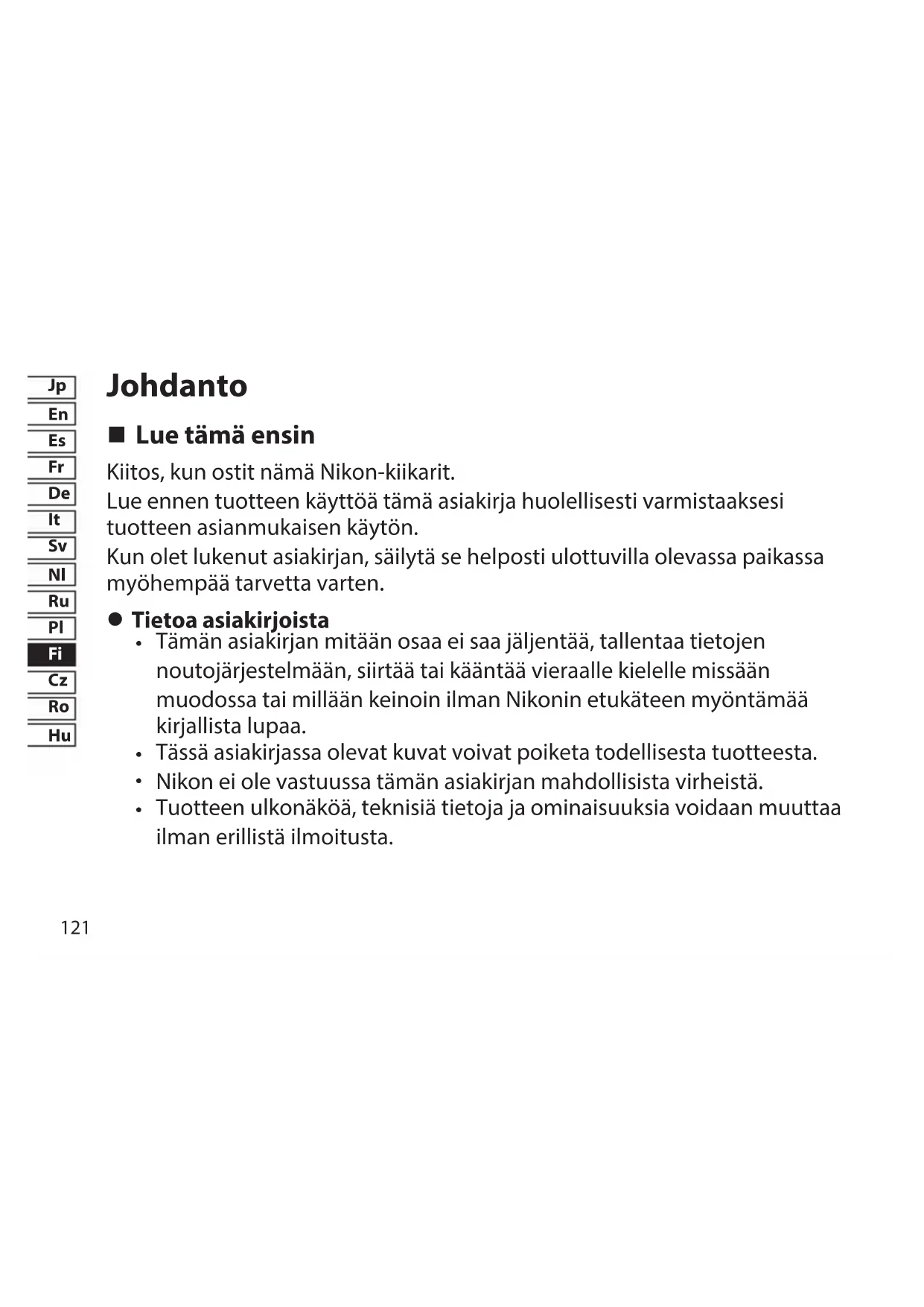 Lue tämä ensin Kiitos, kun ostit nämä Nikon-kiikarit. Lue ennen tuotteen käyttöä tämä asiakirja huolellisesti varmistaaksesi tuotteen asianmukaisen käytön. Kun olet lukenut asiakirjan, säilytä se helposti ulottuvilla olevassa paikassa myöhempää tarvetta varten.