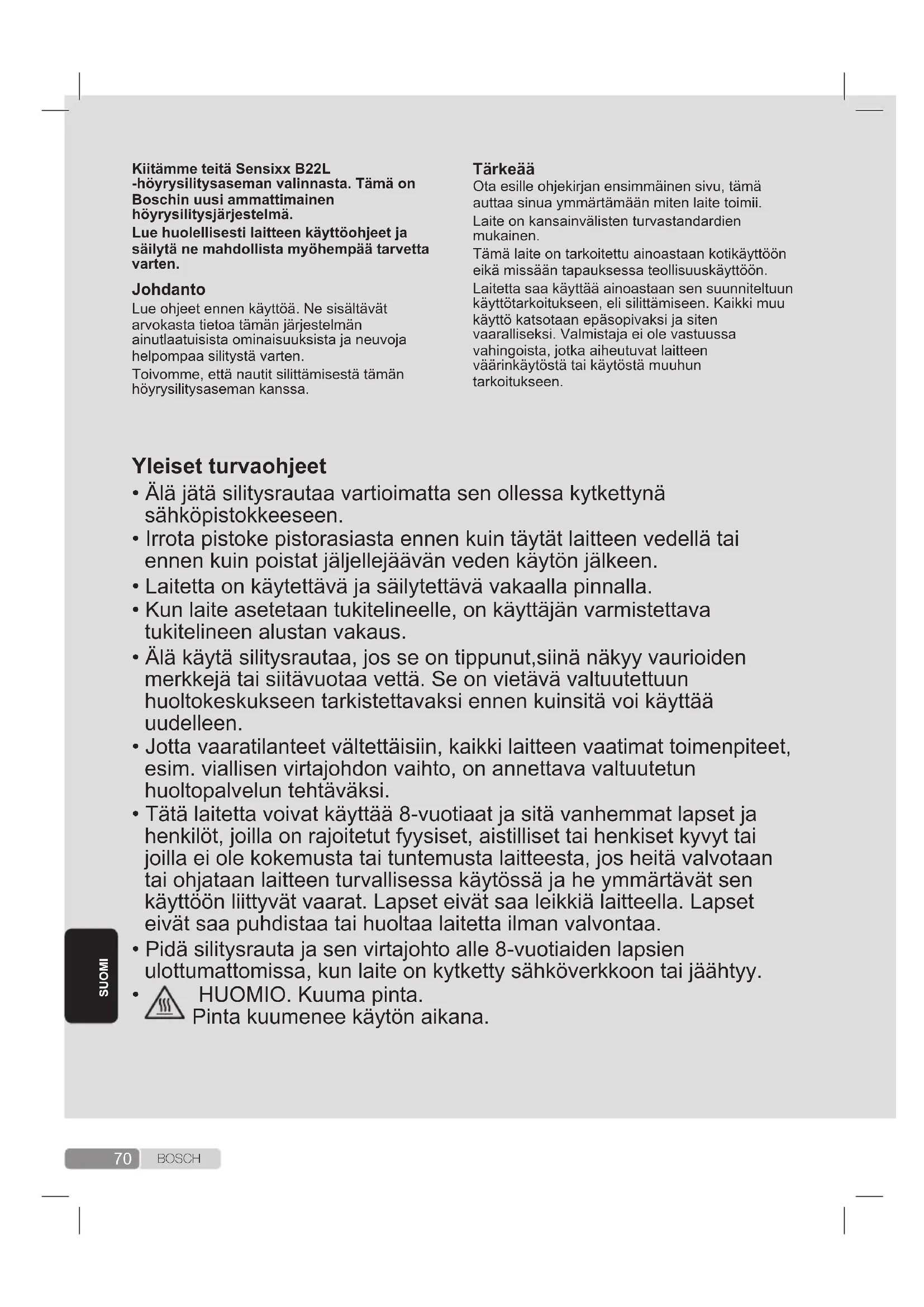 Laite tulee hyvin kuumaksi ja tuottaa höyryä käytön aikana, tämä saattaa aiheuttaa palohaavoja tai –vammoja, jos laitetta ei käytetä oikein. Höyryletku, perusasema, irrotettavan silitysalustan (2) pohjassa oleva metallilevy ja erityisesti silitysrauta voivat kuumentua käytön aikana. Tämä on normaalia. Älä ikinä kohdista höyryä ihmisiä tai eläimiä kohti. Älä anna johdon koskettaa silitysraudan mahdollisesti vielä kuumaa pohjaa. Huomaa, että järjestelmä voi jatkaa höyryn syöttöä lyhyen aikaa höyrytyspainikkeen vapauttamisen jälkeen. Tämä on täysin normaalia.71 B O S C H Ota esille ohjekirjan ensimmäinen sivu, tämä auttaa sinua ymmärtämään miten laite toimii.Laite on kansainvälisten turvastandardien mukainen.Tämä laite on tarkoitettu ainoastaan kotikäyttöön eikä missään tapauksessa teollisuuskäyttöön.Laitetta saa käyttää ainoastaan sen suunniteltuun käyttötarkoitukseen, eli silittämiseen. Kaikki muu käyttö katsotaan epäsopivaksi ja siten vaaralliseksi. Valmistaja ei ole vastuussa vahingoista, jotka aiheutuvat laitteen väärinkäytöstä tai käytöstä muuhun tarkoitukseen.