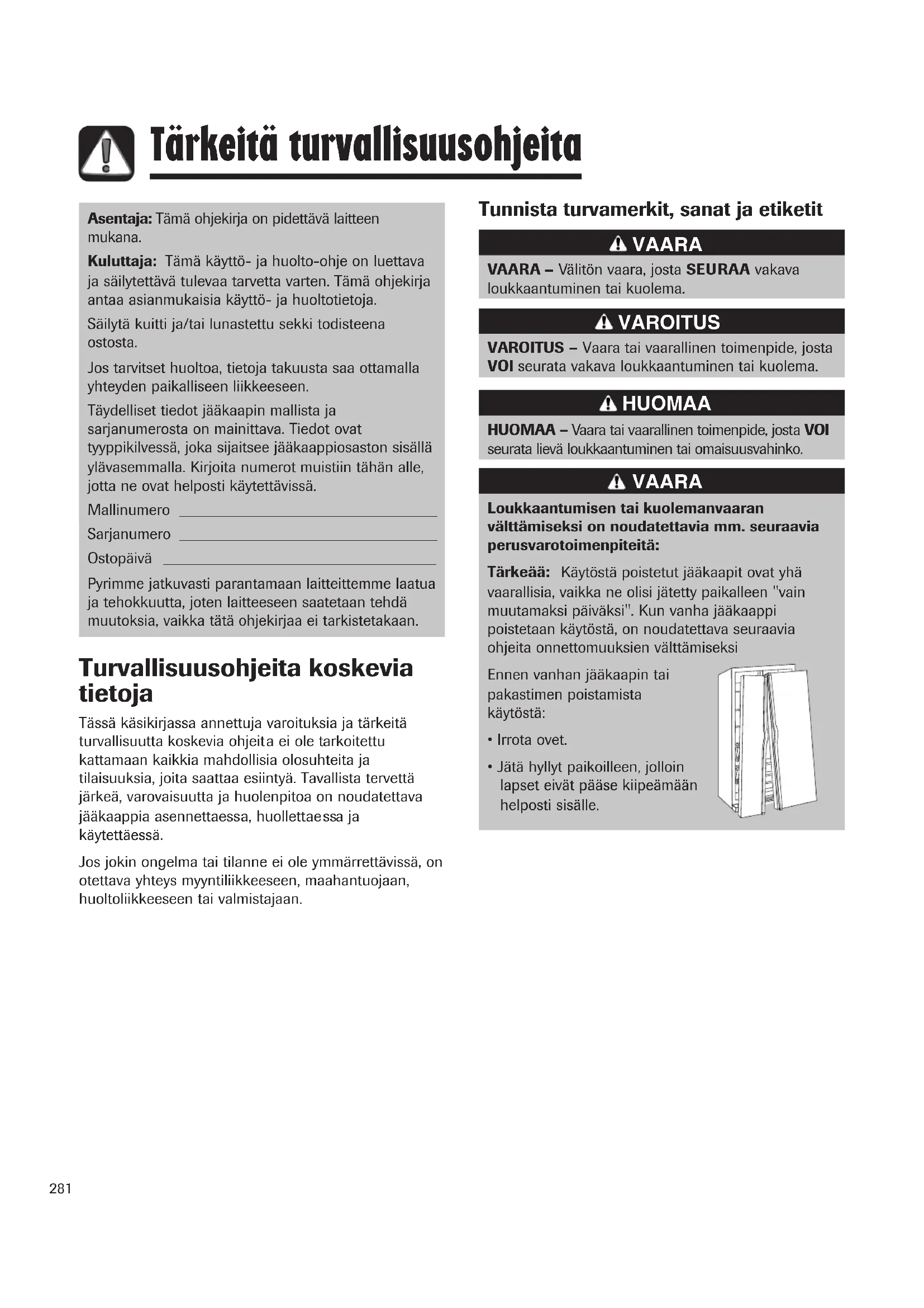 Tärkeitä turvallisuusohjeita VAROITUS – Vaara tai vaarallinen toimenpide, josta VOI seurata vakava loukkaantuminen tai kuolema. VAROITUS VAARA – Välitön vaara, josta SEURAA vakava loukkaantuminen tai kuolema. VAARA HUOMAA – Vaara tai vaarallinen toimenpide, josta VOI seurata lievä loukkaantuminen tai omaisuusvahinko. HUOMAA Turvallisuusohjeita koskevia tietoja Tässä käsikirjassa annettuja varoituksia ja tärkeitä turvallisuutt a koskevia ohjeit a ei ole t arkoitettu kattamaan kaikkia mahdollisia olosuhteita ja tilaisuuksia, joita saattaa esiintyä. Tavallista tervettä järkeä, varovaisuutta ja huolenpitoa on noudatettava jääkaappia asennett