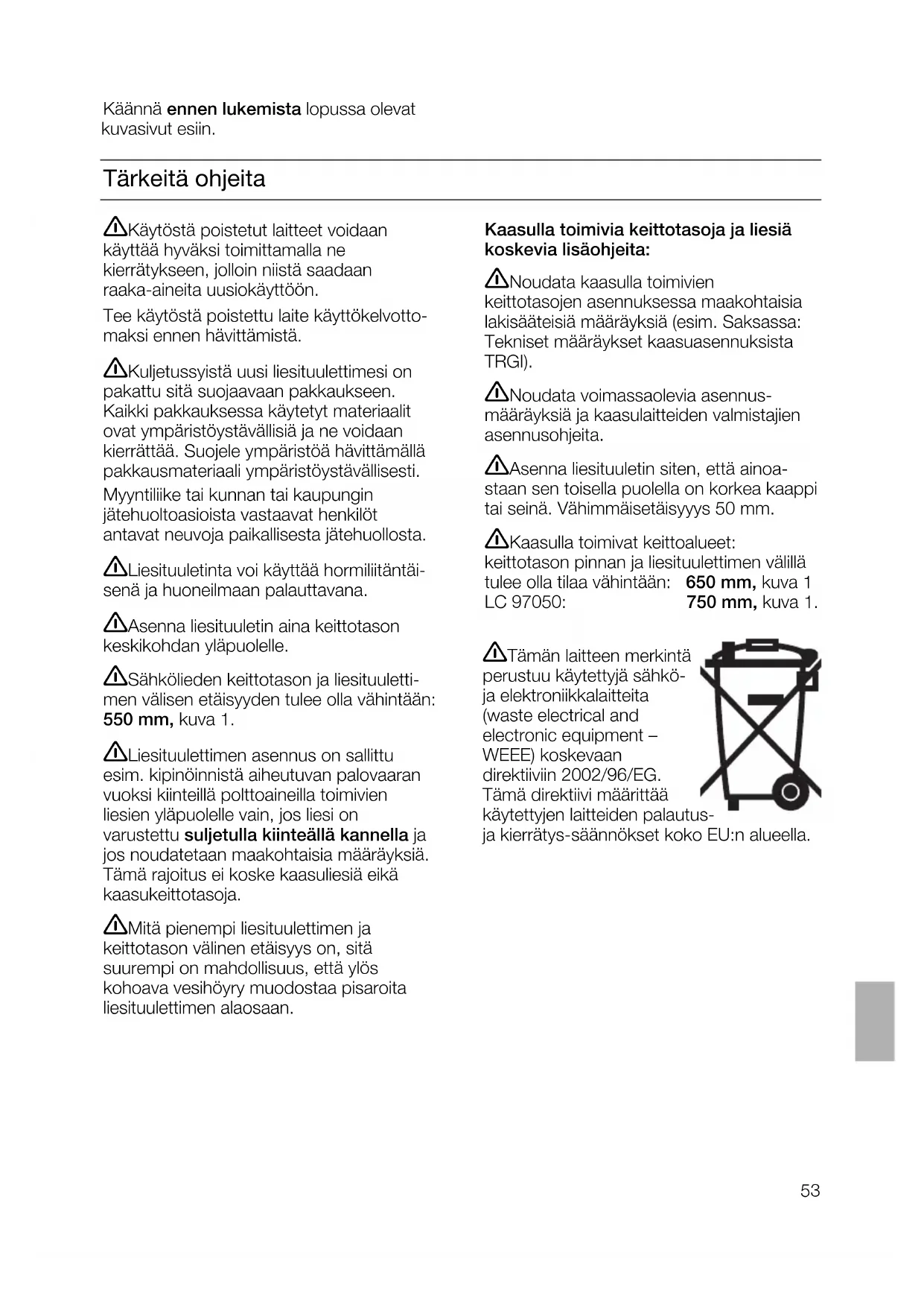 0 lyser trykkes tasten i tillegg inntil indikasjonen C eller ~ lyser. Deretter slippes tasten igjen. Avluftsdrift til resirkulasjonsdrift: ❑ Indikasjonen C slukkes etter kort tid. Den elektroniske styringen er innstilt på resirkulasjonsdrift. Resirkulasjonsdrift til avluftsdrift: ❑ Indikasjonen ~ slukkes etter kort tid. Den elektroniske styringen er innstilt på avluftsdrift.53 Tärkeitä ohjeita Kaasulla toimivia keittotasoja ja liesiä koskevia lisäohjeita: Noudata kaasulla toimivien keittotasojen asennuksessa maakohtaisia lakisääteisiä määräyksiä (esim. Saksassa: Tekniset määräykset kaasuasennuksista TRGI). Noudata voimassaolevia asennus- määräyksiä ja kaasulaitteiden valmistajien asennusohjeita. Asenna liesituuletin siten, että ainoa- staan sen toisella puolella on korkea kaappi tai seinä. Vähimmäisetäisyyys 50 mm. Kaasulla toimivat keittoalueet: keittotason pinnan ja liesituulettimen välillä tulee olla tilaa vähintään: 650 mm, kuva 1 LC 97050: 750 mm, kuva 1. Käytöstä poistetut laitteet voidaan käyttää hyväksi toimittamalla ne kierrätykseen, jolloin niistä saadaan raaka-aineita uusiokäyttöön. Tee käytöstä poistettu laite käyttökelvotto- maksi ennen hävittämistä. Kuljetussyistä uusi liesituulettimesi on pakattu sitä suojaavaan pakkaukseen. Kaikki pakkauksessa käytetyt materiaalit ovat ympäristöystävällisiä ja ne voidaan kierrättää. Suojele ympäristöä hävittämällä pakkausmateriaali ympäristöystävällisesti. Myyntiliike tai kunnan tai kaupungin jätehuoltoasioista vastaavat henkilöt antavat neuvoja paikallisesta jätehuollosta. Liesituuletinta voi käyttää hormiliitäntäi- senä ja huoneilmaan palauttavana. Asenna liesituuletin aina keittotason keskikohdan yläpuolelle. Sähkölieden keittotason ja liesituuletti- men välisen etäisyyden tulee olla vähintään: 550 mm, kuva 1. Liesituulettimen asennus on sallittu esim. kipinöinnistä aiheutuvan palovaaran vuoksi kiinteillä polttoaineilla toimivien liesien yläpuolelle vain, jos liesi on varustettu suljetulla kiinteällä kannella ja jos noudatetaan maakohtaisia määräyksiä. Tämä rajoitus ei koske kaasuliesiä eikä kaasukeittotasoja. Mitä pienempi liesituulettimen ja keittotason välinen etäisyys on, sitä suurempi on mahdollisuus, että ylös kohoava vesihöyry muodostaa pisaroita liesituulettimen alaosaan. Käännä ennen lukemista lopussa olevat kuvasivut esiin. Tämän laitteen merkintä perustuu käytettyjä sähkö- ja elektroniikkalaitteita (waste electrical and electronic equipment – WEEE) koskevaan direktiiviin 2002/96/EG. Tämä direktiivi määrittää käytettyjen laitteiden palautus- ja kierrätys-säännökset koko EU:n alueella.54 Ennen asennusta Toiminta hormiliitäntäisenä kuva 2 Poistoilma johdetaan ylös ilmanvaihto- hormin kautta.